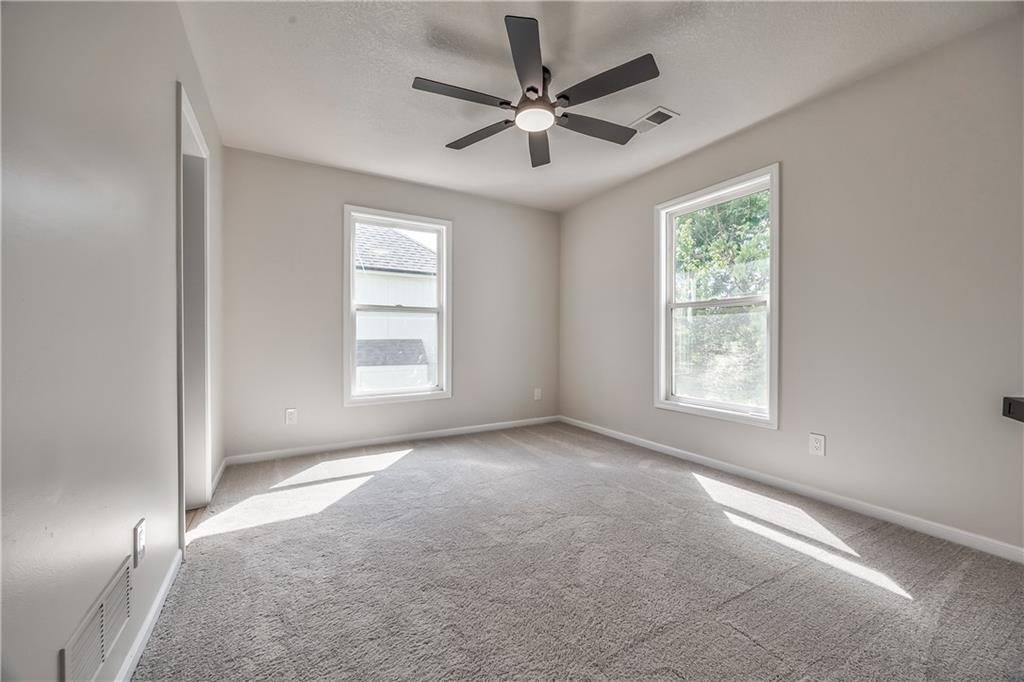 Carpeted room featuring a ceiling fan with integrated lighting, two windows with white trim, and light-colored wall paint