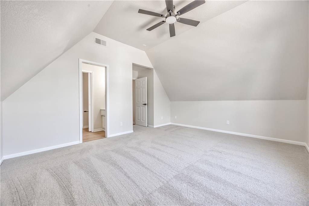 Spacious room featuring vaulted ceilings, light gray carpet flooring, and a contemporary ceiling fan with dark blades