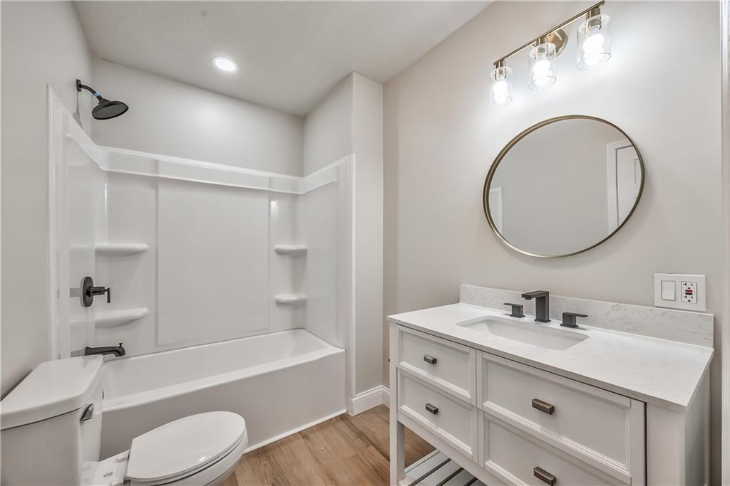 Expansive lower-level space featuring wood-finish flooring, recessed lighting, and a neutral color palette