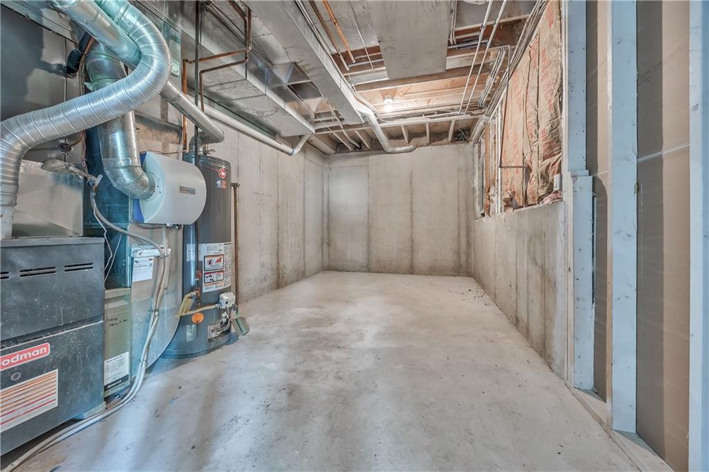 Unfinished basement featuring concrete walls and flooring, exposed ceiling joists, and visible utility systems