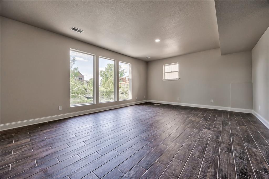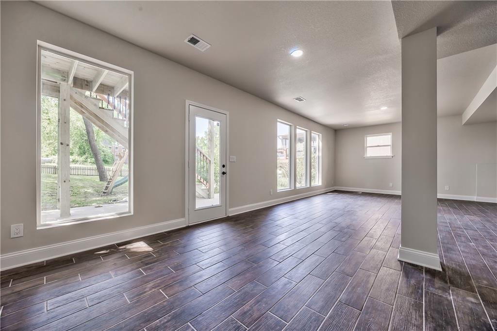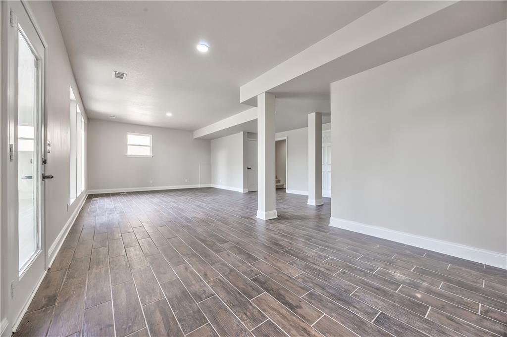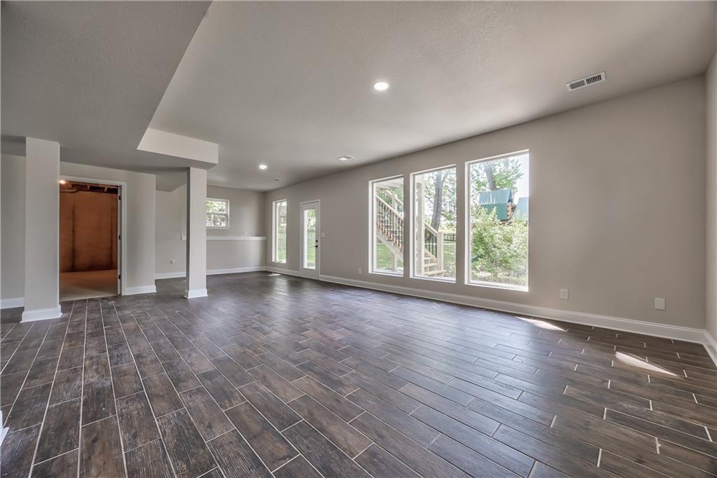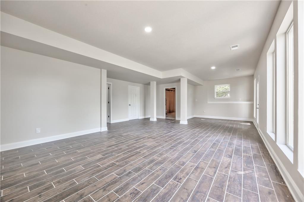 Expansive lower-level space featuring wood-finish tile flooring, recessed lighting, and multiple windows