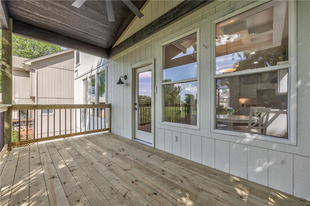 Covered outdoor deck with natural wood flooring and a black railing system