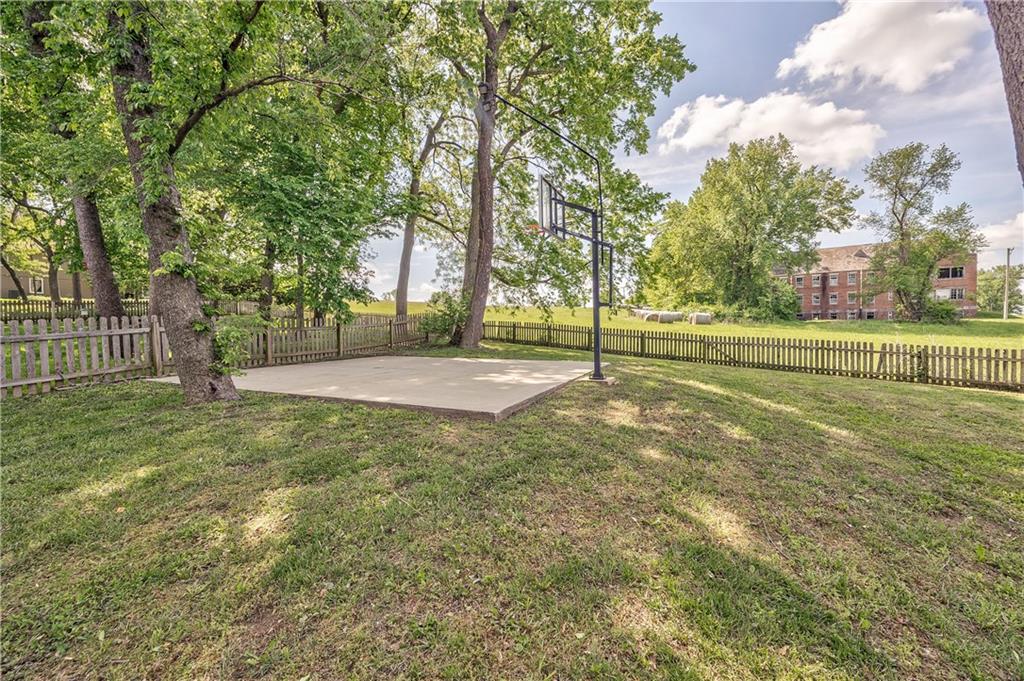 Expansive fenced backyard featuring a concrete sport court with an installed basketball hoop