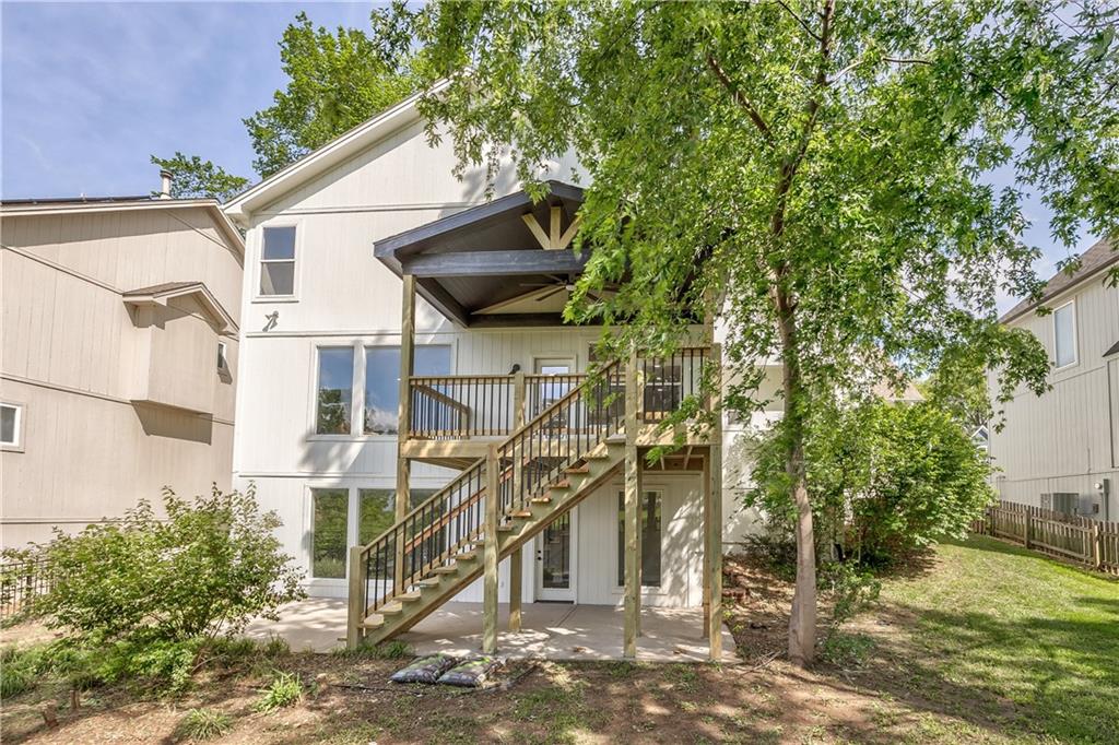Rear exterior featuring a two-story deck with dark railings, a covered portion with exposed wood beams, and a concrete patio below