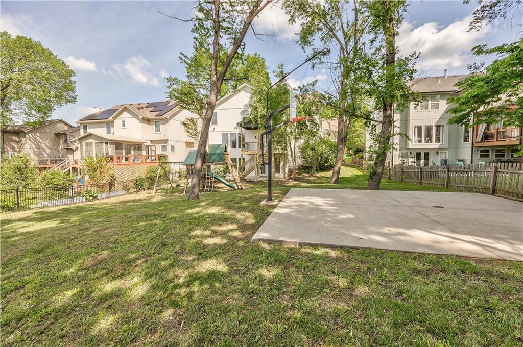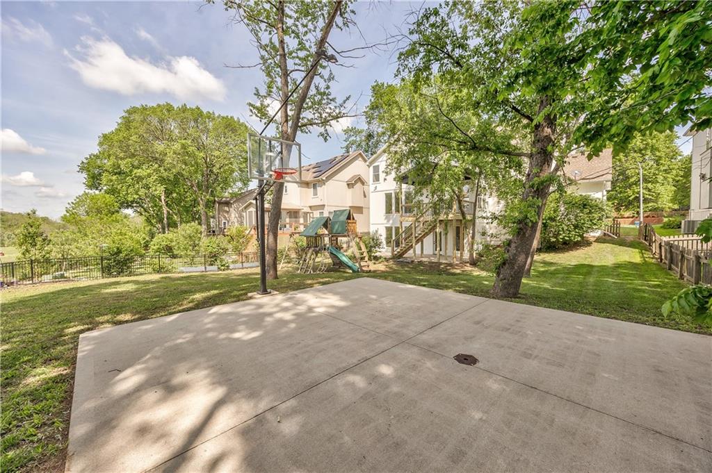 Expansive backyard featuring a concrete sport court with a basketball hoop, mature trees, and a wooden playset