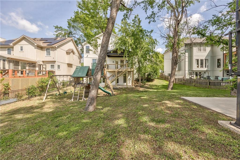 Expansive grassy backyard featuring mature trees, a playset with swings and a slide, a two-story back deck, a concrete patio, and a black metal fence bordering a water feature