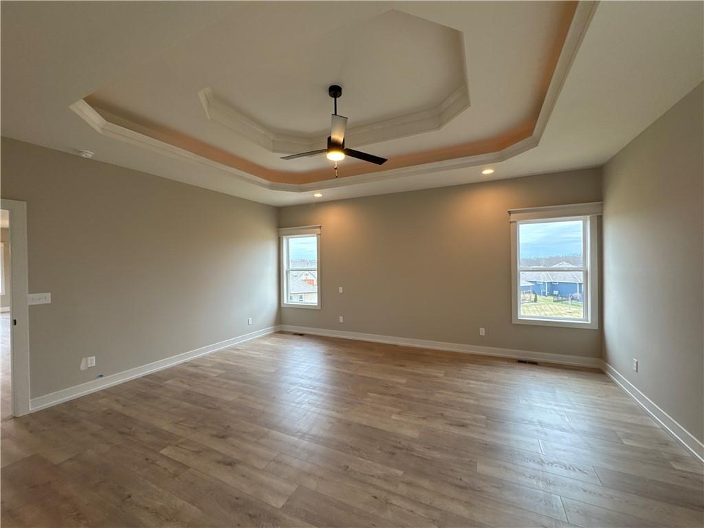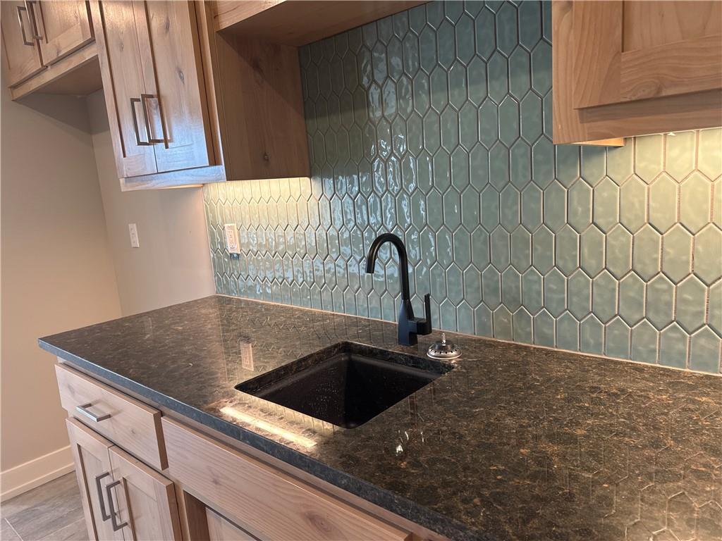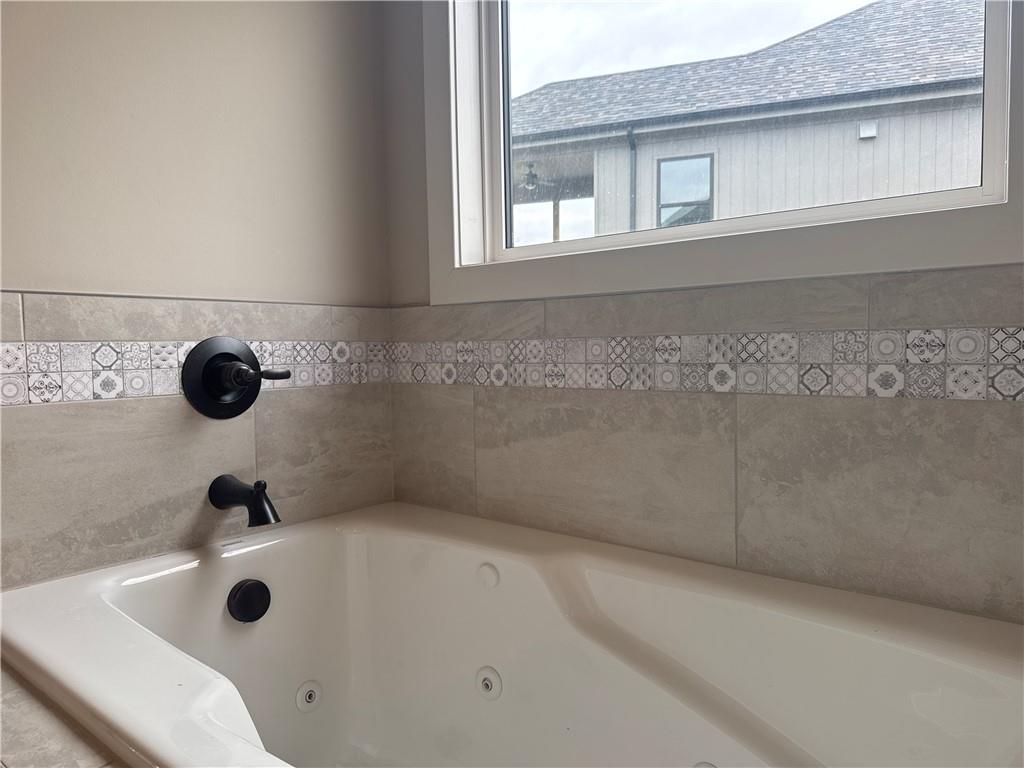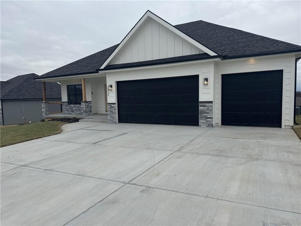 "The Ashton II," an exquisite reverse 1.5 story residence with an extra large granite island, corner stone fireplace, private mud room, walkthrough master closet, jacuzzi tub in master, master shower with granite seat, dual quartz vanity in main, lot close to an acres, composite covered deck, extra large concrete pad in back, walkout basement, 2 full bathrooms in basement, HE furnace, blown in insulation. Laundry on main level. Wood floors through main floor primary bedroom. Walk in pantry. Wet bar in the walkout basement with room for a full size fridge. One bedroom in the basement has an en-suite bathroom. Complete with front porch and in ground sprinkler system. All square footage is approximate. This home is complete and move-in-ready!
