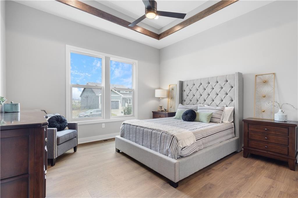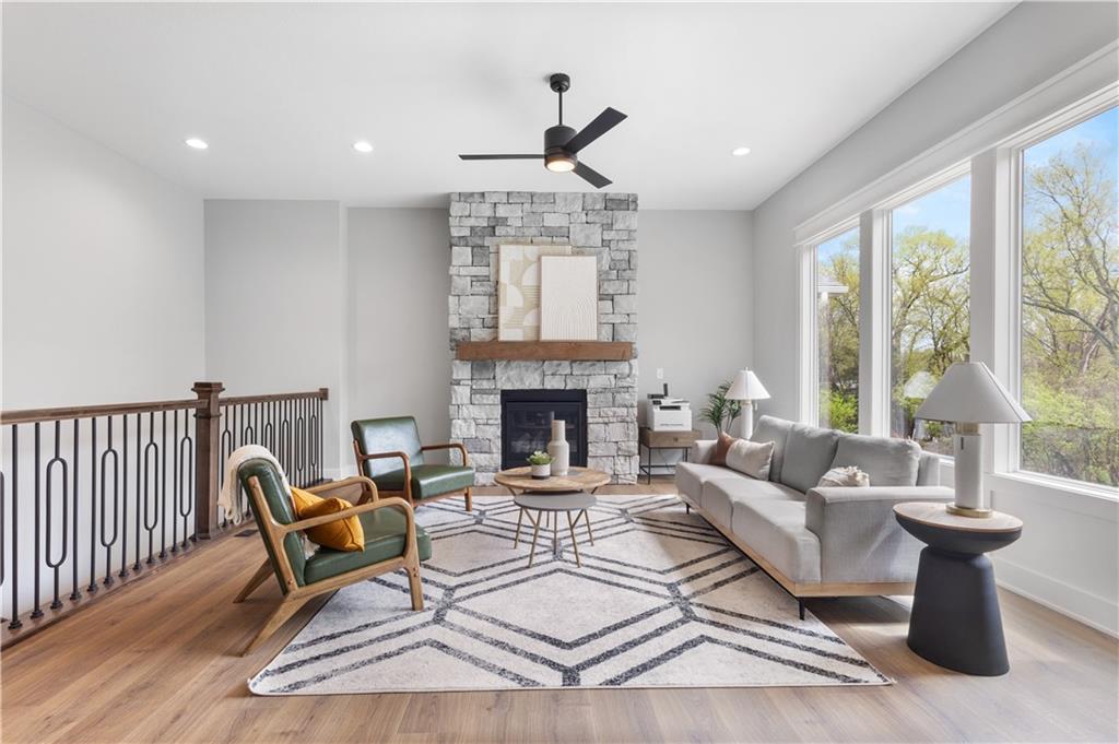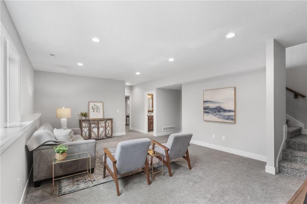 Back on Market, NO fault of Seller. This home is Move in Ready and priced well below reproduction! Hard to find Reverse 1.5 Story under $500k AND situated on a daylight lot backing to trees. Better Hurry!! NO BACKYARD NEIGHBORS. The gorgeous Danbury floorplan by Inspired Homes is a MUST SEE. Affordable, high quality main floor living at its finest featuring 10ft ceilings throughout main floor, a wide-open living area that overlooks your large, covered deck with stairs to a lower patio! Kitchen features custom cabinetry, walk-in corner pantry, extended kitchen island, upgraded appliances and quartz & granite countertops! Main floor primary bedroom/bathroom suite has trayed ceiling, spacious shower and large walk-in closet. Owner's entry features custom, built-in desk and boot bench. Main floor laundry located right off the owner's entry. Your finished lower level includes 2 large bedrooms, plus full bathroom, spacious rec room and large unfinished space perfect for storage. Extended garage bays give you ample space for cars plus more. This home is situated in the quiet, picturesque neighborhood of Kensington Farm, surrounded by mature trees, in Cass County with a Lee's Summit address. Plenty of designer features to enjoy including large custom windows that flood the home with natural light, custom cabinetry, popular “Rev Wood” flooring, GE appliances with gas range, tiled shower in Master bath and mud room/boot bench area with built-in desk. Irrigation system + garage door openers included!