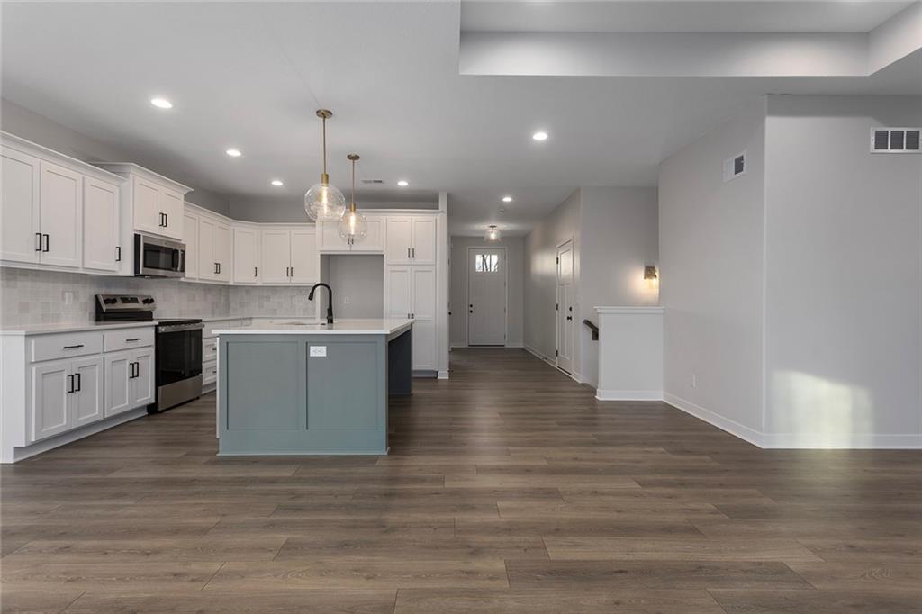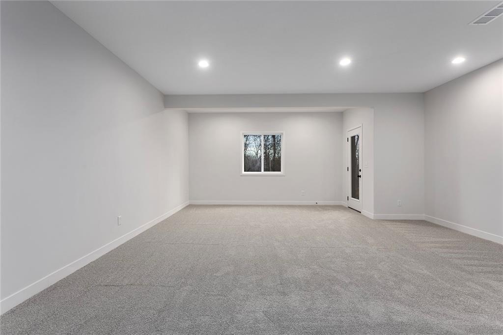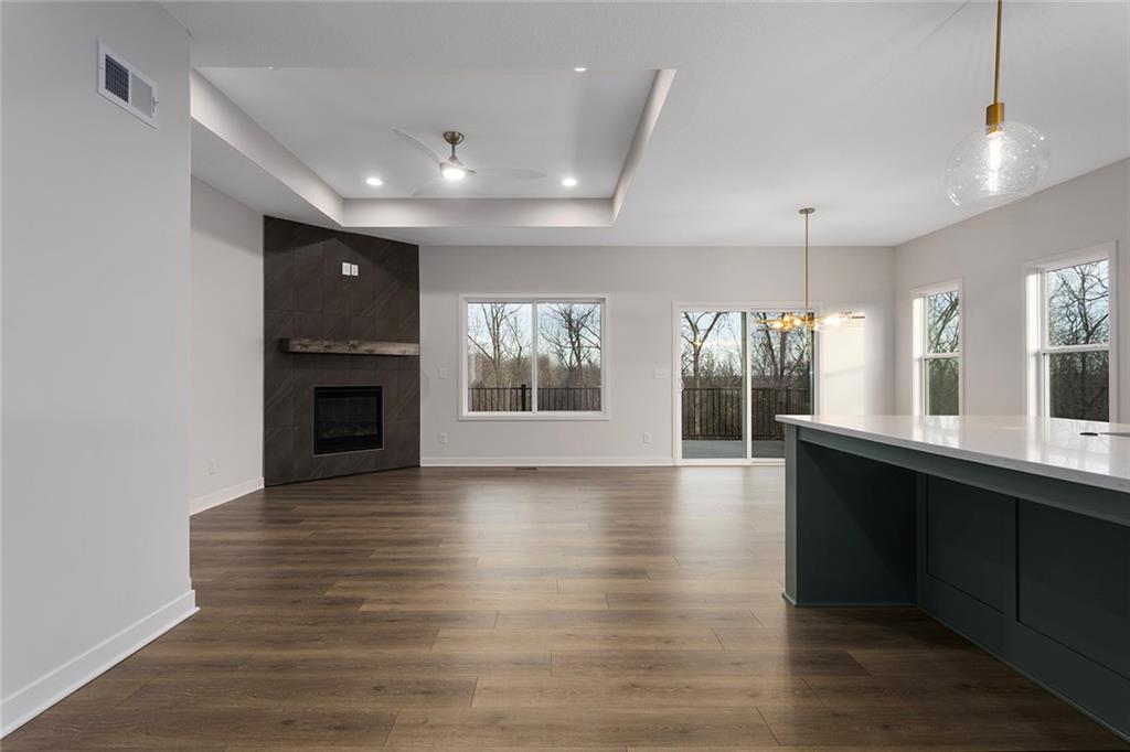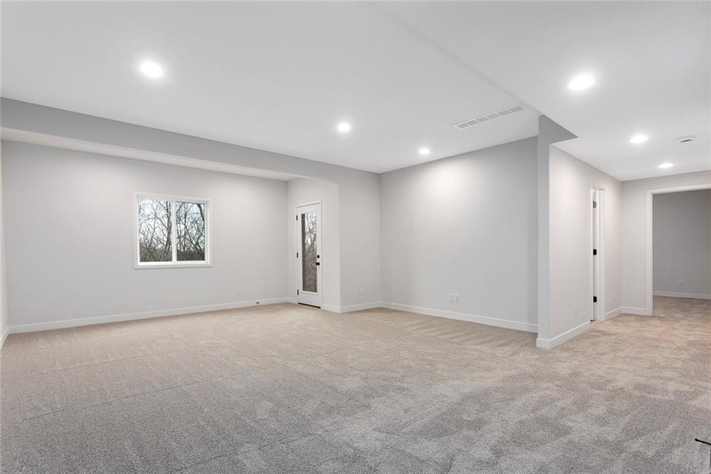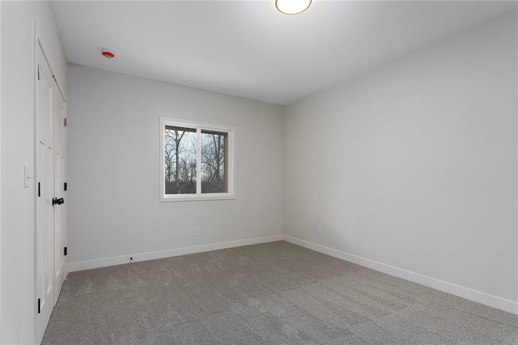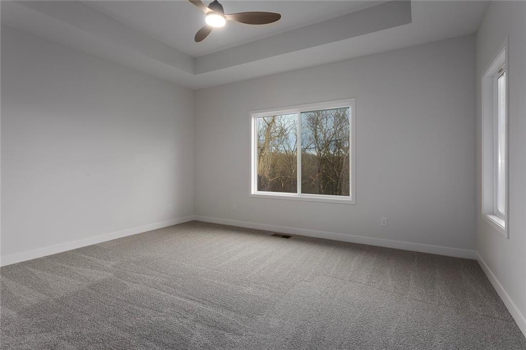 Step into The Bradford, a beautifully designed reverse ranch by award-winning builder Regency Homes. This crisp and clean lines crafted home offers effortless main-floor living, featuring two spacious bedrooms on the main level and a third bedroom, full bath, and expansive rec room in the fully finished lower level. The open-concept kitchen impresses with Carrara Marmi Quartz countertops in both the kitchen and baths, paired with a striking Serena White 3x8 vertically stacked backsplash for a refined, modern aesthetic. The kitchen island, stained in Evergreen Fog, adds an organic touch that harmonizes perfectly with the treed backyard views. Main-floor laundry brings ease to everyday living, while the lower level provides 925 square feet of additional living space—ideal for entertaining, guests, or a quiet getaway.