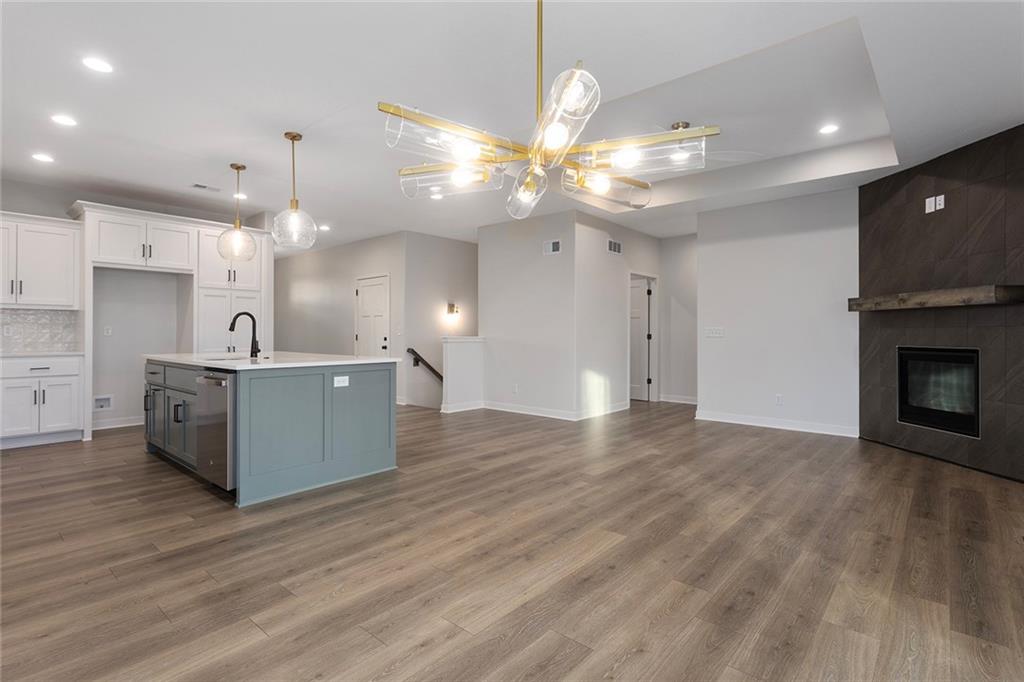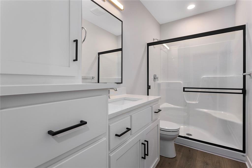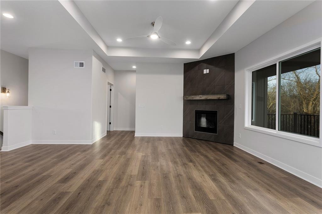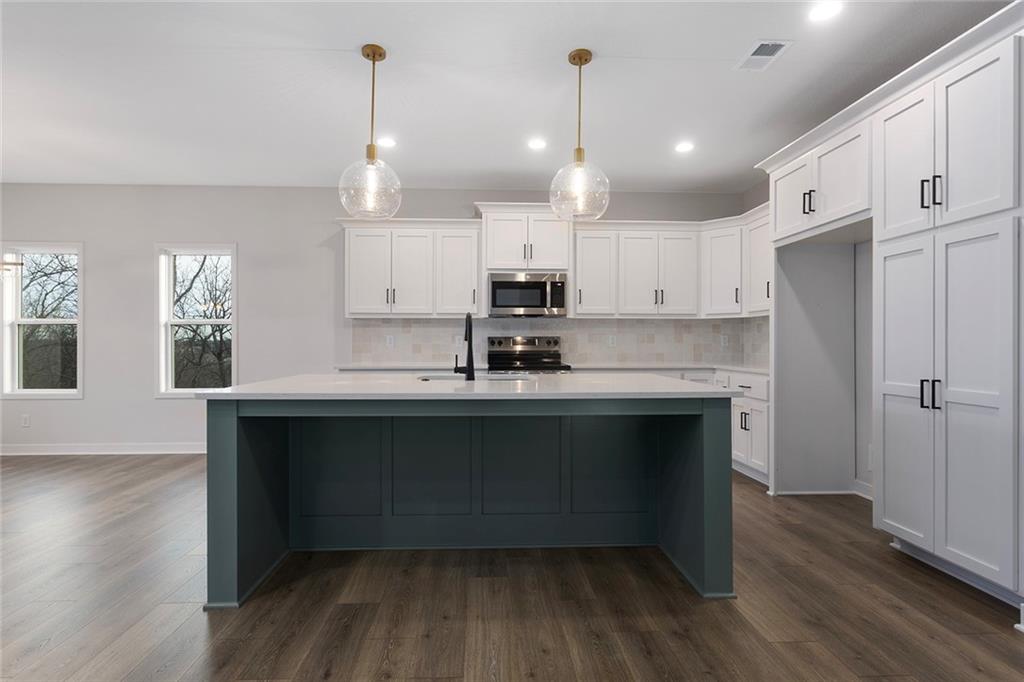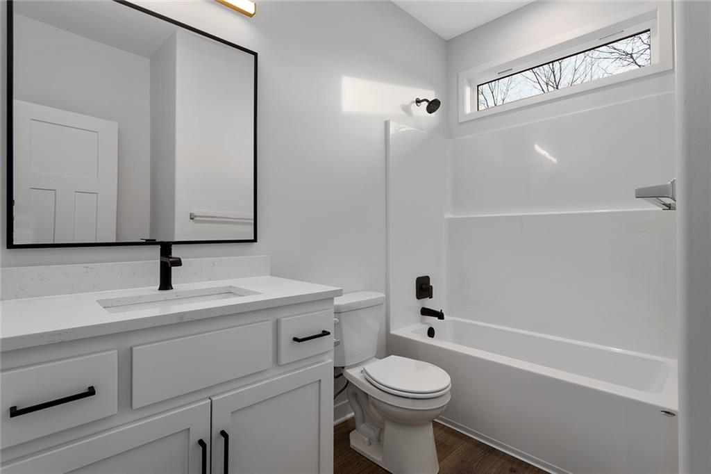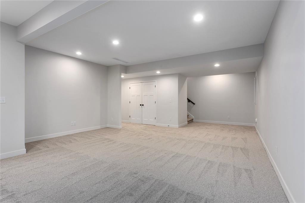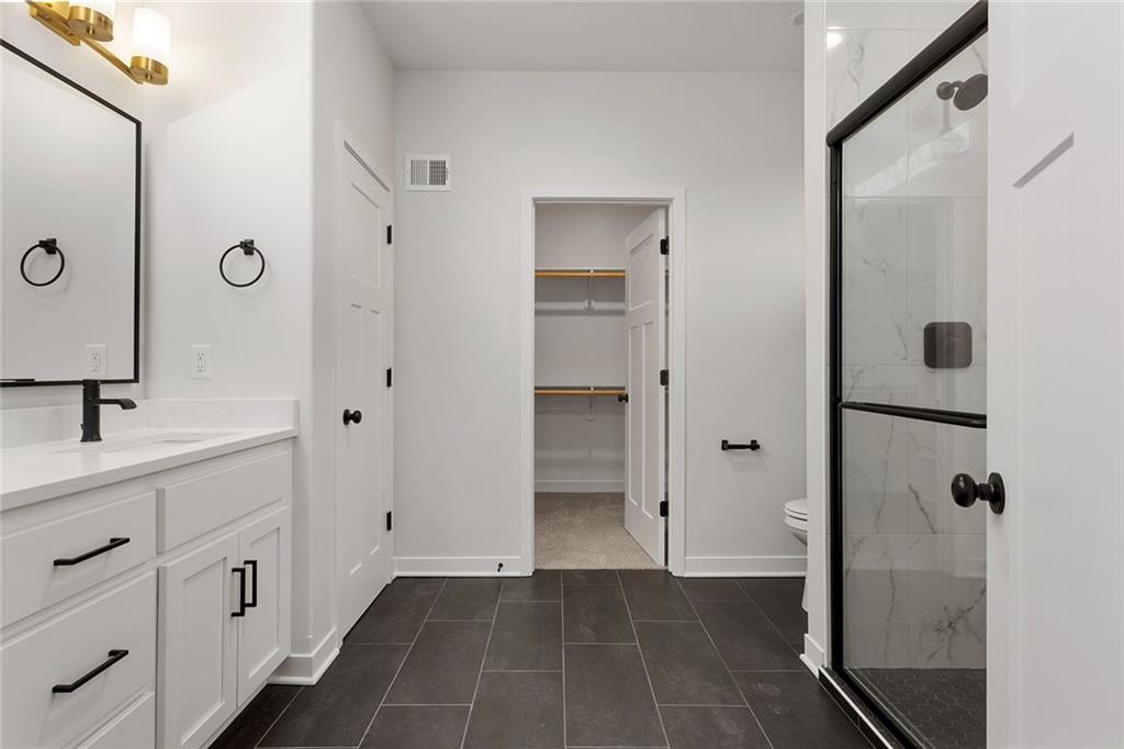 Step into The Bradford, a beautifully designed reverse ranch by award-winning builder Regency Homes. This crisp and clean lines crafted home offers effortless main-floor living, featuring two spacious bedrooms on the main level and a third bedroom, full bath, and expansive rec room in the fully finished lower level. The open-concept kitchen impresses with Carrara Marmi Quartz countertops in both the kitchen and baths, paired with a striking Serena White 3x8 vertically stacked backsplash for a refined, modern aesthetic. The kitchen island, stained in Evergreen Fog, adds an organic touch that harmonizes perfectly with the treed backyard views. Main-floor laundry brings ease to everyday living, while the lower level provides 925 square feet of additional living space—ideal for entertaining, guests, or a quiet getaway.