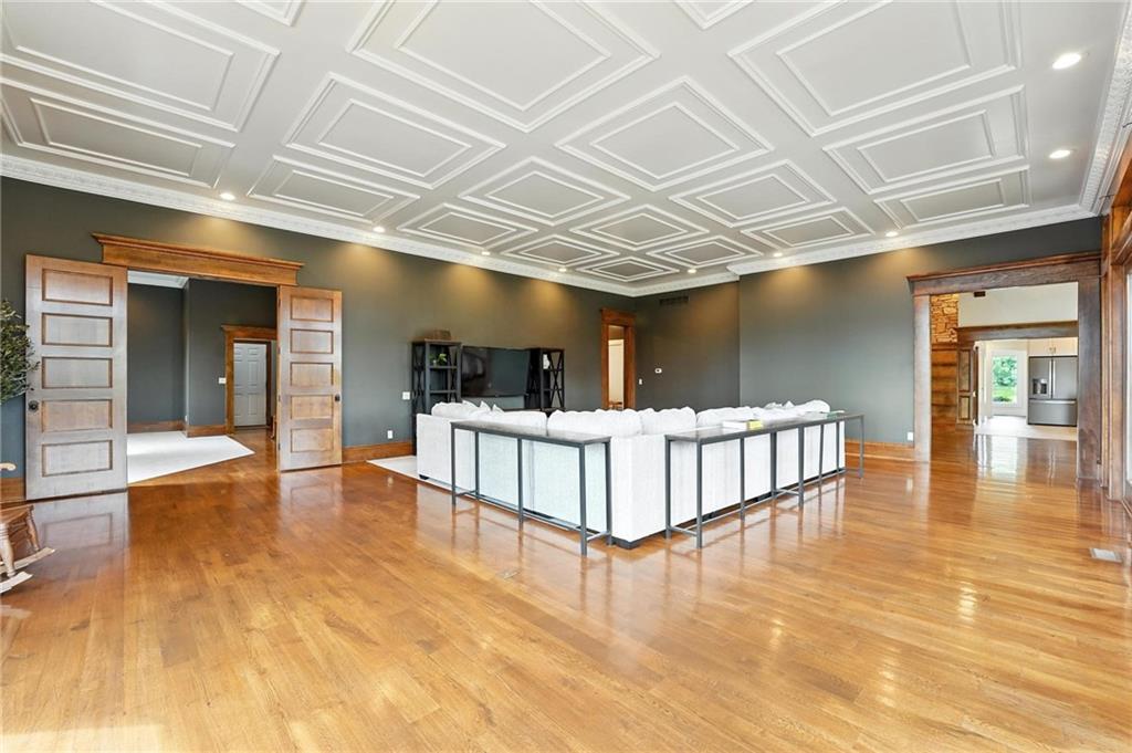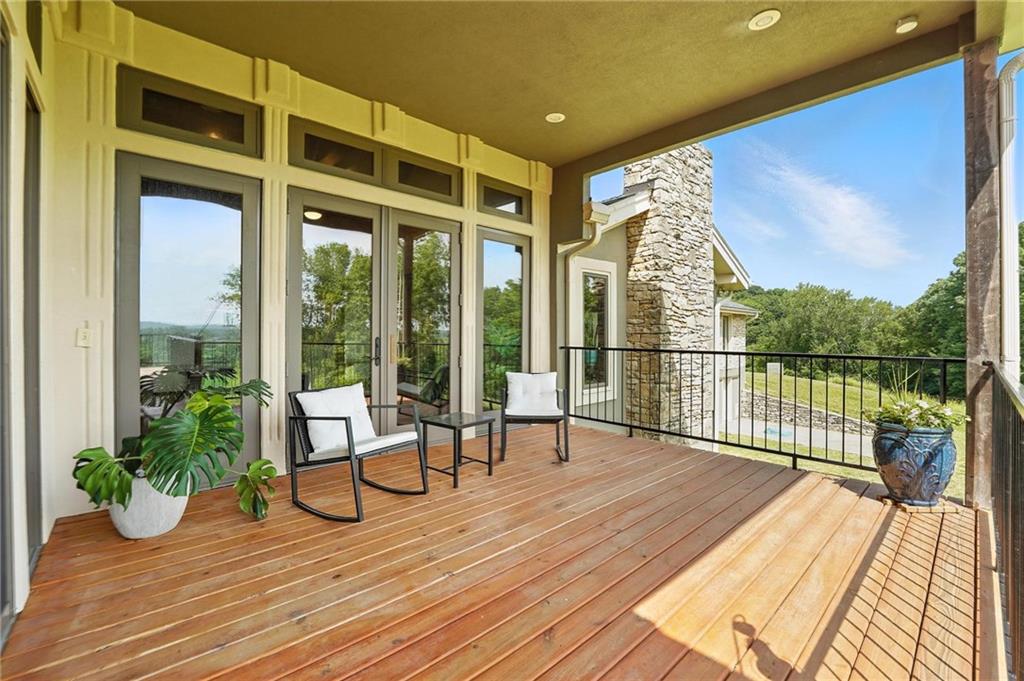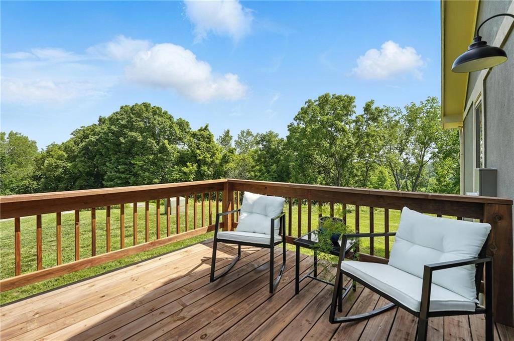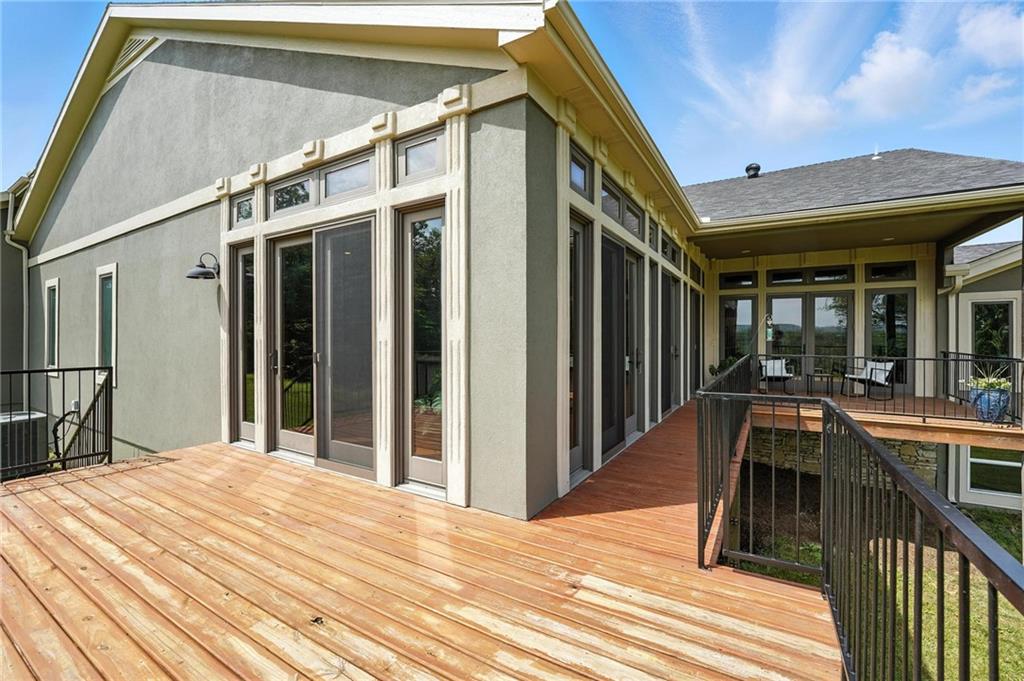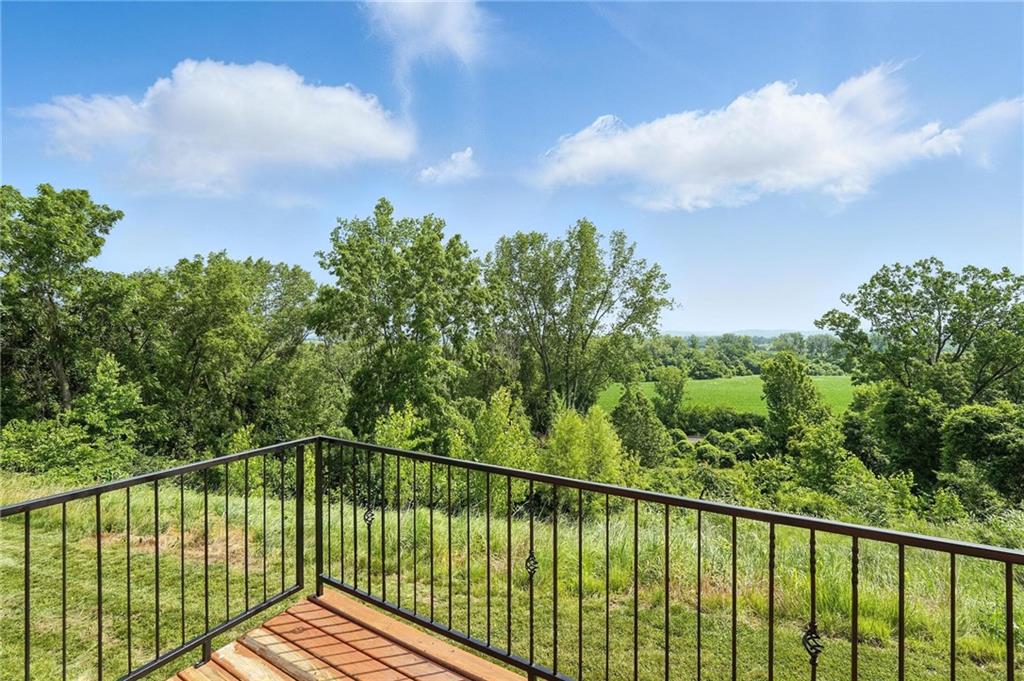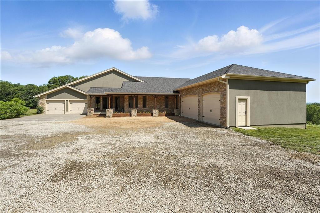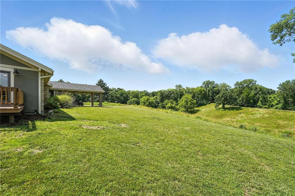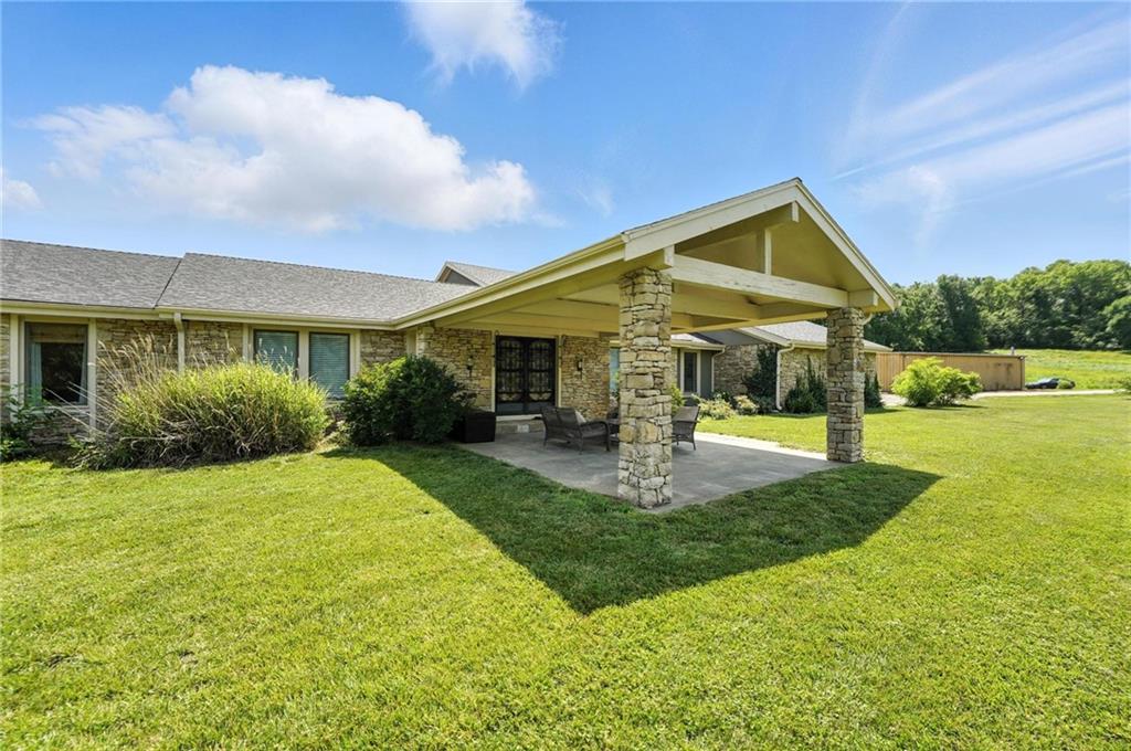 This incredible home blends architectural character with modern updates across a spacious layout full of thoughtful details. A stunning stone fireplace anchors the vaulted dining room with exposed beams and warm wood ceilings, creating a dramatic and inviting space. The updated kitchen features quartz countertops, a gas range, oversized island, and stylish pendant lighting, all open to the main living areas for seamless flow. The living room is a showstopper with a coffered ceiling, wood floors, and large windows that frame peaceful views. Multiple living and family rooms offer flexibility for everyday life and entertaining, with each space offering its own charm. The primary suite includes a large walk-in closet and luxurious bath with dual vanities and a walk-in tile shower. Additional bedrooms offer generous space with walk-in closets and ceiling fans. Situated on 50 acres in Leavenworth County and the Lansing School District, this property includes a separate guest home, pond, a 50-foot Butler building with electricity, water, and a bathroom, and land teeming with wildlife including deer, turkey, and bald eagles. The expansive deck offers sweeping views over the Missouri River valley, creating the perfect backdrop for relaxing or hosting. Updates throughout include a 2021 remodel, new roof (2024), HVAC (2024), tankless water heater (2022), fresh exterior paint, and more. This home offers timeless craftsmanship, thoughtful upgrades, and unbeatable space inside and out.