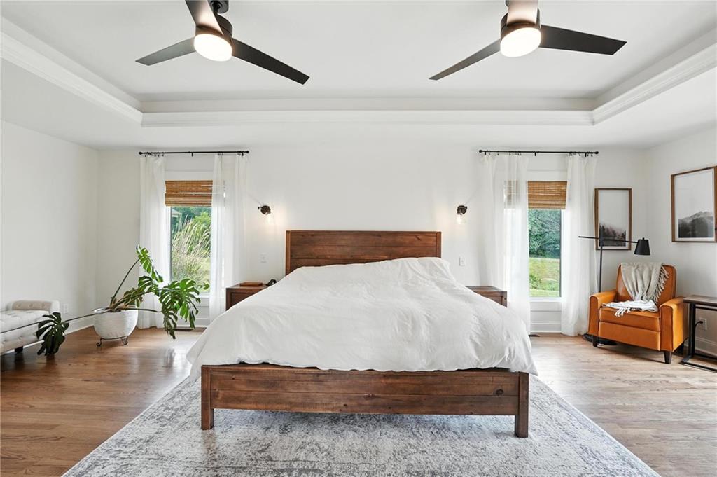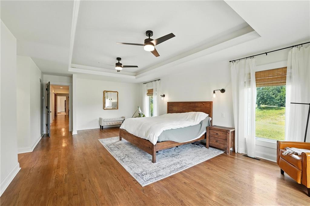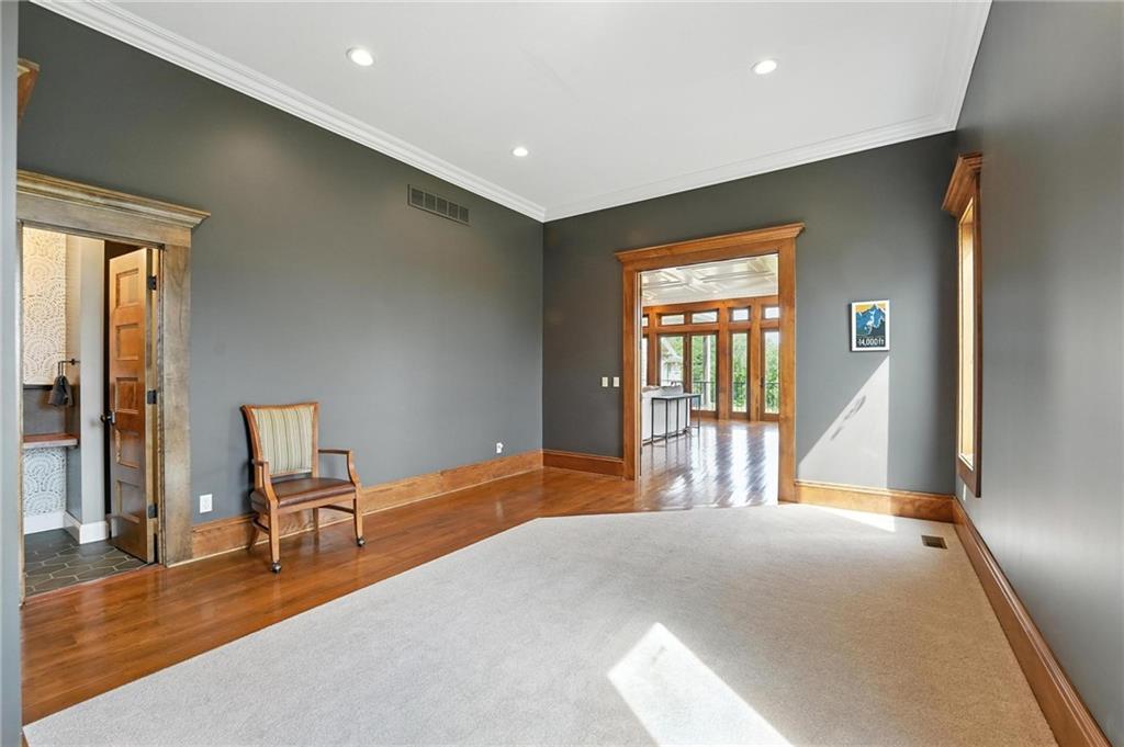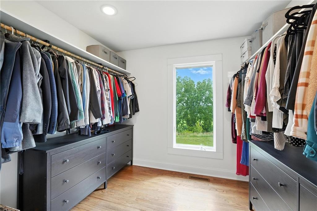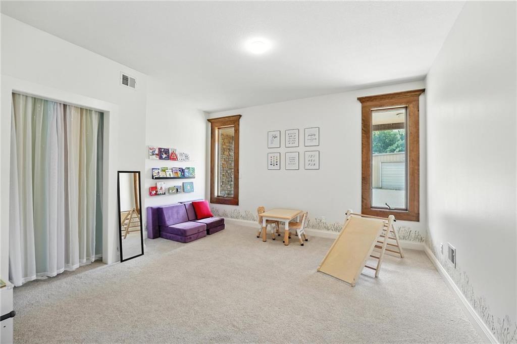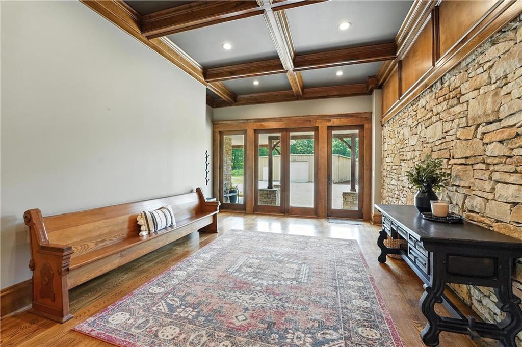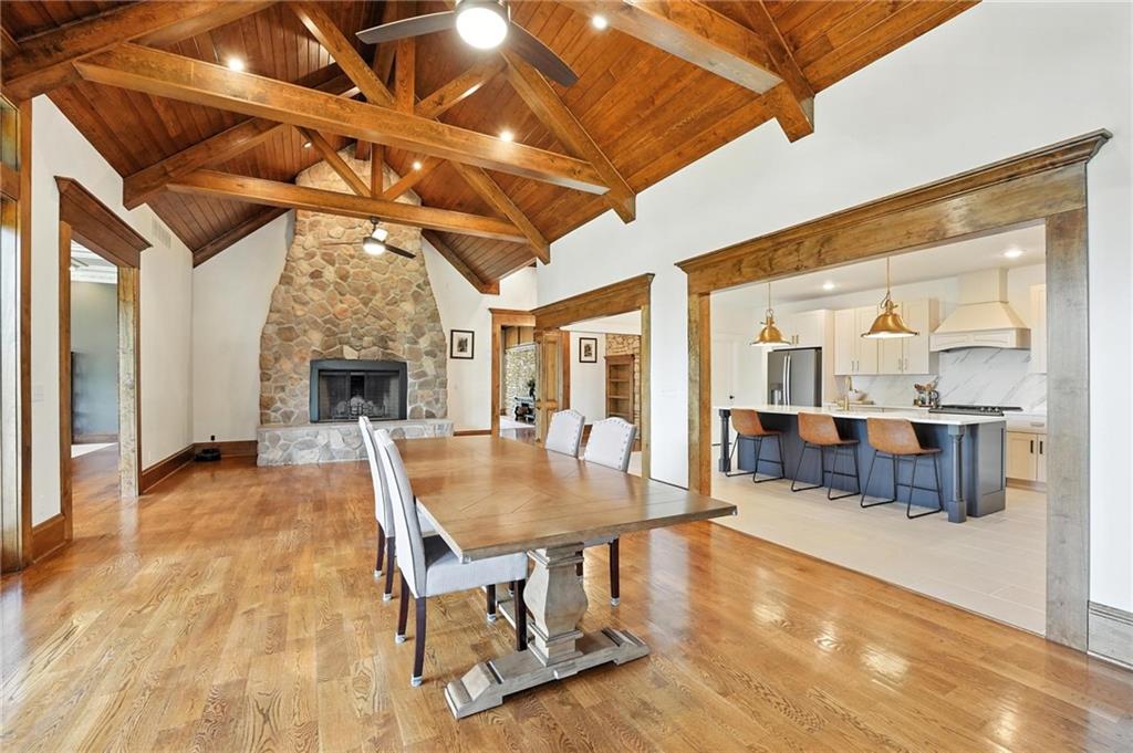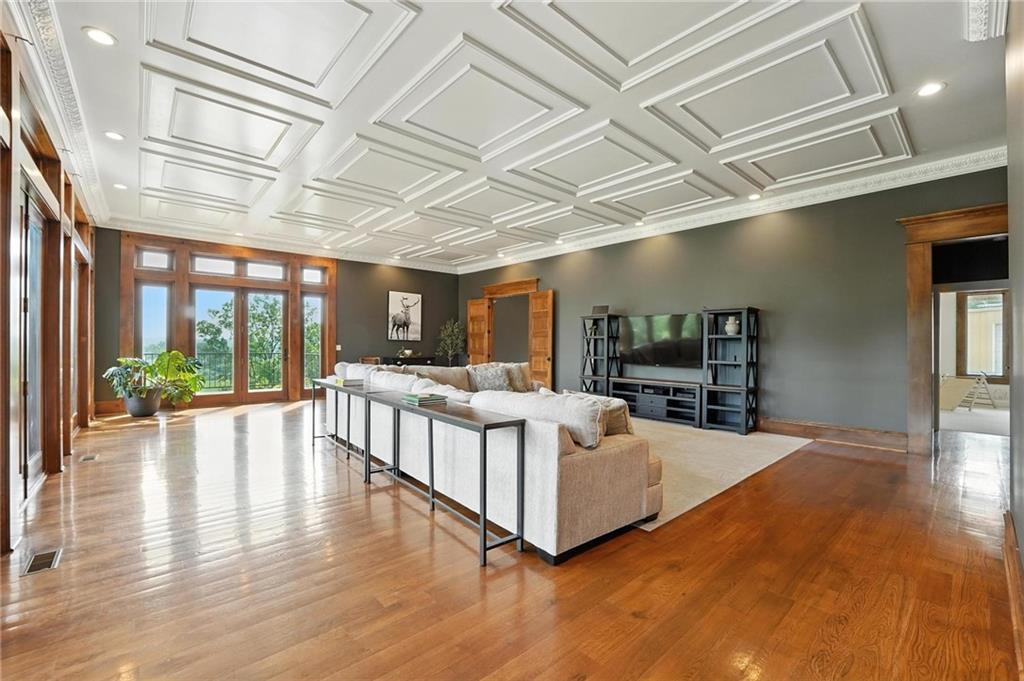 This incredible home blends architectural character with modern updates across a spacious layout full of thoughtful details. A stunning stone fireplace anchors the vaulted dining room with exposed beams and warm wood ceilings, creating a dramatic and inviting space. The updated kitchen features quartz countertops, a gas range, oversized island, and stylish pendant lighting, all open to the main living areas for seamless flow. The living room is a showstopper with a coffered ceiling, wood floors, and large windows that frame peaceful views. Multiple living and family rooms offer flexibility for everyday life and entertaining, with each space offering its own charm. The primary suite includes a large walk-in closet and luxurious bath with dual vanities and a walk-in tile shower. Additional bedrooms offer generous space with walk-in closets and ceiling fans. Situated on 50 acres in Leavenworth County and the Lansing School District, this property includes a separate guest home, pond, a 50-foot Butler building with electricity, water, and a bathroom, and land teeming with wildlife including deer, turkey, and bald eagles. The expansive deck offers sweeping views over the Missouri River valley, creating the perfect backdrop for relaxing or hosting. Updates throughout include a 2021 remodel, new roof (2024), HVAC (2024), tankless water heater (2022), fresh exterior paint, and more. This home offers timeless craftsmanship, thoughtful upgrades, and unbeatable space inside and out.