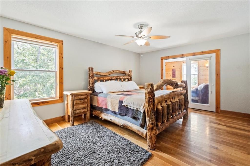 Dreaming of a lake get away? Welcome to this beautifully maintained 2-bedroom, 2-bath cedar log-sided home on approximately 8 acres, nestled on a serene lot that backs up to core land of Truman Lake. Whether you’re looking for a weekend getaway, full-time retreat, or lake lover’s dream, this property offers the perfect blend of privacy, comfort, and functionality. Selling fully furnished - as turn-key as they come, step inside and you’ll be greeted by cedar walls, gleaming hardwood floors, and a stunning stone wooden fireplace. The updated kitchen is both stylish and functional, featuring double ovens, gas stove, granite countertops, custom cabinets, tile backsplash, and newer stainless steel appliances. Laundry is located on the main level. Both bedrooms are generously sized with large closets and updated bathrooms that include tiled flooring and spacious walk-in showers. One bedroom offers direct access to the back deck, perfect for enjoying your morning coffee with a view. Enjoy outdoor living with a covered front porch and a large covered back deck overlooking peaceful woods and wildlife. The basement offers the potential for additional living space or ample storage for lake gear, ATVs, or hobbies. The property includes a 30x40 Quonset outbuilding with concrete floors and electricity, plus multiple pole barns, ideal for storing boats, equipment, or working on your next project. The pole barn directly behind the outbuilding has electricity running to it as well. Property is own it's own private well. Find mature Hickory, Oak, and Cherry trees throughout the timber. Located minutes away from restaurants, boat rentals, motels, RV parks, marina/boat slips, and more! This property is a must see!