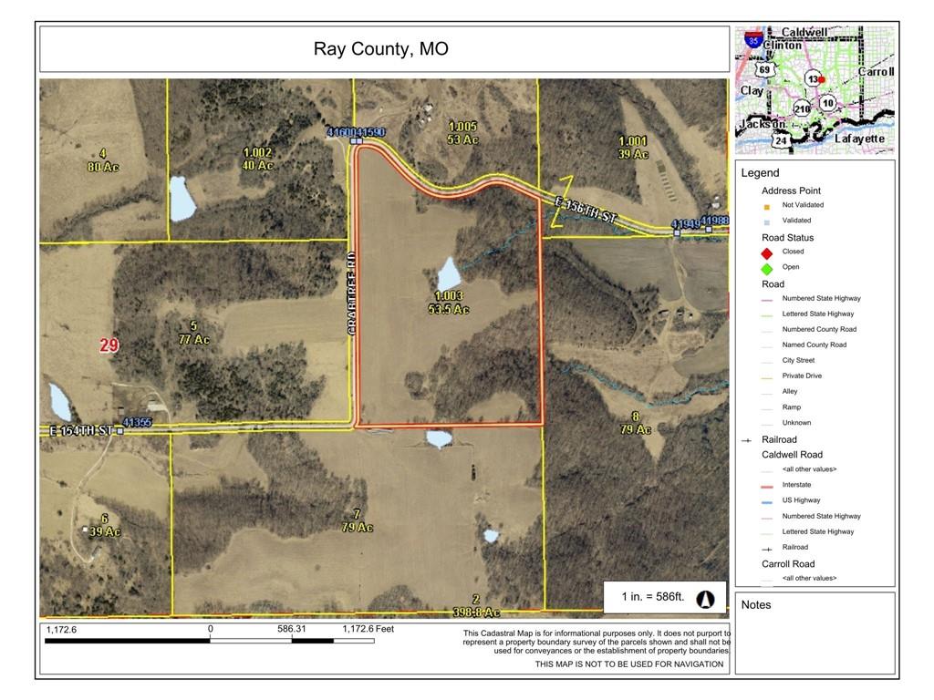 Heading north on 13 hwy, you will turn right on 154th street. Take 154th all the way down the the corner of 154th and Crabtree Rd. The entrance will be on the right hand side. The gate is located on the adjacent property that is also being sold. Go past the hay bales, and there will be an opening in the fence to get onto the 53.5 acre lot.