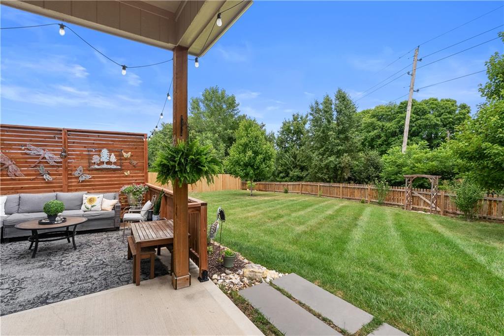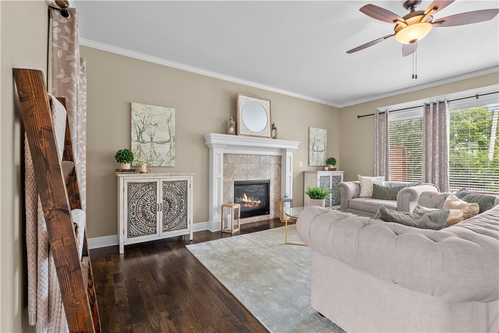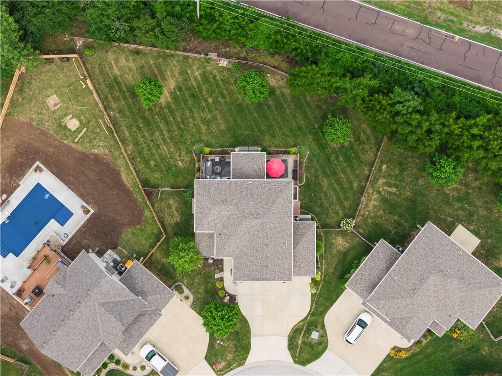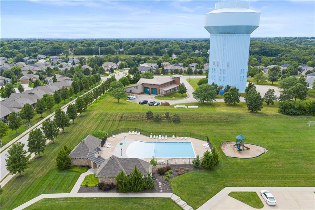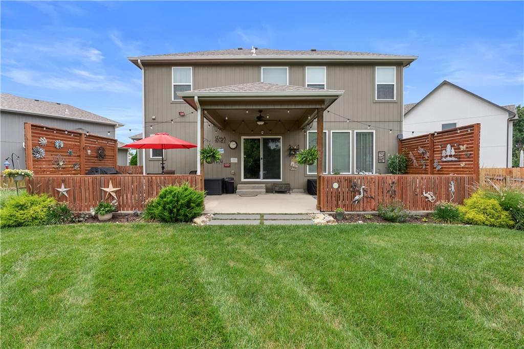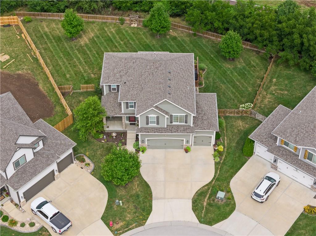 Welcome to this beautifully maintained 2-story home in the sought-after Parkway Estates community and award-winning Blue Springs School District! Nestled on a quiet cul-de-sac lot, this home offers 4 bedrooms, 2.5 baths, and over 2,700 sq ft of living space designed for both style and function. Step inside to find an inviting open floor plan with hardwood flooring, crown molding, and a cozy gas fireplace in the living room. The kitchen features granite countertops, a large island, stainless steel appliances, and rich cabinetry—perfect for everyday cooking and entertaining alike. Upstairs, the spacious primary suite offers a tray ceiling, soaking tub, dual vanities, and a walk-in closet with built-in organization. The finished lower level provides additional living space with room for a rec area, playroom, or home gym. It’s also stubbed for a future bathroom and includes multiple storage areas. Outside, enjoy the fully fenced backyard that backs to serene green space with no rear neighbors, along with a covered patio complete with privacy screen and string lighting—an entertainer’s dream! Additional highlights include a 3-car garage, new roof (2024), whole-home humidifier, water softener, and original HVAC and water heater (2016) still in great condition. Neighborhood amenities include a community pool, playground, and sidewalks, providing the perfect blend of convenience and community. This home checks every box—space, location, and lifestyle—all in the heart of Blue Springs.