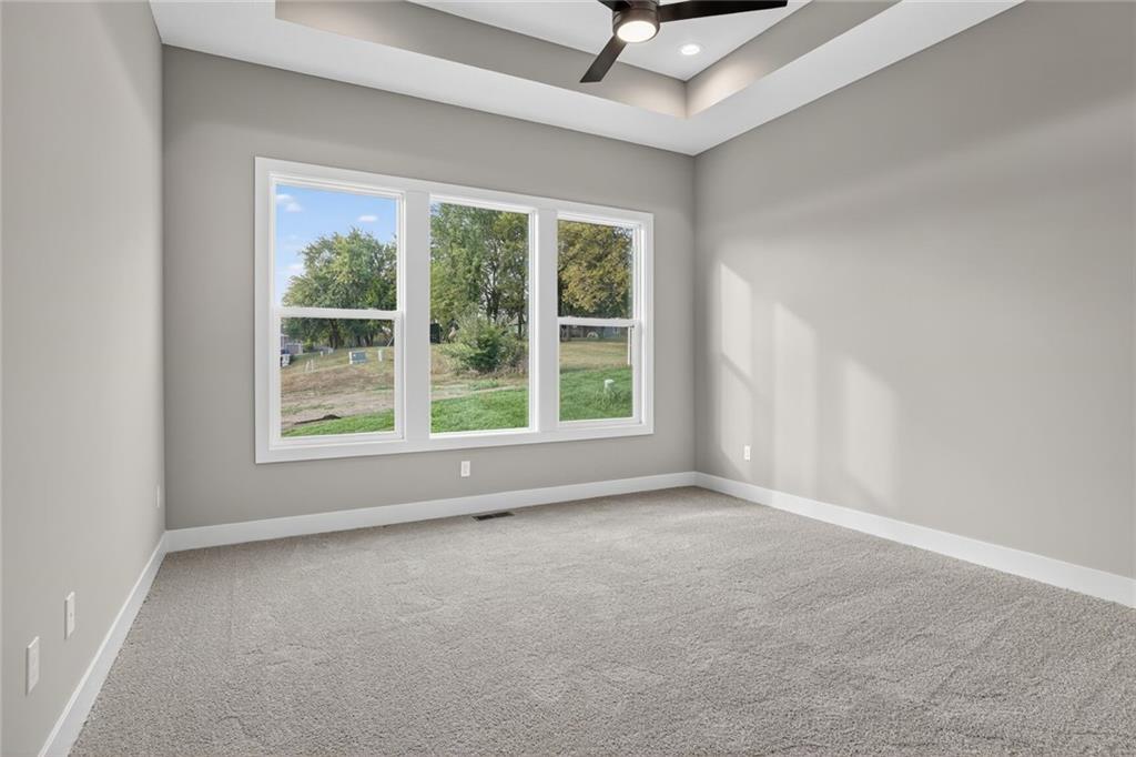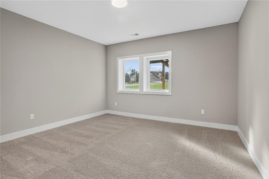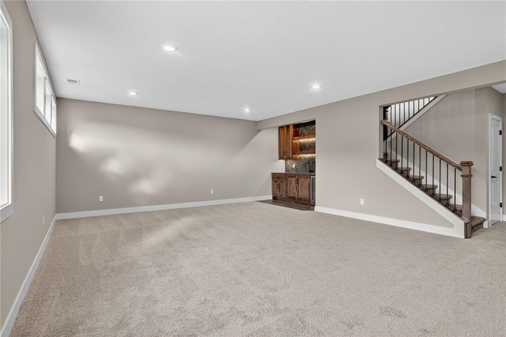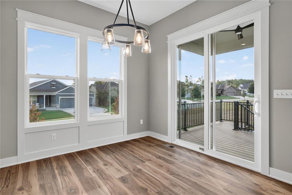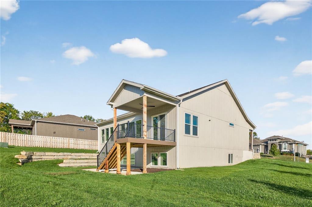 MOVE-IN READY! Back on market. Prior contract fell through due to buyer circumstances. Enjoy outdoor living, everyday convenience, and quick highway access in this charming reverse 1.5-story ideally positioned on a spacious corner lot (over 13,000 sq ft) tucked away in cul-de-sac with NO HOA fees! Only one of two homes remaining in popular Lakeshore Meadows! Minutes from grocery stores, shopping, dining, and major highways, plus close to Lake Olathe, Nature Center, local wineries, and the scenic county trail system. Once inside, you’ll experience thoughtful design and quality craftsmanship throughout. The home features Low-E Pella windows, RevWood flooring, extra-deep garages for added storage, 8-foot front and garage doors, custom wood soft close cabinetry, designer lighting, and tray ceilings with beams and accents. The great room is anchored by a floor-to-ceiling, stone-wrapped gas fireplace and abundant natural light. The open-concept layout flows seamlessly into the gourmet kitchen with quartz countertops, gas cooktop, built-in stainless-steel appliances, soft-close custom cabinetry, and a walk-in pantry with electrical outlets, perfect for small appliances and keeping countertops clutter-free. The finished lower-level has TWO ADDITIONAL SIZEABLE BEDROOMS, ¾ bath, wet bar with granite countertop and beverage fridge included. Additional luxury touches include custom wood-trimmed wall accents, and direct laundry access from the primary closet. Outdoor living continues with an expanded low-maintenance covered composite deck featuring stair access to a lower patio, ideal for relaxing or entertaining! An in-ground sprinkler system keeps the fully sodded yard looking its best. This home delivers the perfect blend of comfort, style, and location. Schedule your private showing today! Photos of actual home.