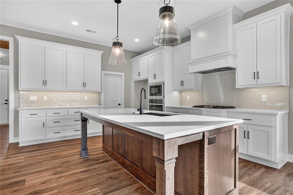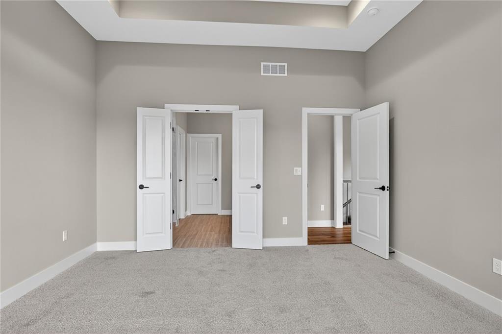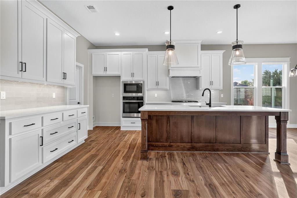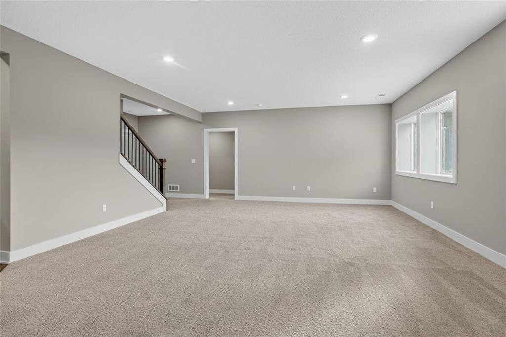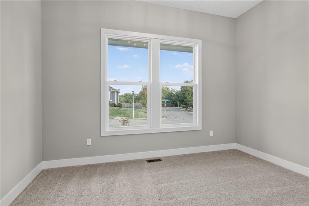 MOVE-IN READY! Back on market. Prior contract fell through due to buyer circumstances. Enjoy outdoor living, everyday convenience, and quick highway access in this charming reverse 1.5-story ideally positioned on a spacious corner lot (over 13,000 sq ft) tucked away in cul-de-sac with NO HOA fees! Only one of two homes remaining in popular Lakeshore Meadows! Minutes from grocery stores, shopping, dining, and major highways, plus close to Lake Olathe, Nature Center, local wineries, and the scenic county trail system. Once inside, you’ll experience thoughtful design and quality craftsmanship throughout. The home features Low-E Pella windows, RevWood flooring, extra-deep garages for added storage, 8-foot front and garage doors, custom wood soft close cabinetry, designer lighting, and tray ceilings with beams and accents. The great room is anchored by a floor-to-ceiling, stone-wrapped gas fireplace and abundant natural light. The open-concept layout flows seamlessly into the gourmet kitchen with quartz countertops, gas cooktop, built-in stainless-steel appliances, soft-close custom cabinetry, and a walk-in pantry with electrical outlets, perfect for small appliances and keeping countertops clutter-free. The finished lower-level has TWO ADDITIONAL SIZEABLE BEDROOMS, ¾ bath, wet bar with granite countertop and beverage fridge included. Additional luxury touches include custom wood-trimmed wall accents, and direct laundry access from the primary closet. Outdoor living continues with an expanded low-maintenance covered composite deck featuring stair access to a lower patio, ideal for relaxing or entertaining! An in-ground sprinkler system keeps the fully sodded yard looking its best. This home delivers the perfect blend of comfort, style, and location. Schedule your private showing today! Photos of actual home.