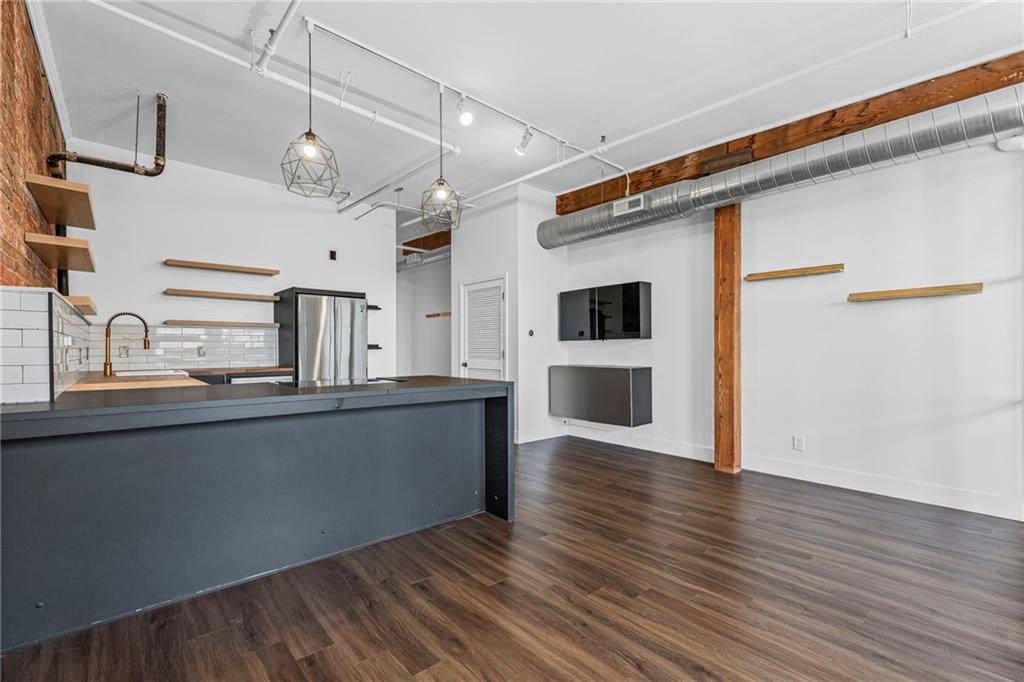 This beautifully renovated flat sits in the heart of KC’s historic Garment District, blending modern style with timeless character. The open layout highlights soaring ceilings and exposed brick, while brand-new updates add a polished touch throughout. The kitchen features custom cabinetry, a farmhouse sink, a tile backsplash with open shelving, and a full suite of stainless steel appliances—including a smart oven with air-fryer. A combined LG washer/dryer is also included. This unit also has storage just outside of the door. It is the only unit like this! The bathroom has been fully redesigned with a spacious vanity, designer fixtures, custom tile, and a large walk-in shower. New flooring runs throughout the home, tying it all together. The NEW west-facing windows bring in beautiful natural light and frame incredible sunset views. Residents enjoy access to amenities including a fitness center, theater, clubroom, Wi-Fi lounge, and storage lockers. Just steps from the River Market, Power & Light, T-Mobile Center, and the streetcar, this home connects you to all of downtown’s energy and entertainment. Parking is available for lease when offered. Experience the very best of historic city living here.