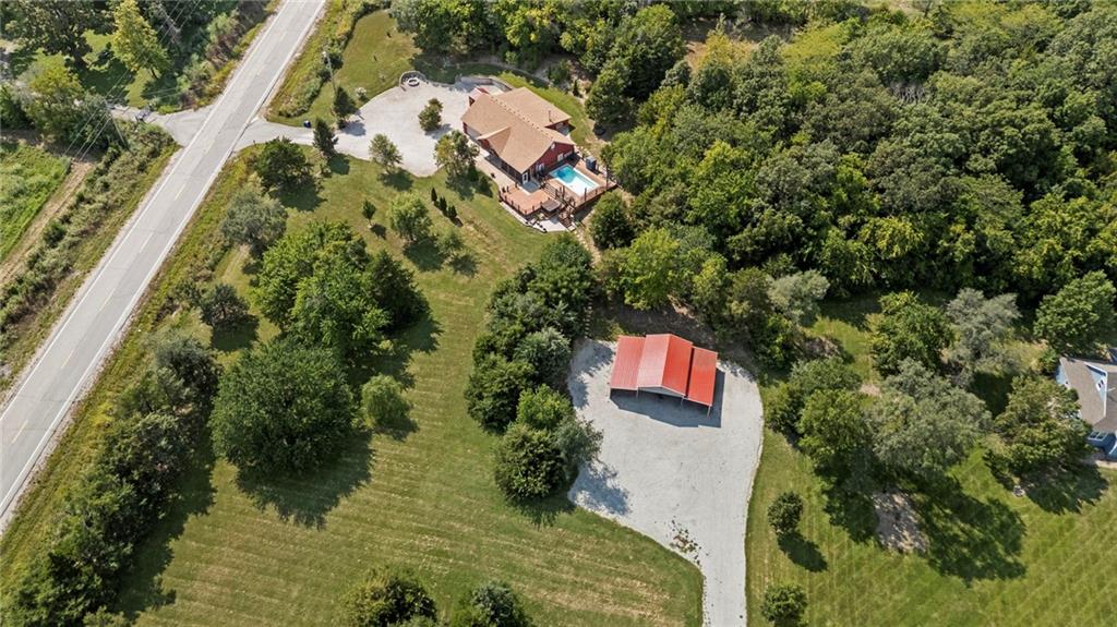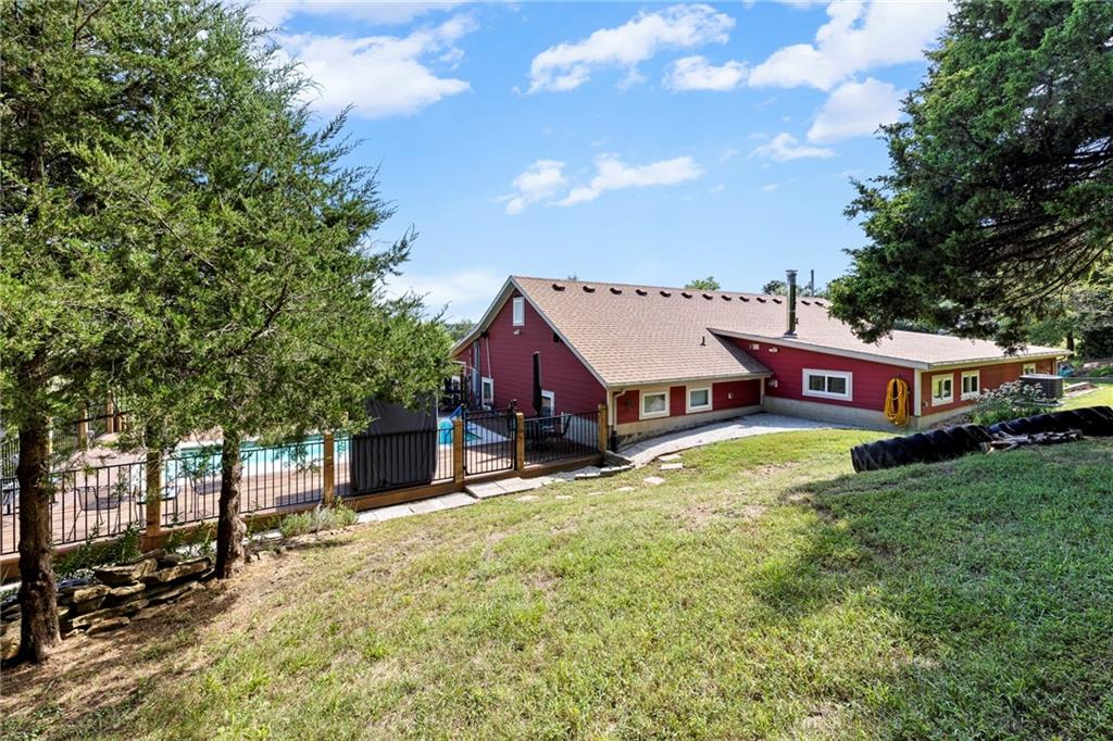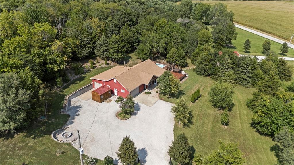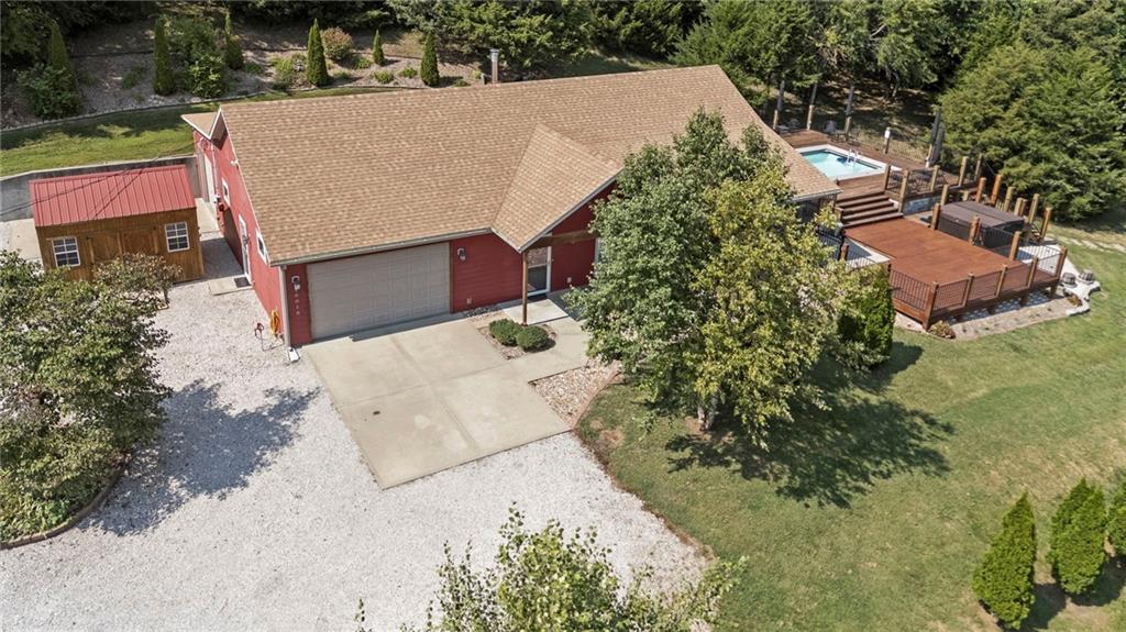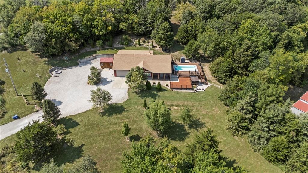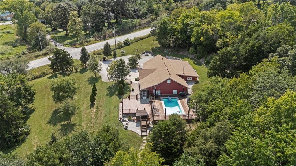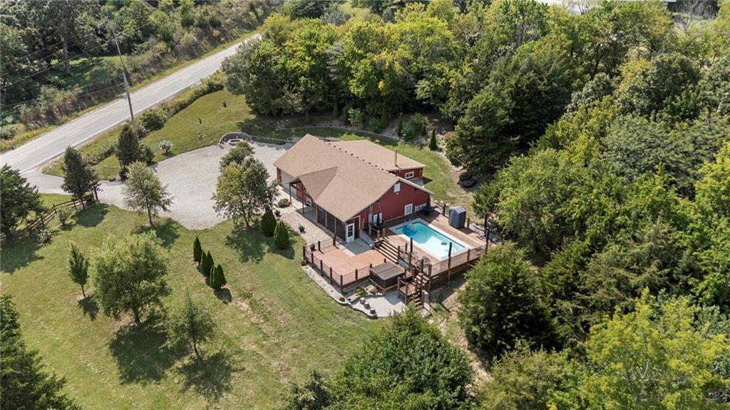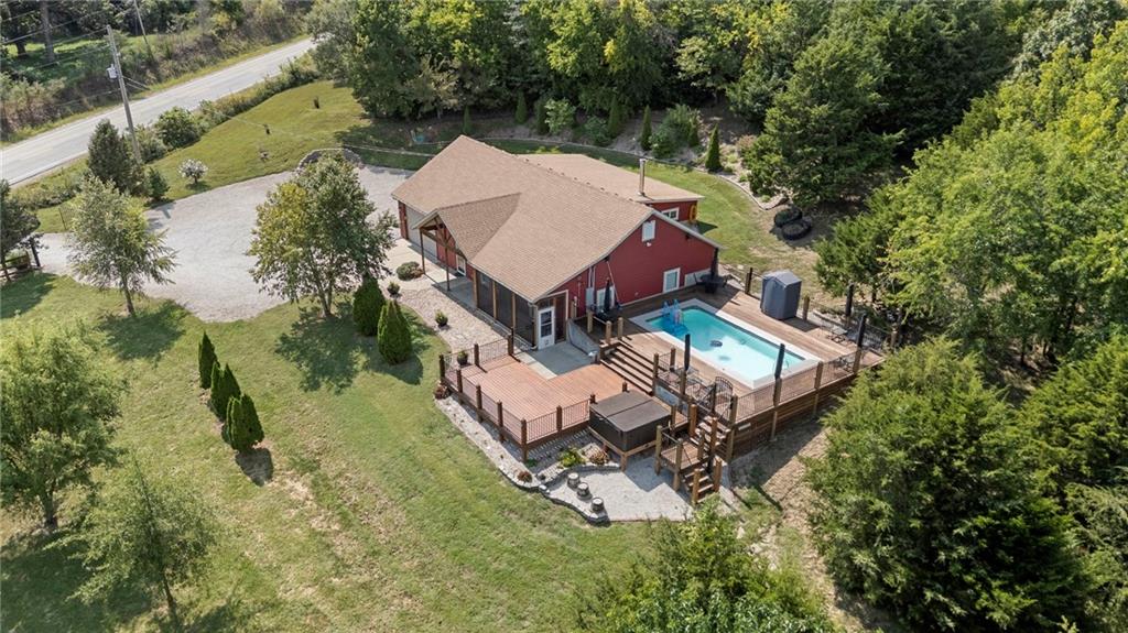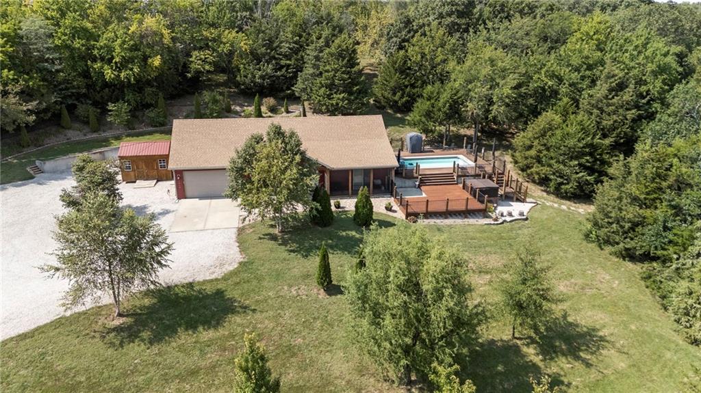 Welcoming wrought iron entrance gates, Cedar trim, this exquisite 3 Bedroom home perched on the side of a hill overlooking beautiful views for every season on a corner lot 1.5 miles from town on blacktop. The exceptional finishes in this home flow with Travertine tile floors and Granite countertops throughout, stainless kitchen sink, stove, microwave, refrigerator and dishwasher, Quartz backsplash, Jacuzzi bath, vessel sinks and new faucets, finished garages, multipurpose rooms, wood stove for those cold cozy nights. Electric LED fireplace, built in bookshelves and china cabinet, insulated interior walls for sound barrier, numerous closets finished for organization, wood doors, trim and cabinets. This multifunctional bathroom has 3 separate rooms! Storage with a drop-down ladder with extra attic space and shelving above the garage. For entertainment the screened porch, sauna, hot tub and inground/above ground 52"h/48"d 12'x24' pool with a simple filter pump for easy care, wrapped with wood decks and wrought iron rails, a luxury 6' Firepit, Horseshoe pit, chicken runs with hen houses. A 2nd entrance to the Estate with an outbuilding newly added in 2022, equipped with 100 amp electric breaker box. 3× 30/50 amp hookups for camper or boat. 4 miles to Hillsdale Lake or lake Miola. This 1500+ sq ft home is trimmed in switched lights with remote for different seasons, different colors or themes. Floodlights around along with a camera surveillance system including a monitor and 8 night vison cameras inside and out that can be monitored on your mobile phone while away. Plenty of Woods and View! You must see this higher quality home built for the Builder himself! This home is move in ready and has been very well kept with lots of mature landscape. Several flowering, colorful bushes and trees throughout the Seasons. It's like a new home without the wait time! A must see to appreciate!