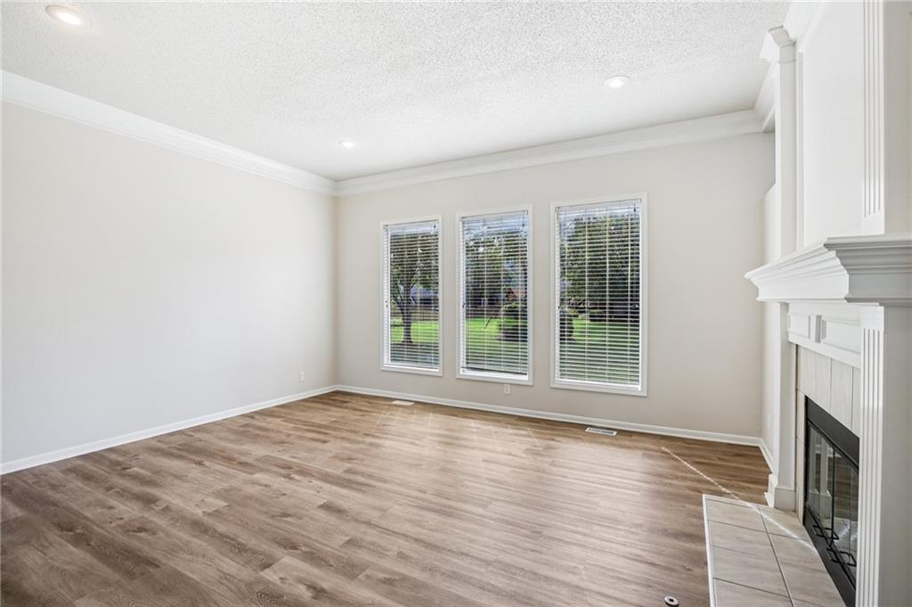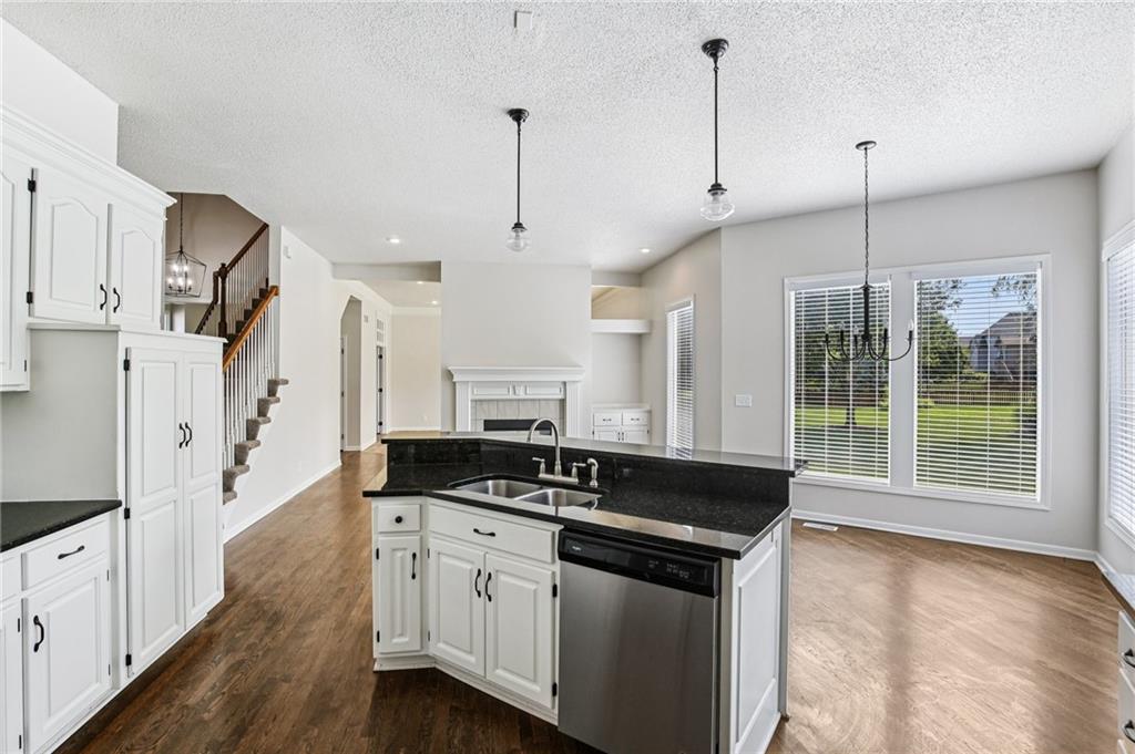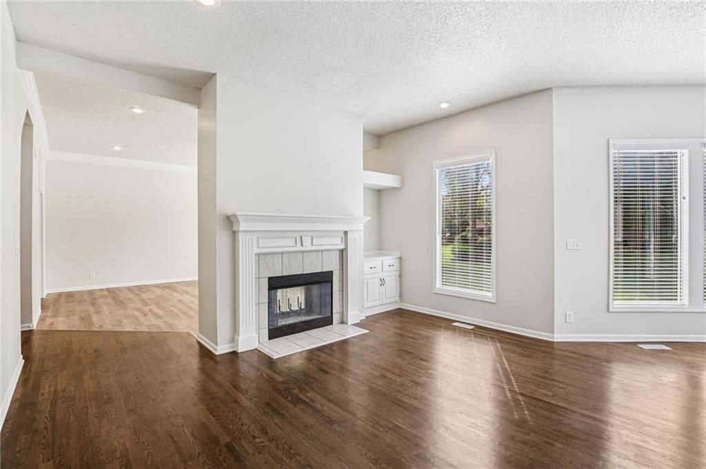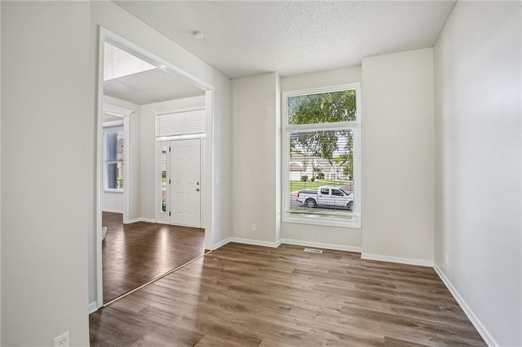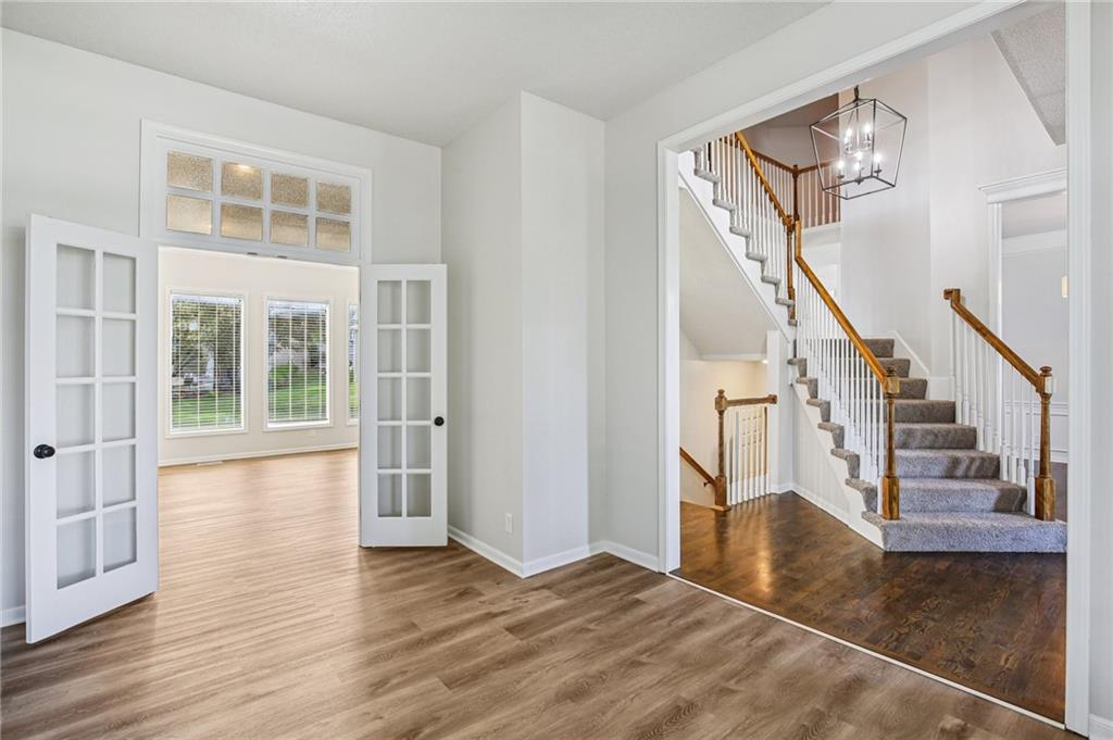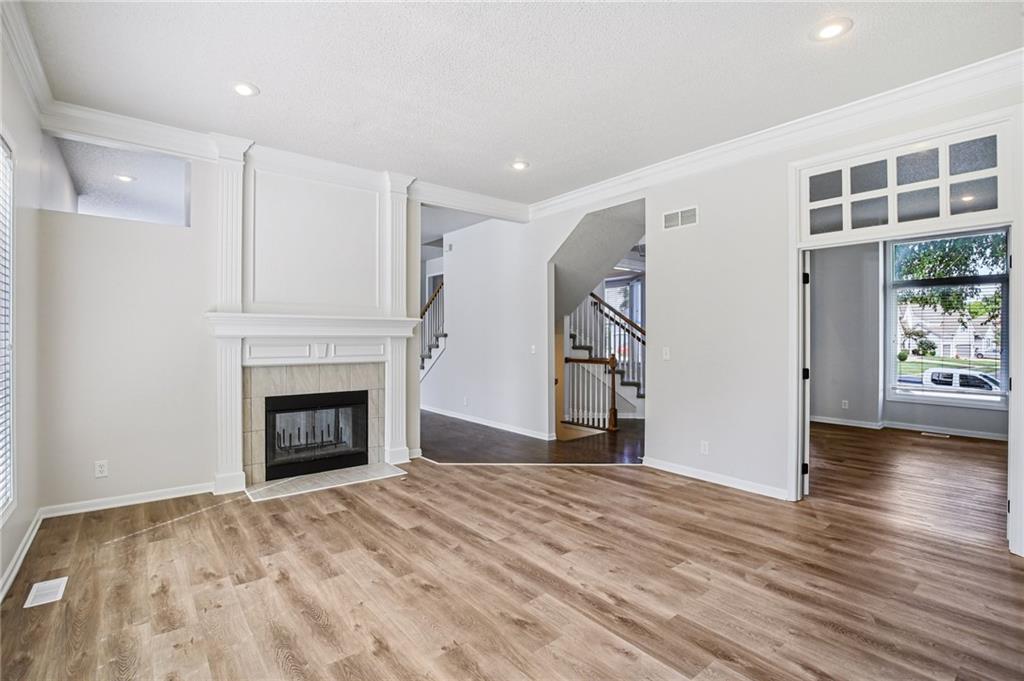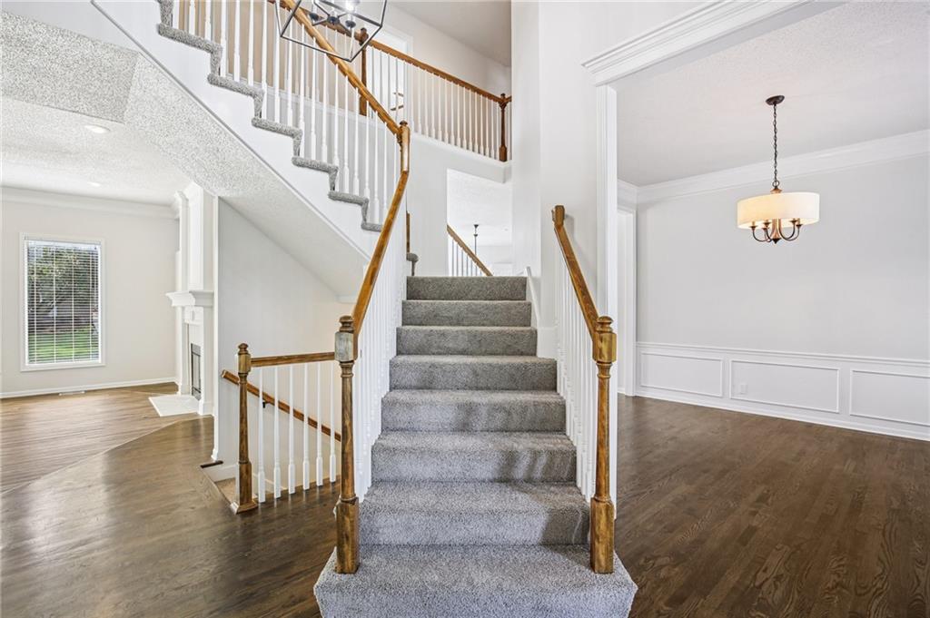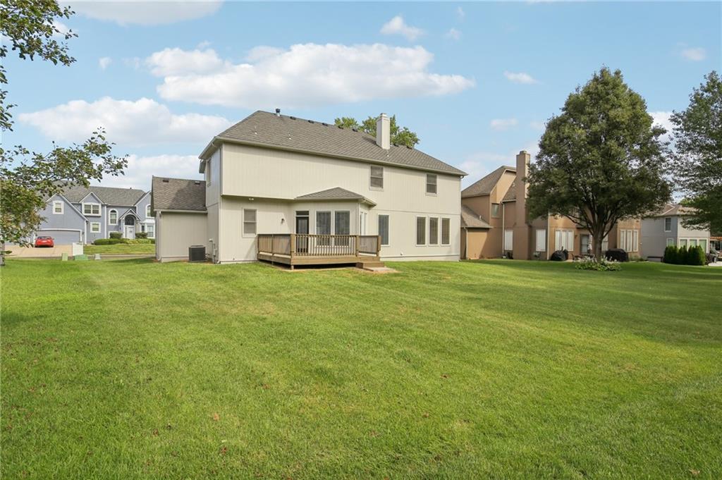 Welcome to this spacious 2-story home in the desirable Kensington at St. Andrews community. With over 3,100 square feet above grade and a finished lower level, this property offers 4 bedrooms, 3.1 baths, and a 3-car garage. The main floor includes an open living area with a see-through fireplace connecting the great room and hearth room. A formal dining space and large kitchen with granite countertops, custom cabinetry, island, and stainless steel appliances provide both function and flexibility. Hardwood flooring carries throughout much of the main level, and the home has fresh interior paint and new carpet. Upstairs, the primary suite features a spacious sitting area and a large walk-in closet, plus a private bath with double vanity, jetted tub, and separate shower. Secondary bedrooms include one with a private ensuite and two that share a hall bath. The finished basement provides a recreation room, extending your living and entertaining options. Outdoors, enjoy a great deck and a spacious yard. Community amenities include two swimming pools, trails, and a playground, all within the Blue Valley School District. Conveniently located near shopping, dining, and highway access, this home combines generous space with a sought-after neighborhood setting.