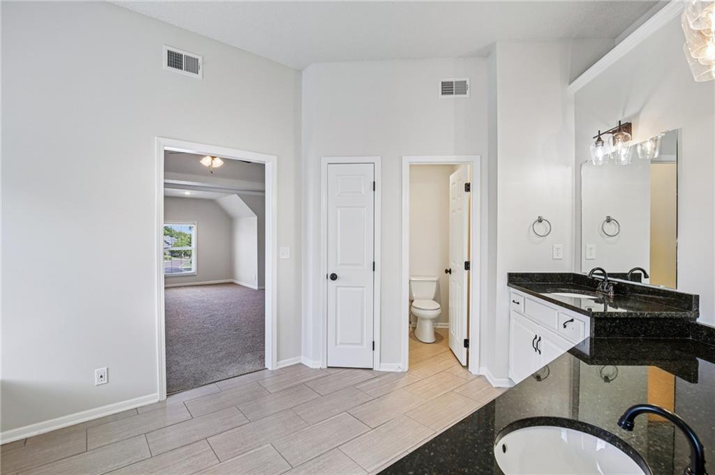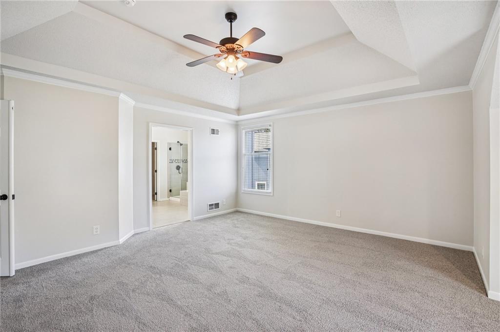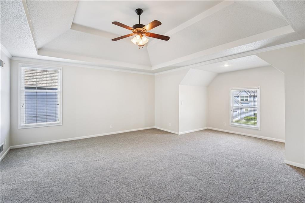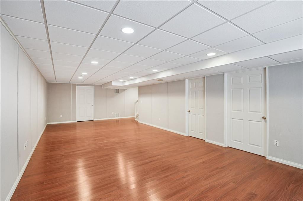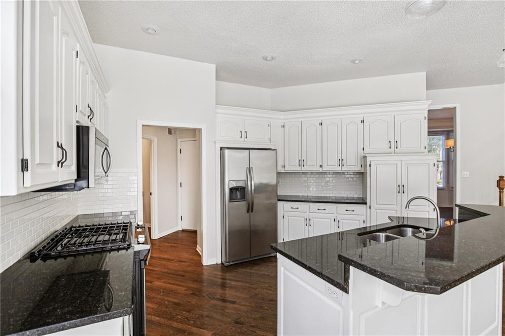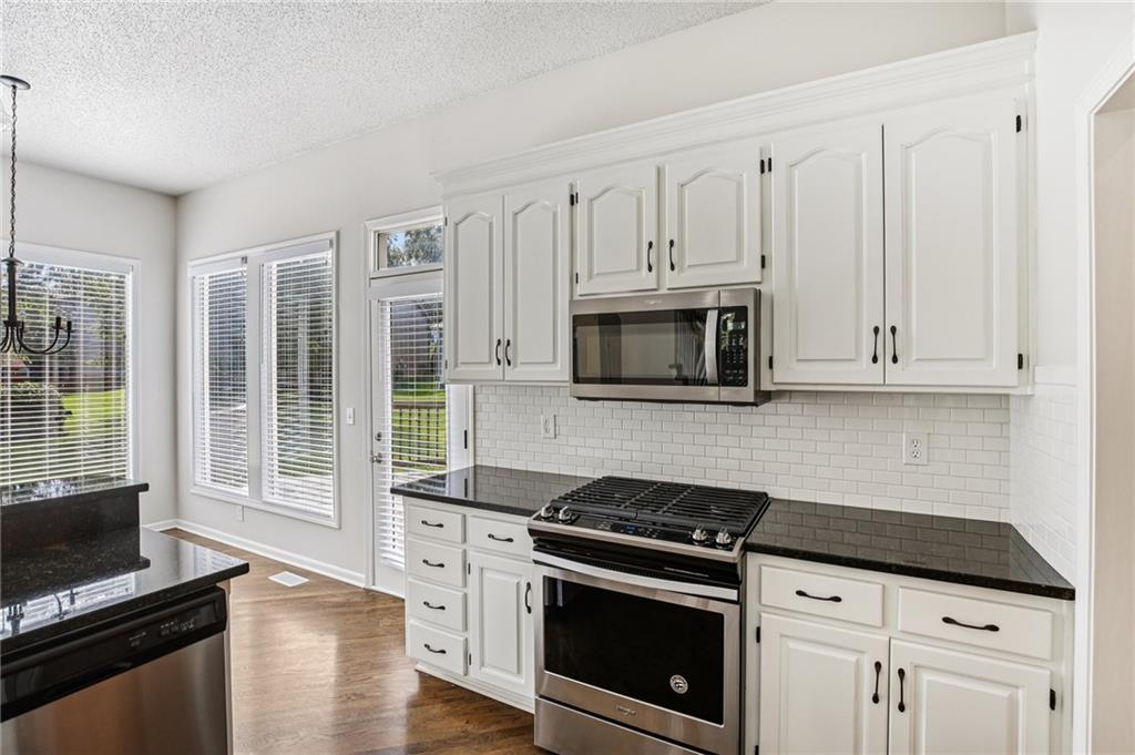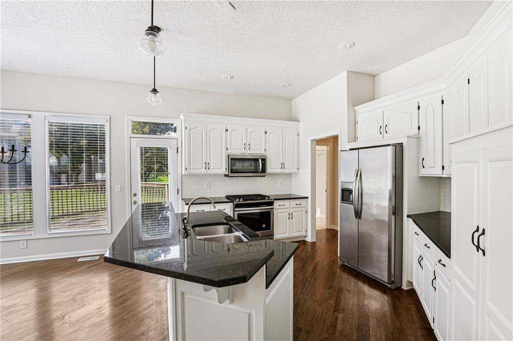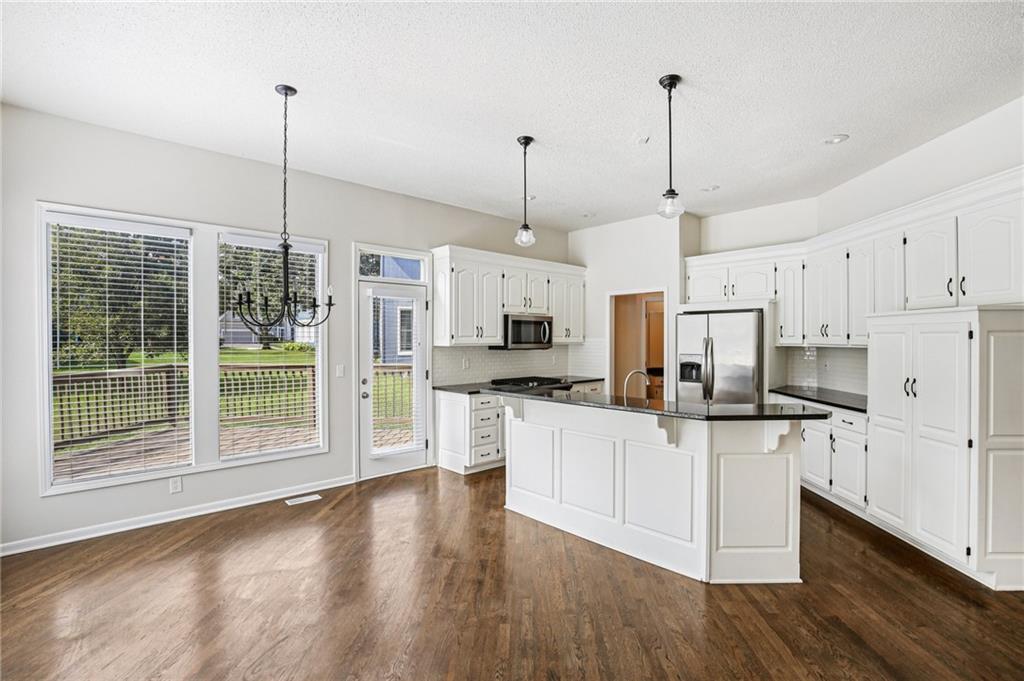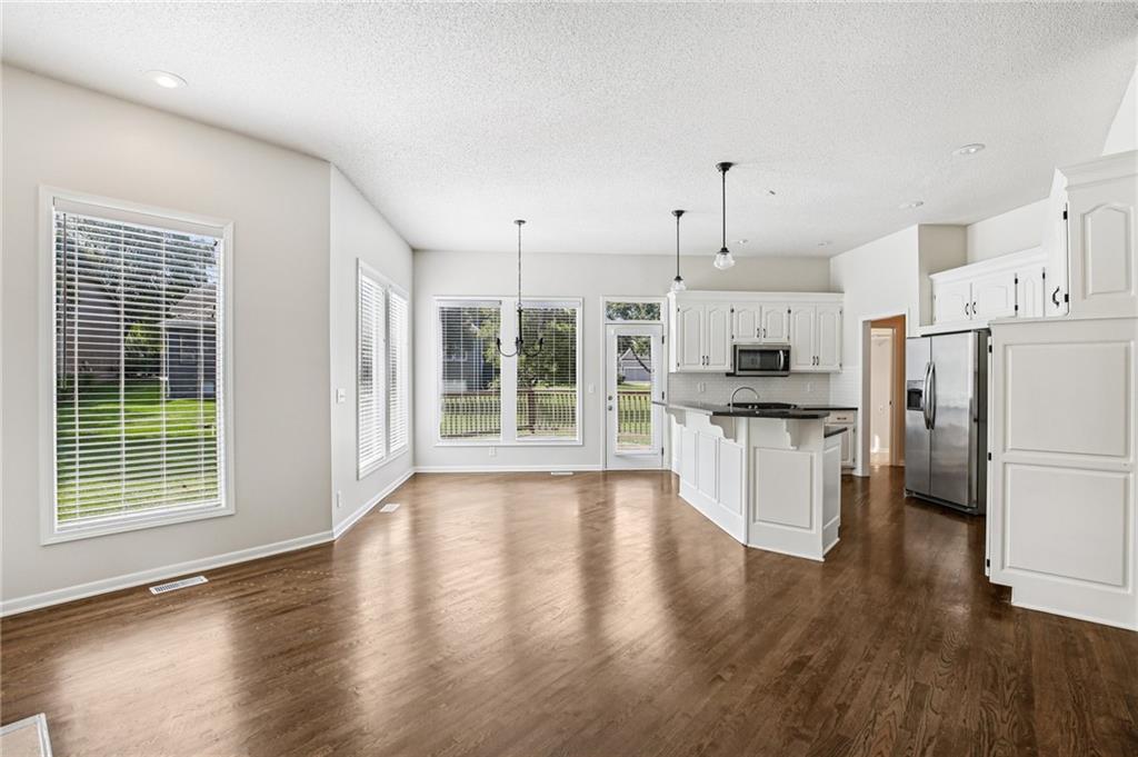 Welcome to this spacious 2-story home in the desirable Kensington at St. Andrews community. With over 3,100 square feet above grade and a finished lower level, this property offers 4 bedrooms, 3.1 baths, and a 3-car garage. The main floor includes an open living area with a see-through fireplace connecting the great room and hearth room. A formal dining space and large kitchen with granite countertops, custom cabinetry, island, and stainless steel appliances provide both function and flexibility. Hardwood flooring carries throughout much of the main level, and the home has fresh interior paint and new carpet. Upstairs, the primary suite features a spacious sitting area and a large walk-in closet, plus a private bath with double vanity, jetted tub, and separate shower. Secondary bedrooms include one with a private ensuite and two that share a hall bath. The finished basement provides a recreation room, extending your living and entertaining options. Outdoors, enjoy a great deck and a spacious yard. Community amenities include two swimming pools, trails, and a playground, all within the Blue Valley School District. Conveniently located near shopping, dining, and highway access, this home combines generous space with a sought-after neighborhood setting.