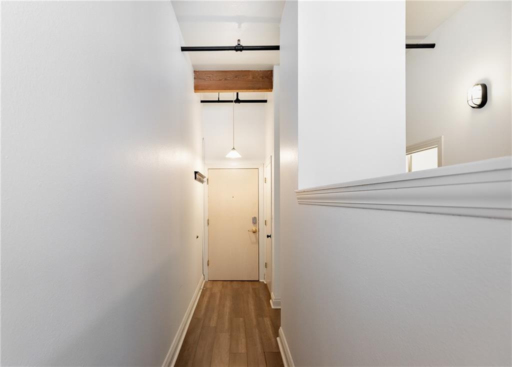 Hallway with dark wood-style floors and baseboards