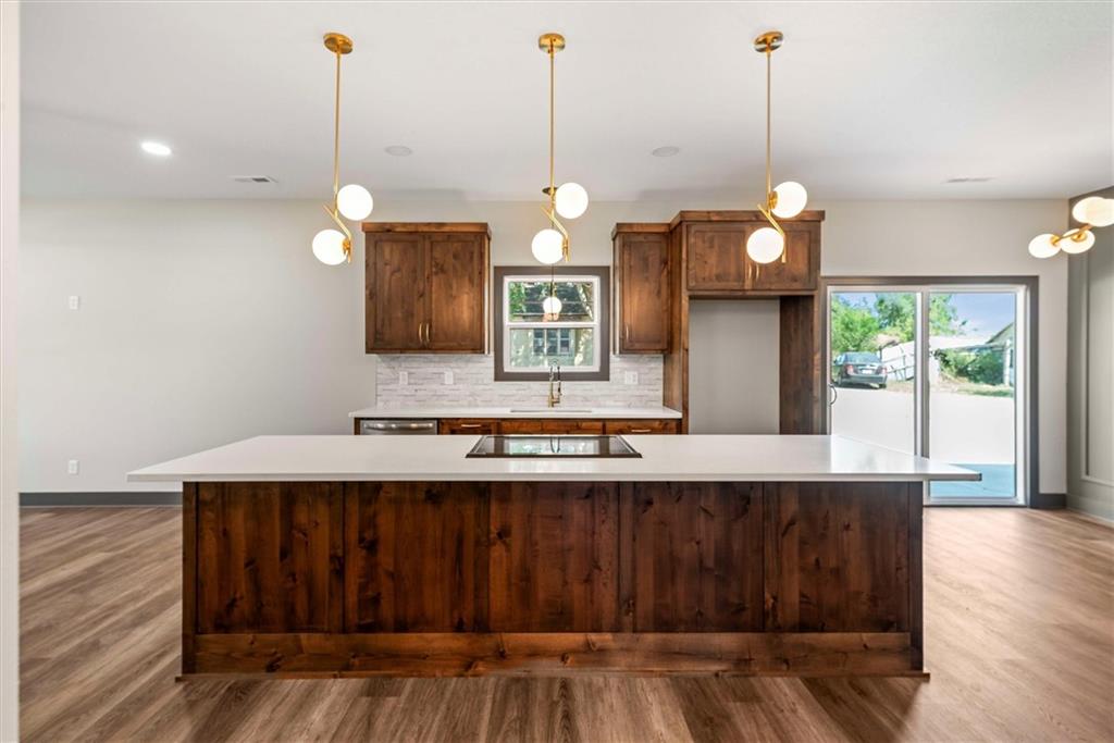 This brand new 3-bedroom, 2-bath home offers one level living and features an open concept floorplan for today's lifestyle. Luxury vinyl plank flooring throughout. Energy efficient led lighting with designer fixtures with brass accents. Kitchen features oversized island with brass faucet, quartz countertops and custom cabinetry. Primary suite off kitchen with access to laundry. Primary bath offers walk in shower. Two nice sized secondary bedrooms Large side entry garage. Patio for relaxing or entertaining. Custom front columns add to the curb appeal of this attractive functional home,