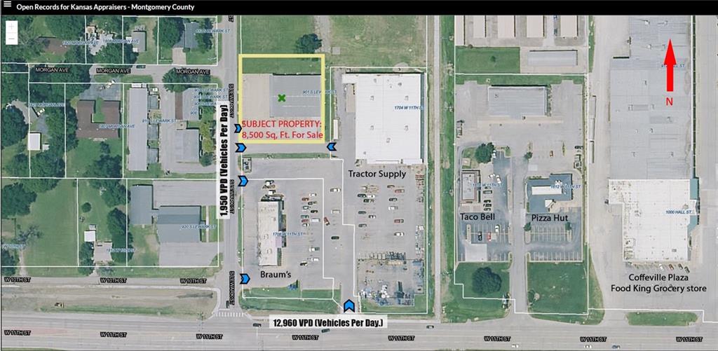 Vacant 8,500 sq. ft. (85'x100') free-standing commercial building located just off the US-169 corridor. Positioned adjacent to Tractor Supply and Braum's, the property benefits from traffic from the nearby intersection with KDOT reports showing AADT (annual average daily traffic) on Lewark of1370, and 10,300 AADT on US 166 (11th street). This location serves a core trade area of nearly 10,000 people within a 5-minute drive. The clear-span steel building features a flexible open-concept layout, 10-ft ceilings, and a 10'x22' insulated overhead door. The main space includes two restrooms and utility service. Includes a separately-metered 18'x16' office suite with a private entrance and bath, providing verified income potential. The property features 20+ marked on-site parking spaces. Zoning: Commercial. Buyer is responsible for verifying all permitted uses and specific zoning requirements directly with the City of Coffeyville. Contact agent for information package and to schedule a showing.
