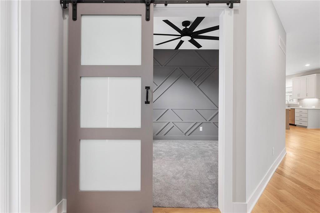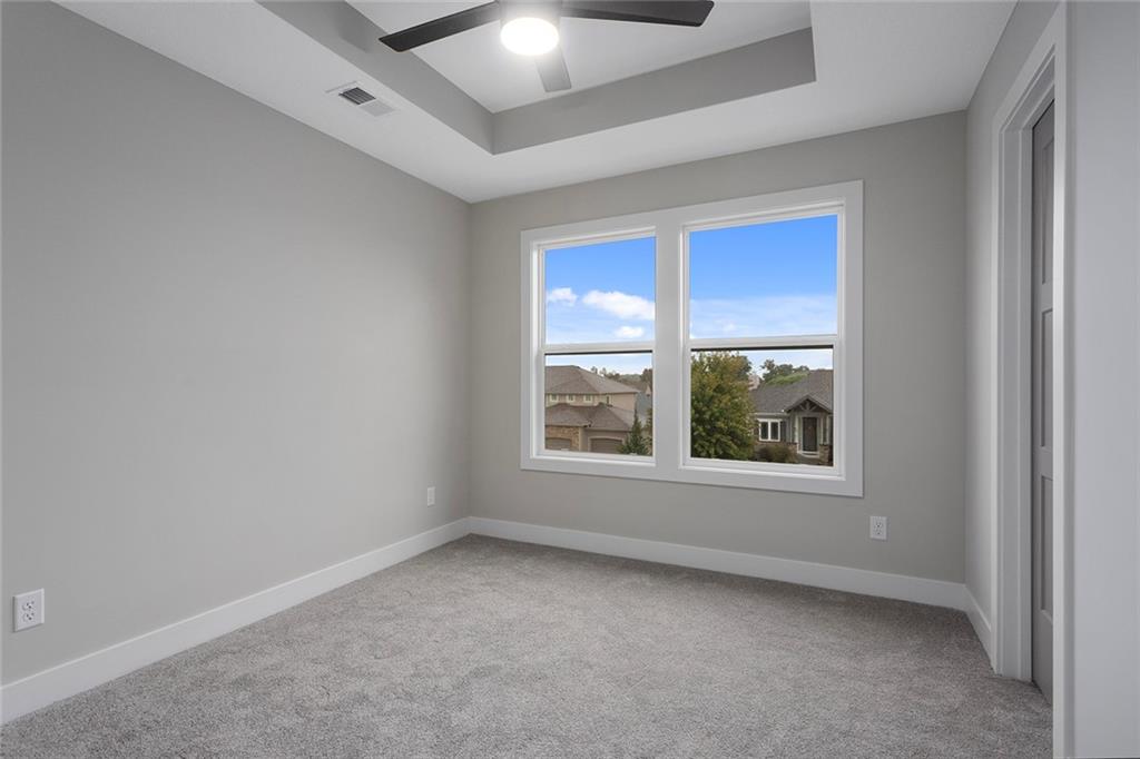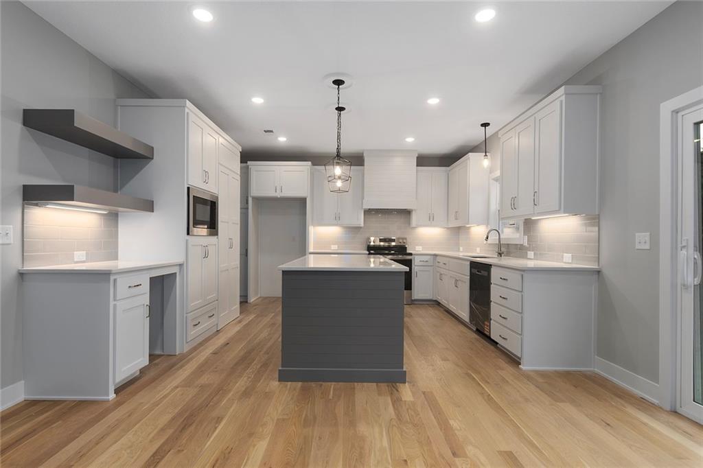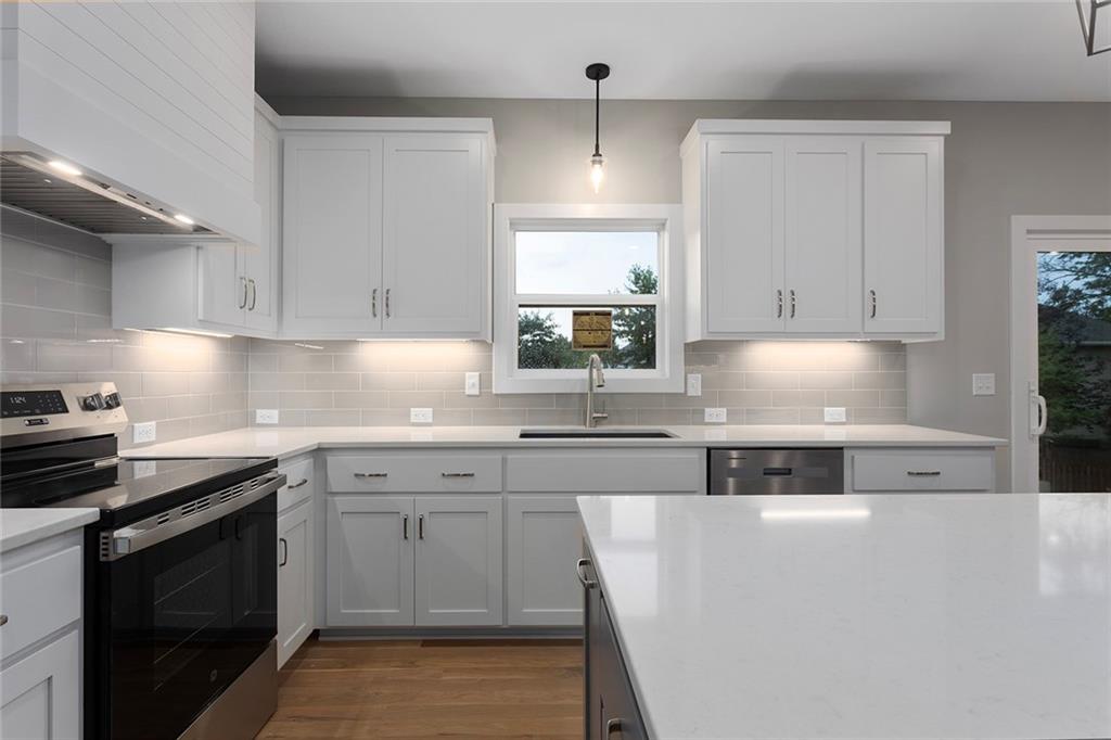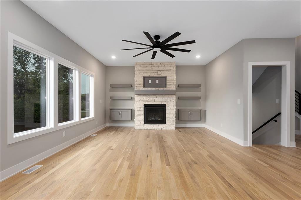 1 of 1!!! This floor plan is nowhere else in Blue Springs. This home is in the beautiful Parkway Estates. Beautiful covered front porch welcomes you in to this home! The home has 5 bedrooms (one possible office/Den is on the main floor). Home features an open concept living area with the kitchen, dining room, and living room with lots of real hardwood floors. Kitchen features all stainless-steel appliances (microwave is not over stove!), under cabinet lighting, boot box area, pantry, and a HUGE island all with Quartz tops. Beer-wine refrigerator. Basement has a large rec and a smaller rec room for arcade games or a poker table. This home is perfect for family gatherings and an entertaining. Outside, there is a large patio and lots of landscaping. SO much beauty to see! The neighborhood features a beautiful pool for residents. Don't miss out. 96% Efficient Gas Furnace with High Efficiency Blower Motor, 14.7 SEER2 Condenser, and humidifier. 3 car wide FULL driveway! 3rd car door is 1' wider than normal and is extra deep for any big vehicle's! No more parking OUTSIDE!!! 2 barn door sliders. 7 ceiling fans! MASSIVE master shower with seat! Secret room off a 2nd bedroom closet that every kid dreams of (or upstairs storage). WOW 1/2 bathroom! Several floating shelves and built-in cabinets! Real 3.25 white oak with UPGRADED #1 grade wood with natural water base finish! Storm/Safe room under the front porch! WHOLE yard sprinkler system! Upgraded Fescue grass. Pella windows and much much more! ALL done and will show very well!