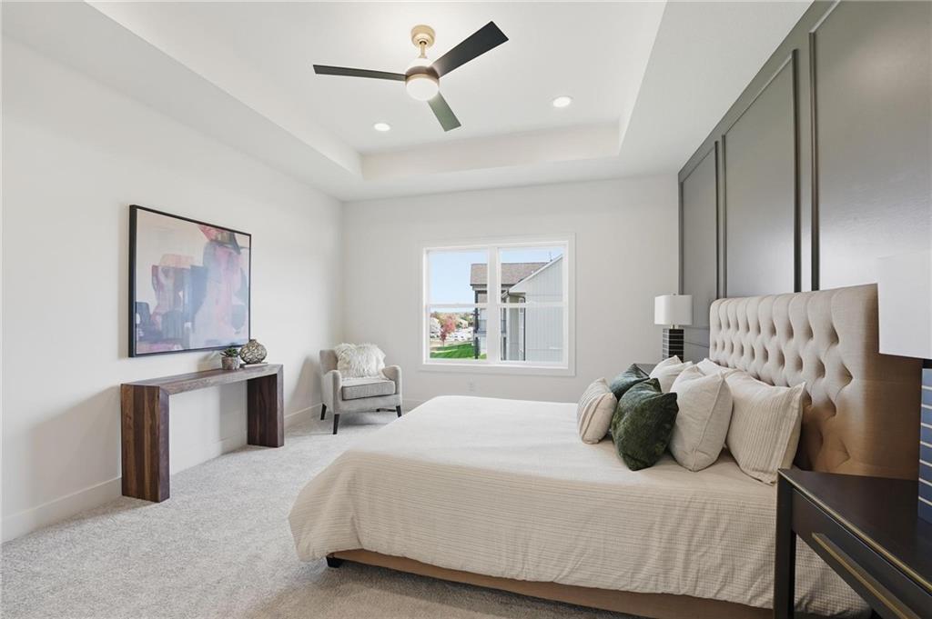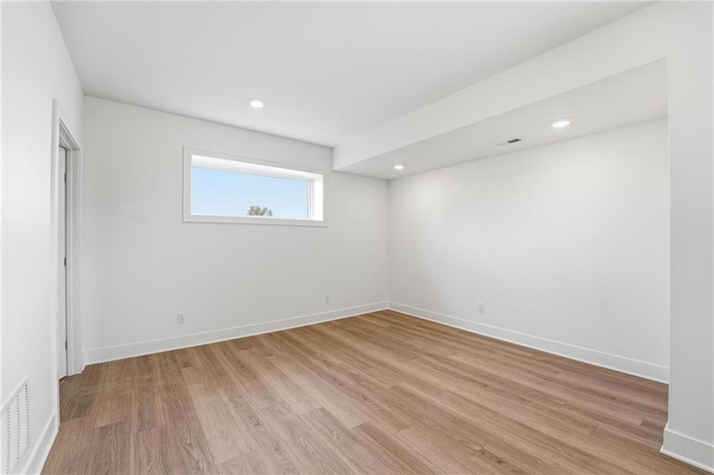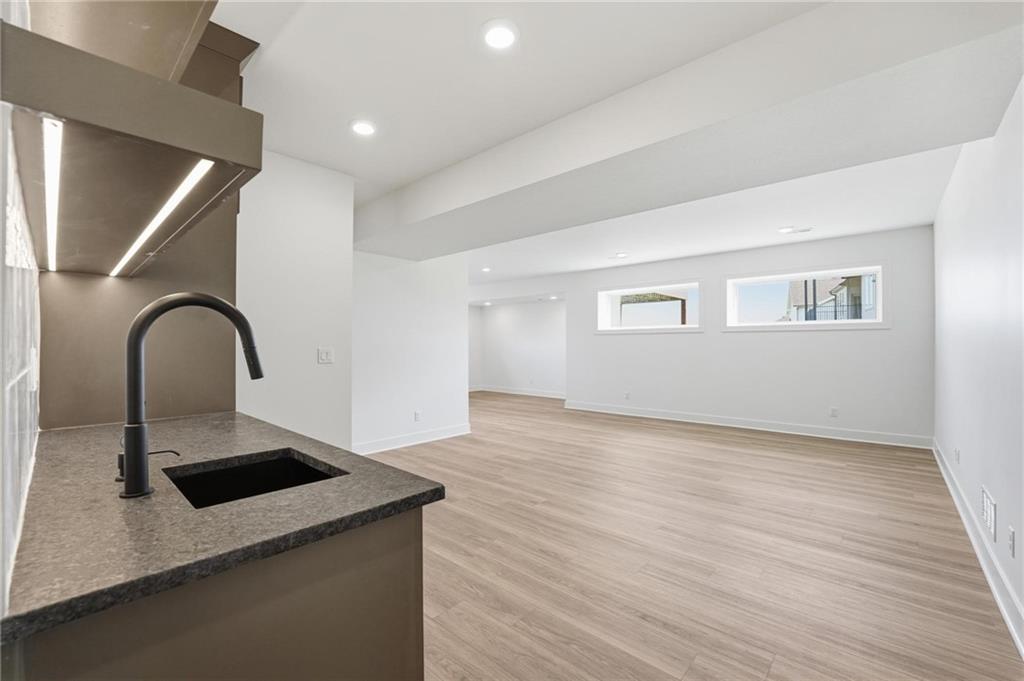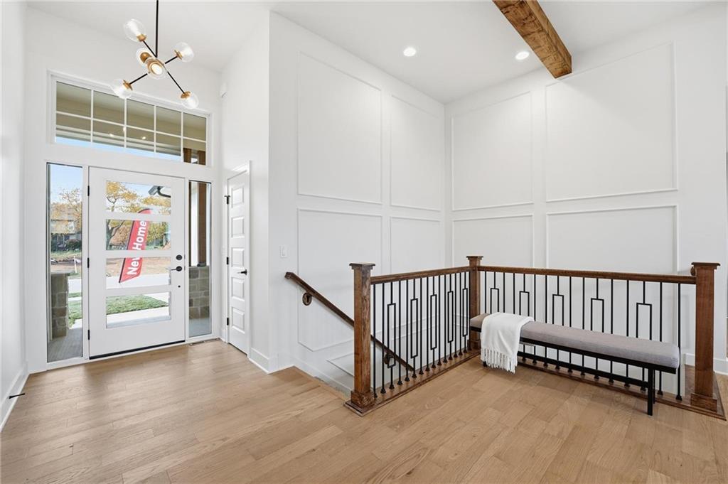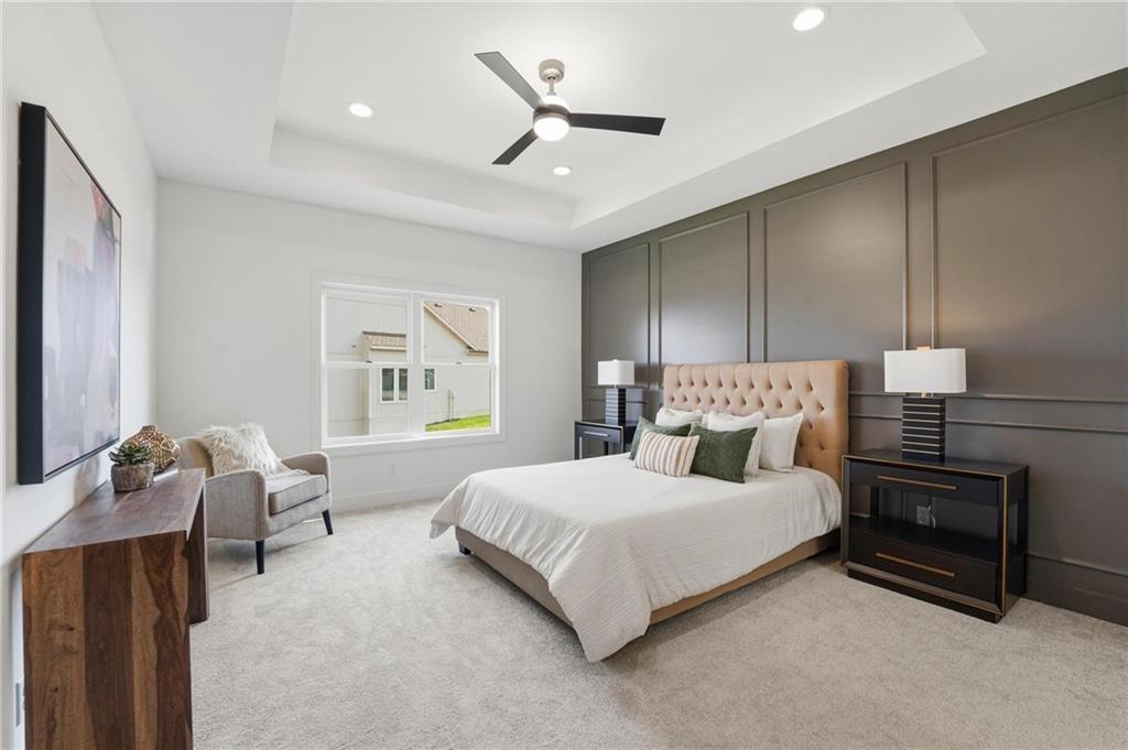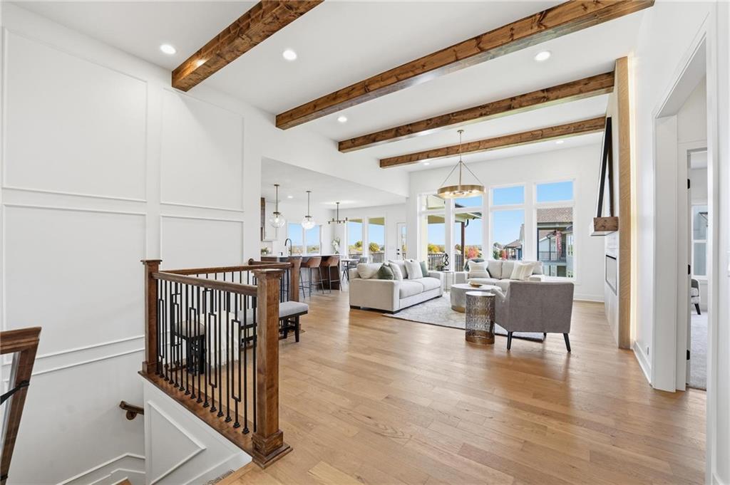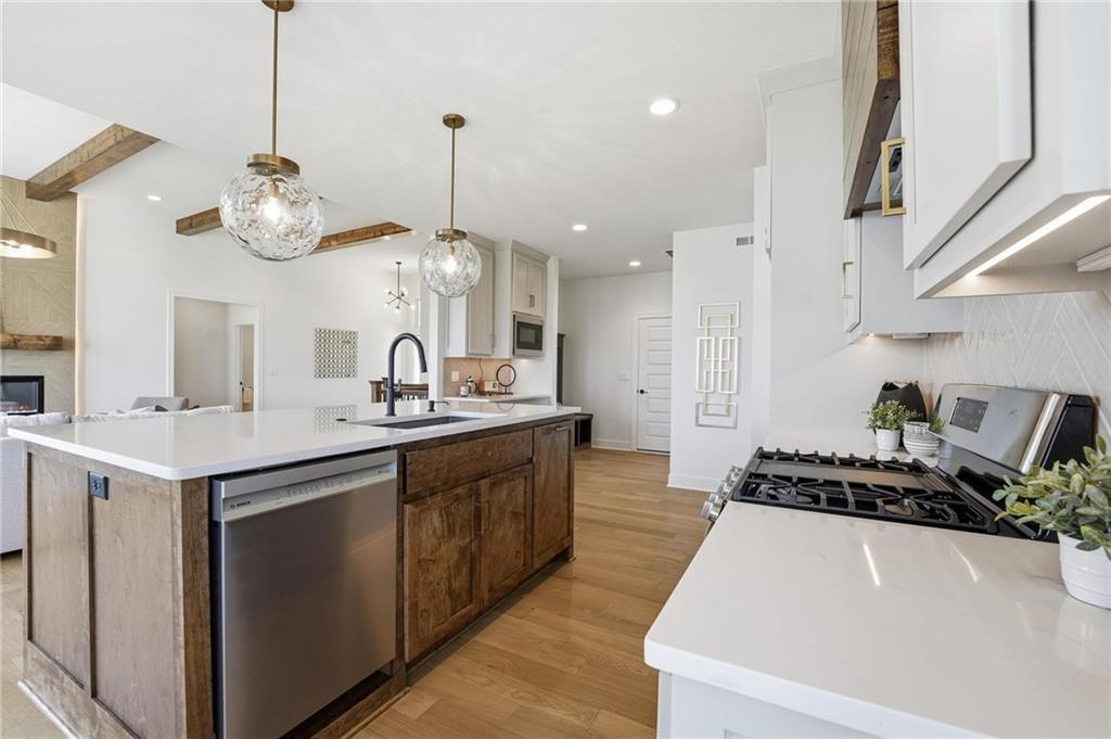 Step inside and you’ll immediately notice the bright, airy feel of this home. The open floor plan is accented by tall ceilings with exposed wood beams, oversized windows that pour in natural light, and wide-plank hardwoods that create a welcoming atmosphere. The living room is anchored by a striking floor-to-ceiling fireplace topped with a wood mantel, the perfect spot to gather with friends or relax at the end of the day. The gourmet kitchen is designed for both function and style, offering a large island with seating, quartz countertops, custom cabinetry, stainless steel appliances, and modern lighting. The adjoining dining area overlooks the backyard and provides direct access to the covered deck for outdoor enjoyment. The primary suite feels like a private retreat, complete with a tray ceiling, modern ceiling fan, soft carpet, and a bold accent wall. The adjoining spa-like bath is designed for relaxation, offering a calm and luxurious escape with a large shower, soaking tub, and double vanities. Additional main-level highlights include a private office, mudroom, walk-in pantry, and laundry room. The finished lower level expands the living space with a large recreation room featuring oversized windows, a wet bar, and a half bath. Two additional bedrooms share a full bathroom on this level. Additional upgrades include under-cabinet lighting and a variety of modern finishes throughout.