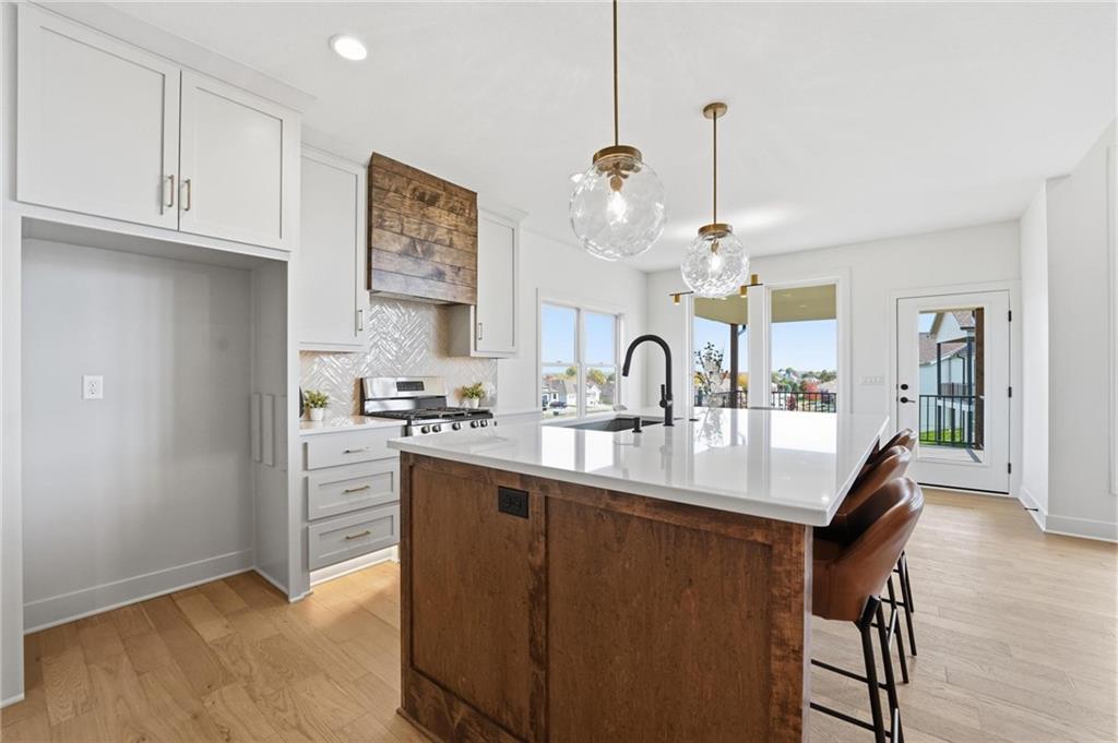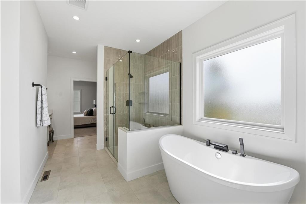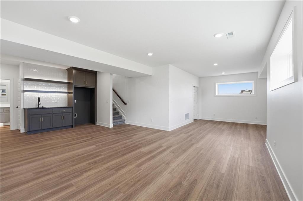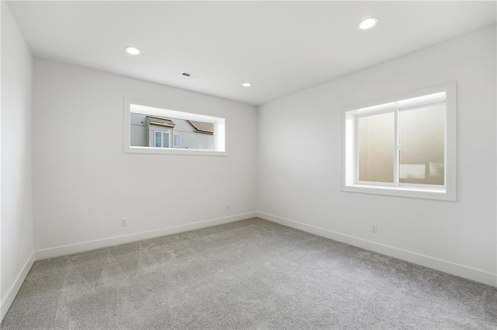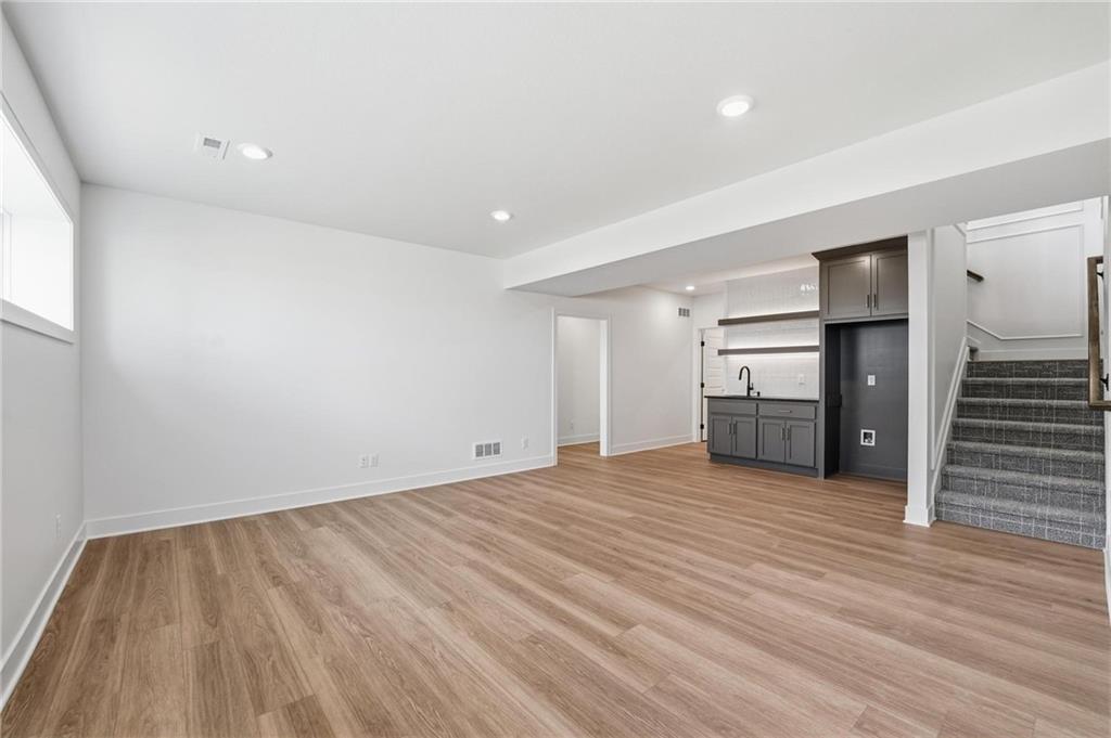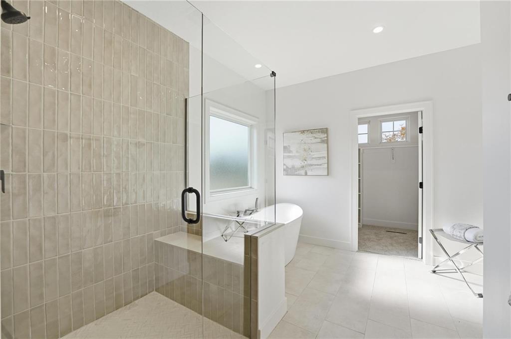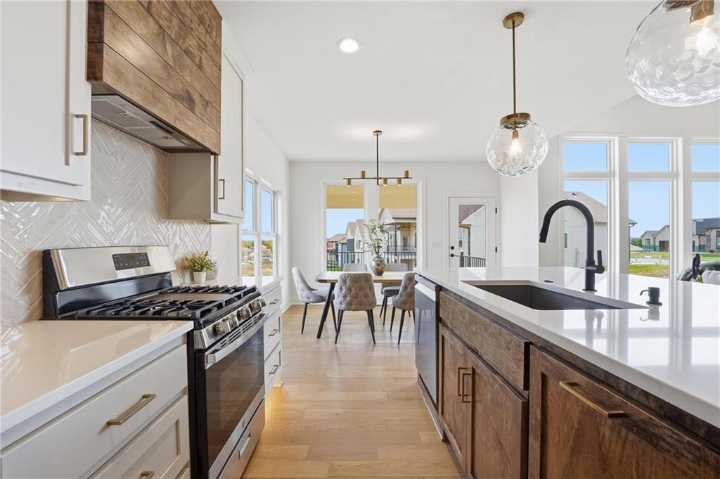 Step inside and you’ll immediately notice the bright, airy feel of this home. The open floor plan is accented by tall ceilings with exposed wood beams, oversized windows that pour in natural light, and wide-plank hardwoods that create a welcoming atmosphere. The living room is anchored by a striking floor-to-ceiling fireplace topped with a wood mantel, the perfect spot to gather with friends or relax at the end of the day. The gourmet kitchen is designed for both function and style, offering a large island with seating, quartz countertops, custom cabinetry, stainless steel appliances, and modern lighting. The adjoining dining area overlooks the backyard and provides direct access to the covered deck for outdoor enjoyment. The primary suite feels like a private retreat, complete with a tray ceiling, modern ceiling fan, soft carpet, and a bold accent wall. The adjoining spa-like bath is designed for relaxation, offering a calm and luxurious escape with a large shower, soaking tub, and double vanities. Additional main-level highlights include a private office, mudroom, walk-in pantry, and laundry room. The finished lower level expands the living space with a large recreation room featuring oversized windows, a wet bar, and a half bath. Two additional bedrooms share a full bathroom on this level. Additional upgrades include under-cabinet lighting and a variety of modern finishes throughout.