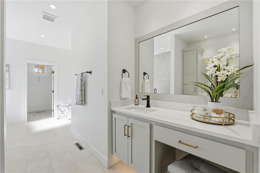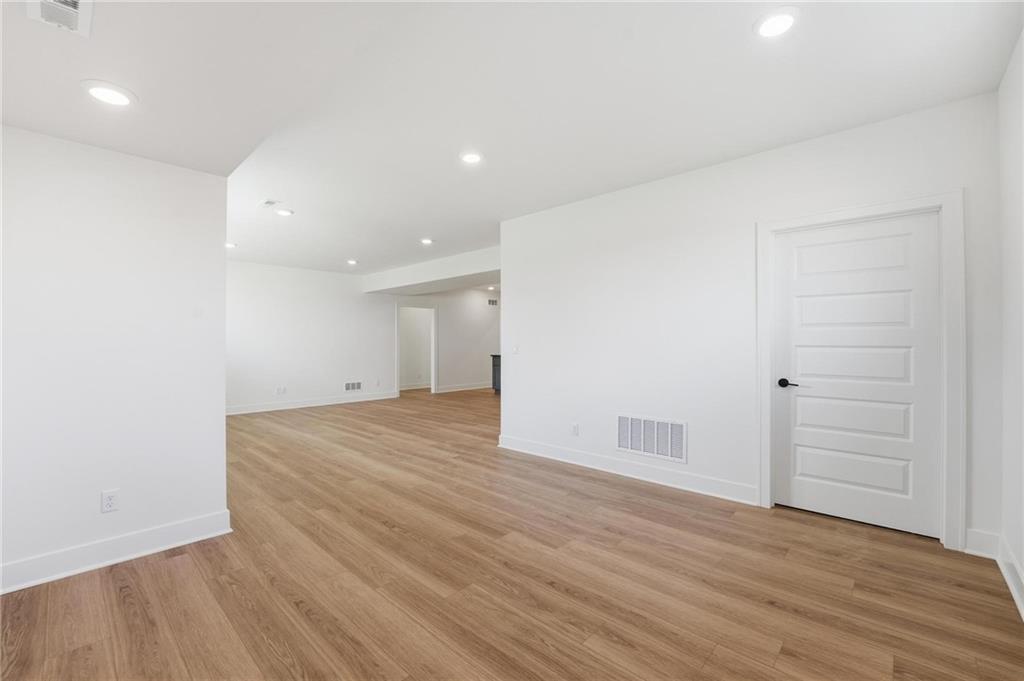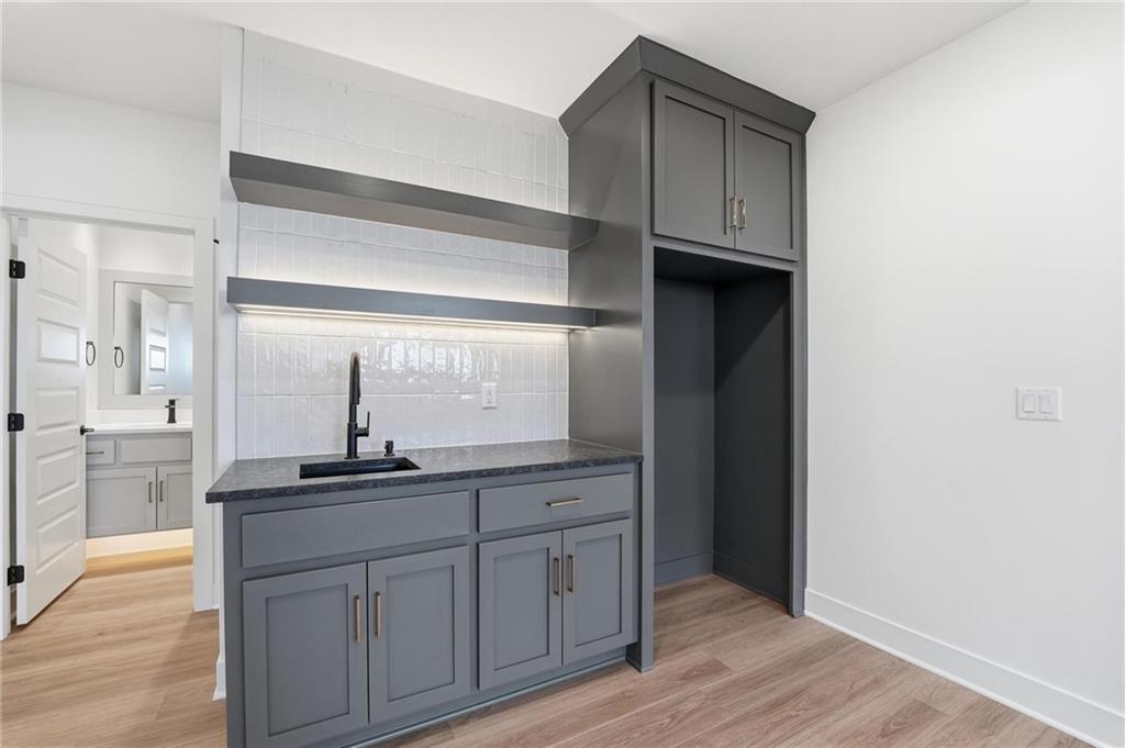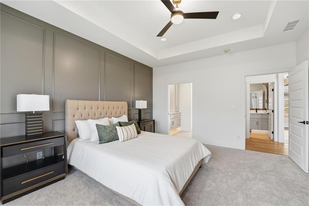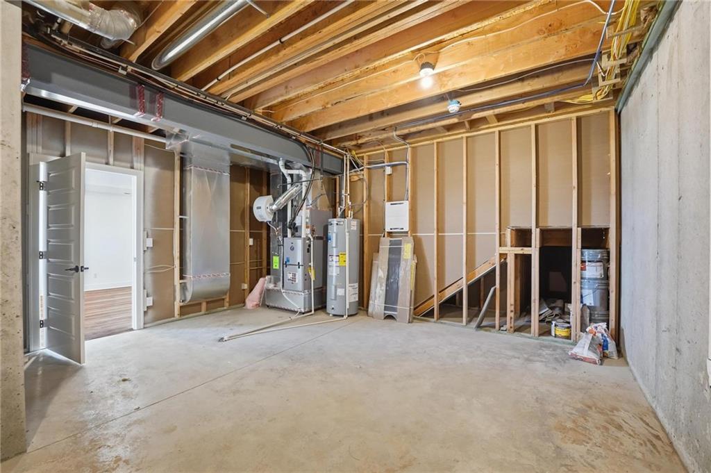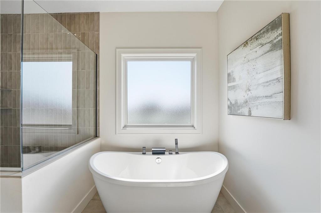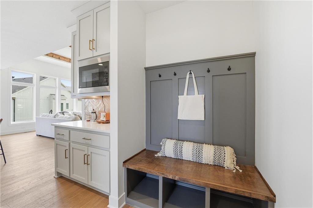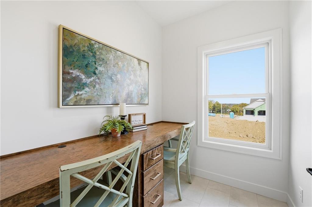 Step inside and you’ll immediately notice the bright, airy feel of this home. The open floor plan is accented by tall ceilings with exposed wood beams, oversized windows that pour in natural light, and wide-plank hardwoods that create a welcoming atmosphere. The living room is anchored by a striking floor-to-ceiling fireplace topped with a wood mantel, the perfect spot to gather with friends or relax at the end of the day. The gourmet kitchen is designed for both function and style, offering a large island with seating, quartz countertops, custom cabinetry, stainless steel appliances, and modern lighting. The adjoining dining area overlooks the backyard and provides direct access to the covered deck for outdoor enjoyment. The primary suite feels like a private retreat, complete with a tray ceiling, modern ceiling fan, soft carpet, and a bold accent wall. The adjoining spa-like bath is designed for relaxation, offering a calm and luxurious escape with a large shower, soaking tub, and double vanities. Additional main-level highlights include a private office, mudroom, walk-in pantry, and laundry room. The finished lower level expands the living space with a large recreation room featuring oversized windows, a wet bar, and a half bath. Two additional bedrooms share a full bathroom on this level. Additional upgrades include under-cabinet lighting and a variety of modern finishes throughout.