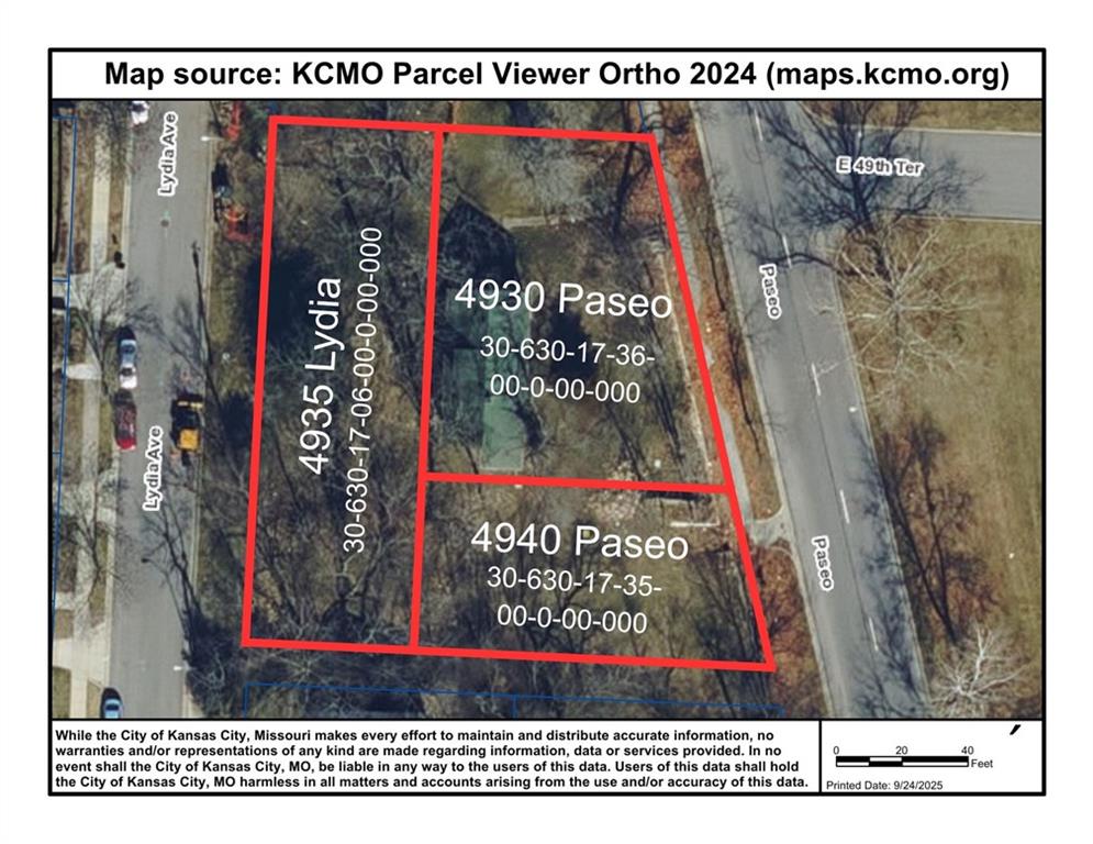 Investor/Developer Special – 3 Parcels Near UMKC & Hospitals! Rare chance to secure nearly ½ acre with dual frontage on Paseo & Lydia. Includes 4930 Paseo Blvd (house previously 3 bed/1 bath, now down to the studs and ready for full renovation), 4935 Lydia Ave (vacant residential lot), and 4940 Paseo Blvd (vacant residential lot). Minutes from UMKC, Rockhurst, the city’s medical district, Midtown, and the Plaza. Perfect opportunity for redevelopment, infill construction, or a long-term land hold in a high-demand location. Property sold as-is/in present condition; seller will make no repairs. Disclosure: Seller is a licensed MO real estate agent. Lot size and tax info per county records; deemed reliable but not guaranteed. Buyer/agent to verify all information including utilities, zoning, and condition.