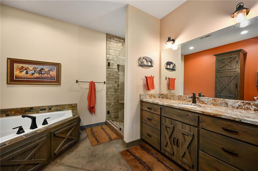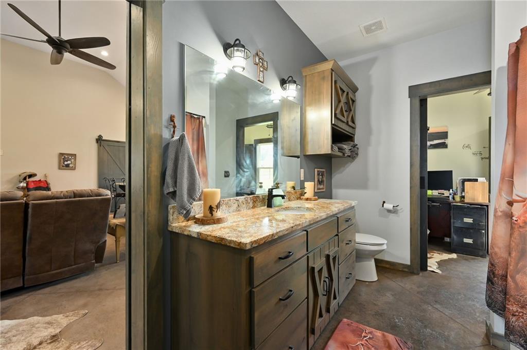 This gorgeous true ranch home on 10 acres offers the perfect blend of quiet country living and modern convenience. Only 4 years young, this home is completely move in ready. From the soaring vaulted ceilings, to the stunning concrete floors, to the impressive kitchen island and custom cabinets, there is so much to love here. Buyers will appreciate more features like walk in closets w/auto lights, the luxurious primary bath, spacious laundry/mud room w/pass through to the primary closet, a new wood burning stove for cozy winter nights, and plenty of natural light and serene views. Enjoy the tranquility and beauty this property has to offer from your covered front porch or covered back patio. Ready for your animals/livestock, the land is fully fenced and cross fenced, featuring a 30x40 metal barn (5 stalls + tack room), a 20x20 lean-to (new tin roof) and chicken coop/run. And with just a few minutes drive to 50 highway, the location is ideal for easy commutes to work or running errands in town. Make this your own little piece of countryside paradise today!