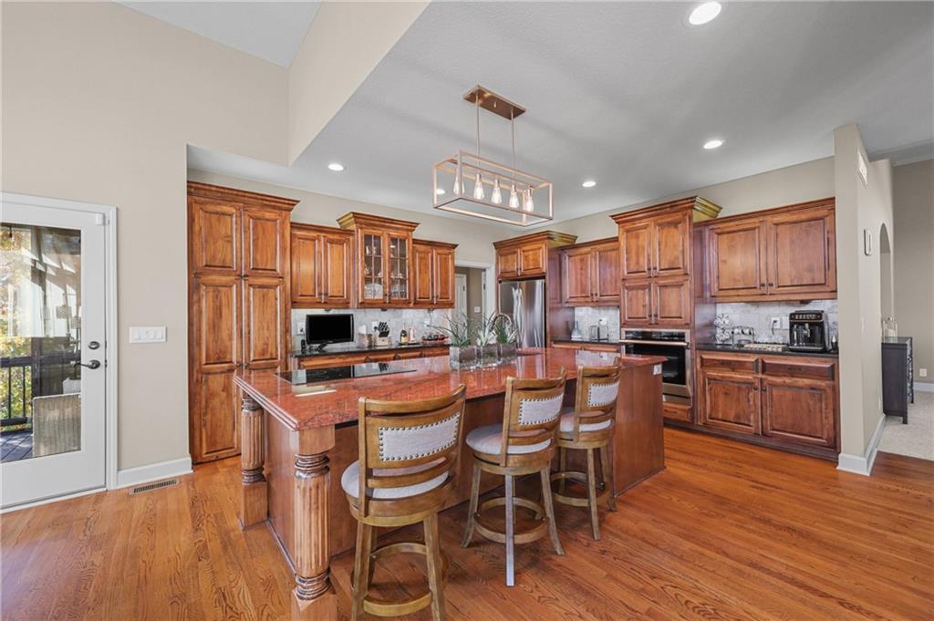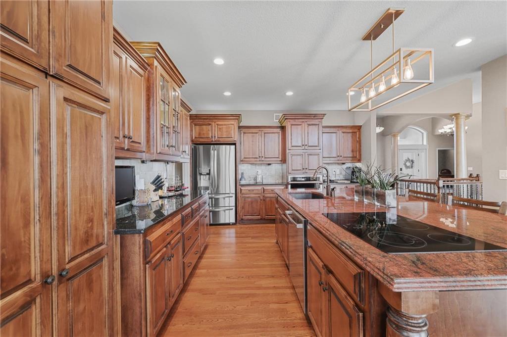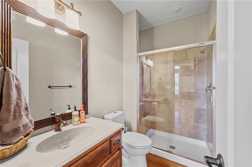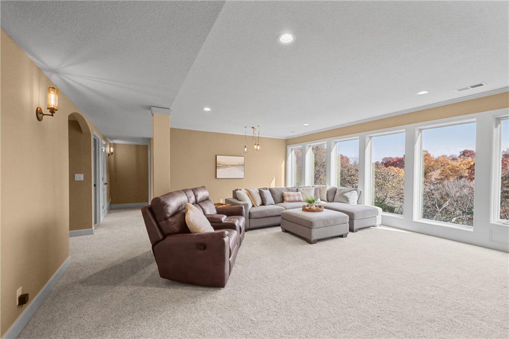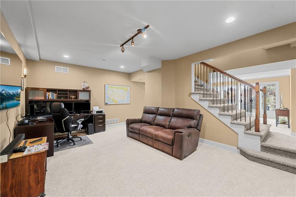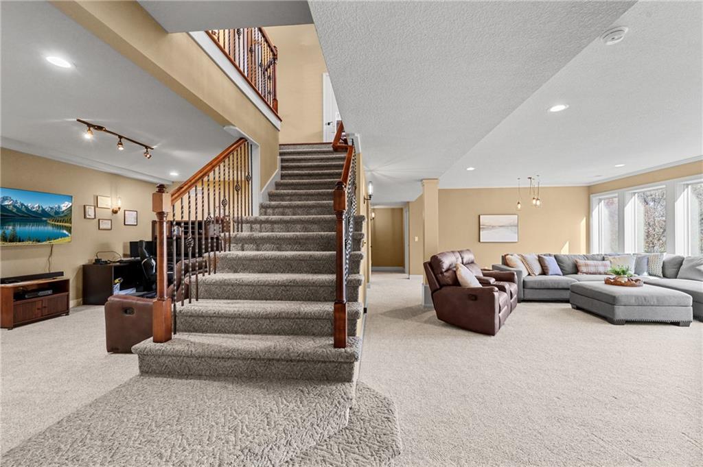 This stunning reverse 1.5-story home perfectly blends comfort, functionality, and privacy. The main level features an inviting open layout with a spacious great room that overlooks a beautiful backdrop of mature trees—with no neighbors behind. The chef’s kitchen is a dream, complete with a massive island, walk-in pantry, and abundant cabinetry—ideal for both entertaining and everyday living. The main-floor primary suite offers serene tree-lined views and a luxurious ensuite bath. A second main-floor bedroom—currently used as a home office—sits adjacent to a full bath, providing flexibility for guests or workspace needs. The walk-out lower level expands your living space with two additional bedrooms (one recently added by the homeowner), a full bath, and two generous family room areas perfect for gaming, media, or relaxation. Unique features abound, including a suspended garage with a fourth garage door, ideal for workshop space or extensive storage, and a large unfinished storage room—previously used by a former owner for a baking business—offering endless potential. Additional highlights include a new roof and gutters with a transferable warranty, electronic blinds in the main-floor great room and primary suite, and a peaceful, private setting surrounded by lush trees. This home truly offers the best of both worlds—modern functionality and quiet natural beauty.