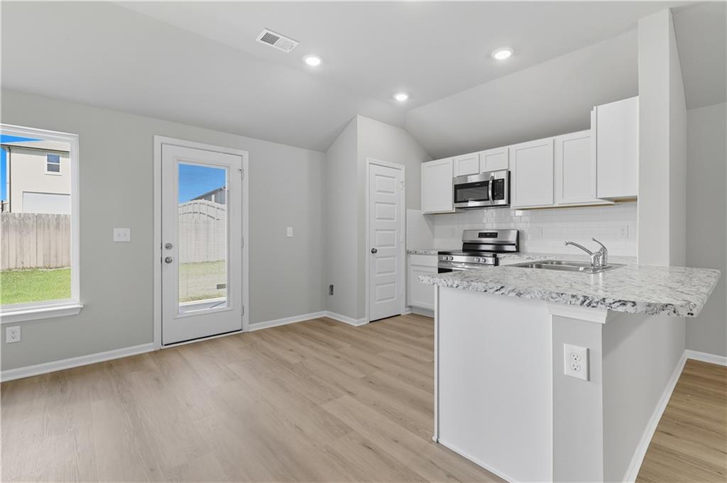 FULLY FENCED BACK YARD, REFRIDGERATOR AND BLINDS INCLUDED! Welcome to the Armstrong Plan – a thoughtfully designed 3-bedroom, 2-bathroom home built on a slab foundation with an attached 2-car garage. This open and functional floor plan is ideal for comfortable living and easy entertaining. Upon entry, you'll be greeted by a spacious living room that seamlessly flows into the peninsula-style kitchen, complete with seating and open access to the dining area. The layout provides a warm and inviting space perfect for gatherings or everyday living. Two bedrooms are conveniently located near the front of the home, adjacent to the second full bathroom—ideal for family, guests, or a home office setup. The private primary suite is situated at the rear of the home, offering a spacious retreat with a walk-in closet, double sinks, and a walk-in shower. With modern features, practical design, and quality craftsmanship, this home offers both comfort and convenience.