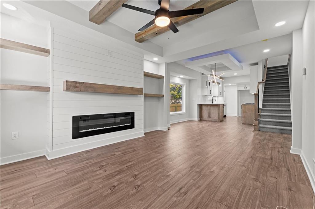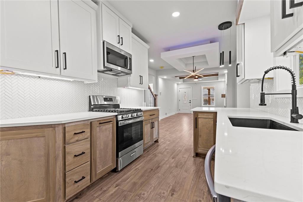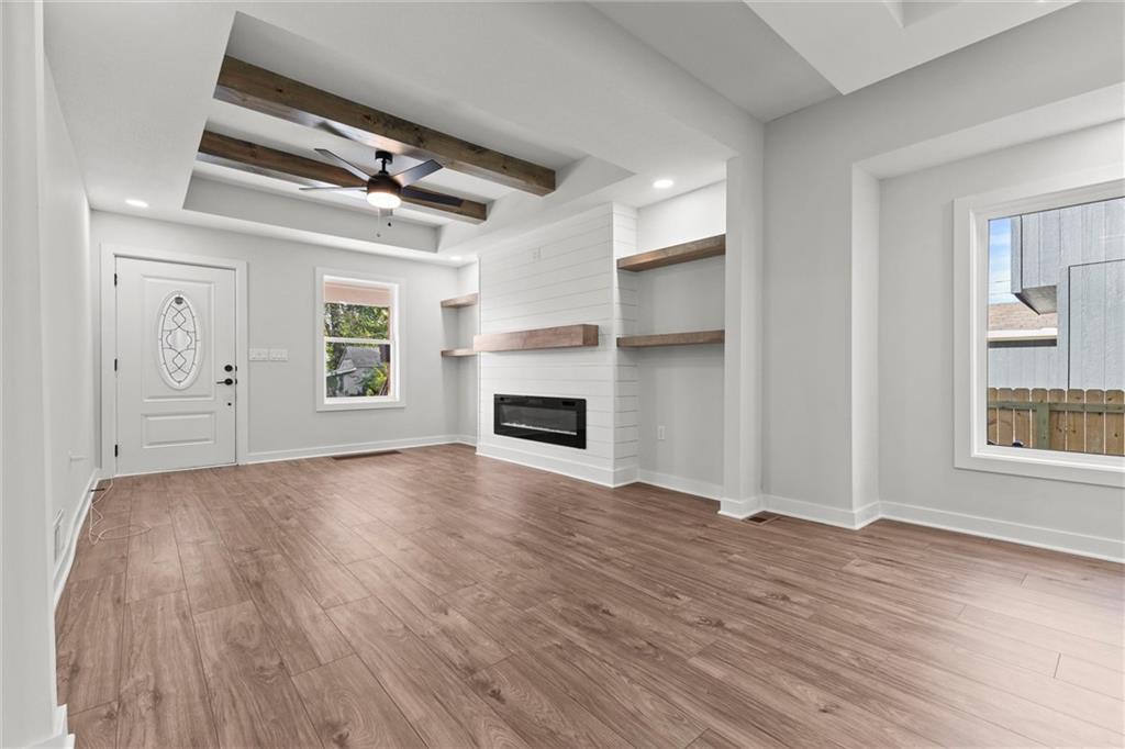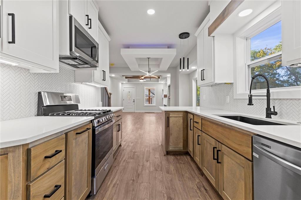 This stunning Kansas City, Kansas home has been completely remodeled from top to bottom — everything is new! Featuring a brand-new roof (6 months old), new gutters (1 month old), new siding, windows, electrical, and plumbing, no detail was overlooked. Step inside to an open and inviting layout with vaulted ceilings, beautiful LVL flooring, and custom craftsmanship throughout. The brand-new kitchen showcases custom cabinets, quartz countertops, a stylish tile backsplash, and all-new stainless steel appliances including a gas stove, dishwasher, and microwave. The bathroom has been fully updated with a sleek tiled shower and designer finishes. The living room features pine ceiling beams, floating maple shelves, a maple fireplace mantel, and shiplap accents that add warmth and character. Enjoy the outdoors with a new covered front porch featuring a metal roof, pine car siding trim on ceiling, and cedar support beams, plus an epoxy-coated front patio with new metal handrails. Upstairs has a spacious bedroom with walk-in closet. The new deck and 6-foot wood privacy fence make the backyard perfect for relaxing or entertaining. Additional upgrades include new sheetrock and insulation throughout, new carpet in the bedrooms, new maple stair handrails with iron spindles, new concrete flooring in the basement, and a new water heater. Located in Kansas City, Kansas, just minutes from Central Ave’s popular restaurants, highway access, and a short drive to downtown Kansas City — this home offers the perfect blend of modern comfort and convenience.