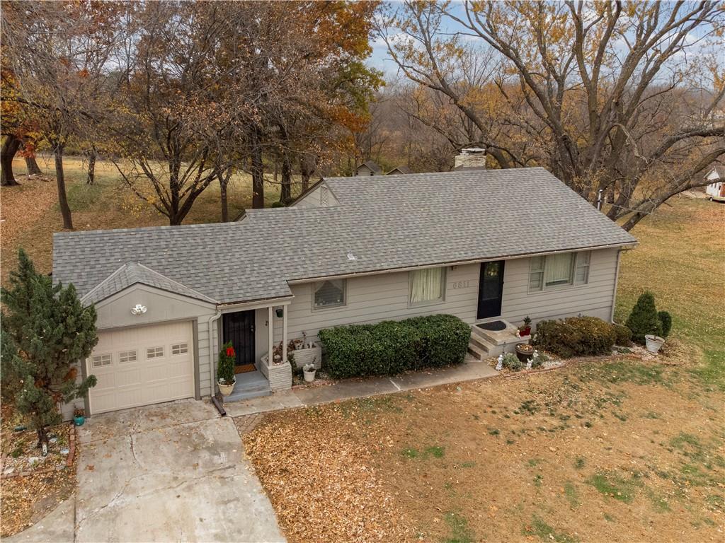 Charming, cheerful, and full of space—welcome to this 4-bedroom ranch on a rare .75-acre lot in Kansas City! Inside, you'll find a comfortable layout featuring 2 bedrooms and 1 bath on the main level. You’ll love the bright eat-in kitchen, easy-care wood throughout the main living space. The cutest enclosed breezeway connects the home to the attached 1-car garage, creating the perfect spot for a mudroom, lounge area, or plant haven. The finished walk-out basement adds fantastic extra living space with 2 more bedrooms and a cozy hangout area—with direct access to your huge backyard. Step outside to two inviting patios, including a charming brick patio ideal for relaxing or entertaining. At the back of the sprawling yard, you’ll find two sheds perfectly positioned for storage, keeping tools, lawn gear, and hobbies tucked neatly out of the way. With room to garden, play, or just enjoy the peaceful setting, this home offers space to live your lifestyle. Fun, functional, and move-in ready—don’t miss this KC gem!