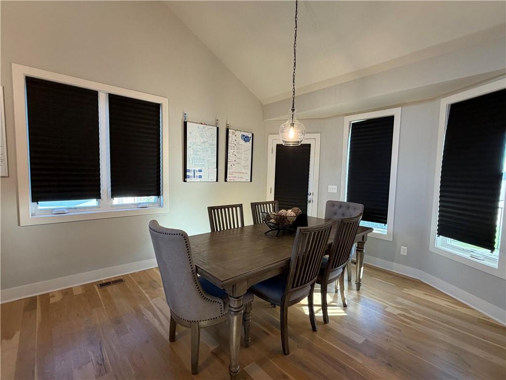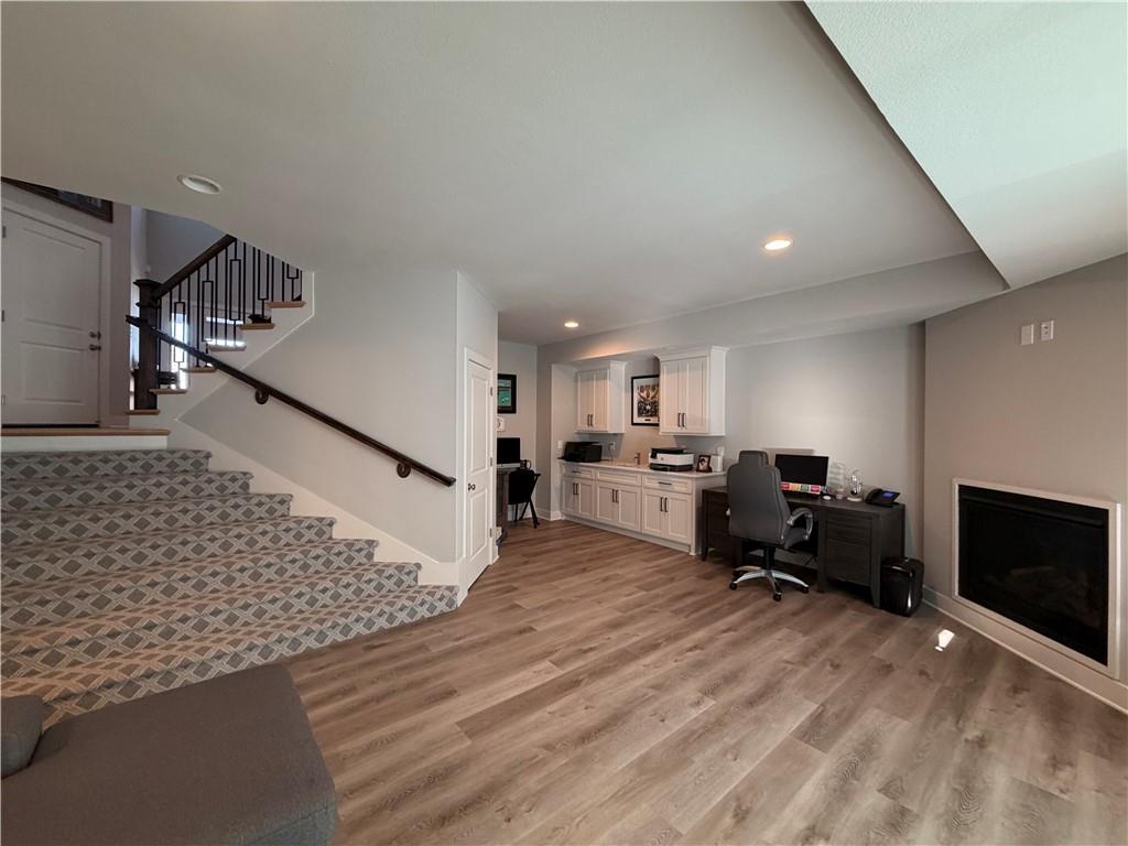 A rare opportunity for refined living across from Lake Lenexa. This well maintained residence boasts dramatic vaulted ceilings and an architecturally stimulating, open-concept floorplan, bathed in natural light from all of the windows. The interior features a sophisticated, dedicated-floor primary suite. This private level includes an unbelievable walk-in closet and an elegant private bath with a double vanity and sleek, tiled shower. Two separate fireplaces—a cozy hearth adjacent to the kitchen/dining area and a second in the spacious lower level—ensure warmth and ambiance throughout. Pristine and move-in ready, this home offers a unique blend of privacy, light, and unparalleled access to the Lake Lenexa & Blackhoof Park.