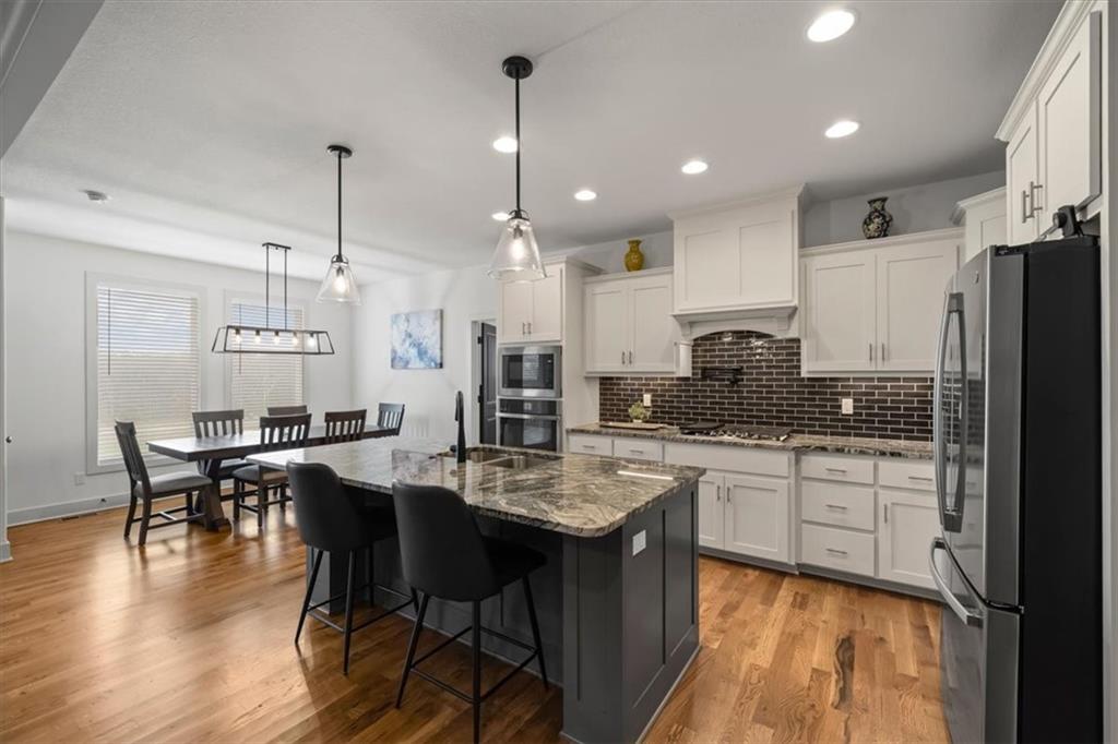 Stunning Reverse One-and-a-Half Home with Premium Upgrades Main Level Features This impeccably and lovingly maintained reverse one-and-a-half home showcases a wealth of upgrades throughout the main level. Step onto the stupendously large front porch, perfect for leisure and gazing at the surroundings. Inside, sunlight pours into the foyer, which towers above beautifully maintained hardwood floors found throughout the main living areas. All bedrooms are equipped with walk-in closets, providing ample storage space. One of the bedrooms offers flexibility and can be used as a home office. The open concept living room and dining room create a relaxing atmosphere, seamlessly connected to a screened deck that overlooks a tranquil nature reserve and trail. The kitchen features upgraded countertops and throughout, complemented by abundant cabinetry, stainless steel appliances, and a convenient pot filler. A vent hood is designed for outside ventilation, enhancing the kitchen's functionality and appeal. Lower Level Amenities Descending to the walk-out basement, you will find a spacious family room and a wet bar, ideal for entertaining. The ground-level patio extends the living space outdoors. Two bedrooms serviced by a jack -in-Jill bathroom for added convenience, and built-in bookcases. The additional fully finished recreational room offers versatility, that is adjacent to a separate finished gym and a storage room. There is also a partially finished storm shelter adjacent to another partially finished storage room for added utility. Outdoor Space The property is complemented by a large backyard, perfect for relaxation, play, or enjoying the natural surroundings.