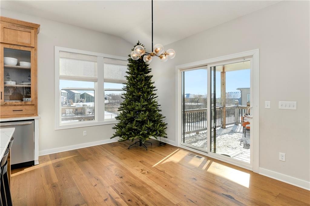Immaculate 2-year-old Reverse Ranch on a premium corner lot featuring a modern open layout, upgraded finishes, and exceptional indoor/outdoor living spaces. This former model home showcases a spacious great room with floor-to-ceiling stone fireplace, large windows for abundant natural light, and engineered hardwood floors throughout the main living areas. The designer kitchen includes quartz countertops, large center island w/ seating, upgraded trim, Gas Range w/Convection, pot-filler, stainless appliances, farmhouse sink, brushed brass fixtures, glass-door display cabinetry, and subway tile backsplash. The dining area flows seamlessly to the covered deck overlooking the fenced backyard. The primary suite offers a tray ceiling with wood plank detail, large windows, and a spa-inspired bath with dual quartz vanities, upgraded lighting, a walk-in tile shower with bench, herringbone accent wall, and matte black fixtures. The oversized walk-in closet connects conveniently to the laundry and mudroom w/ built-in drop zone. Additional main-level bedrooms include upgraded lighting & modern wall accents along with attractive wood finishes in the vanity and matching mirror. A second full bath features contemporary vertical tile and updated finishes. The finished lower level provides a generous second living area with recessed lighting, plush carpet, & a wet bar with custom backsplash. Additional bedroom & full bath offer flexibility for guests or extended living arrangements. The unfinished portion is plentiful too, providing value add for future finished space or great storage as it sits. Outdoor features include a covered deck, fully fenced yard with wrought iron fencing, and ample space for recreation. The climate-controlled garage is ideal for storage, hobbies, or year-round comfort. Additional upgrades include premium lighting throughout, wainscoting and trim accents, energy-efficient windows, & a clean modern color palette. Move-in ready and well maintained.