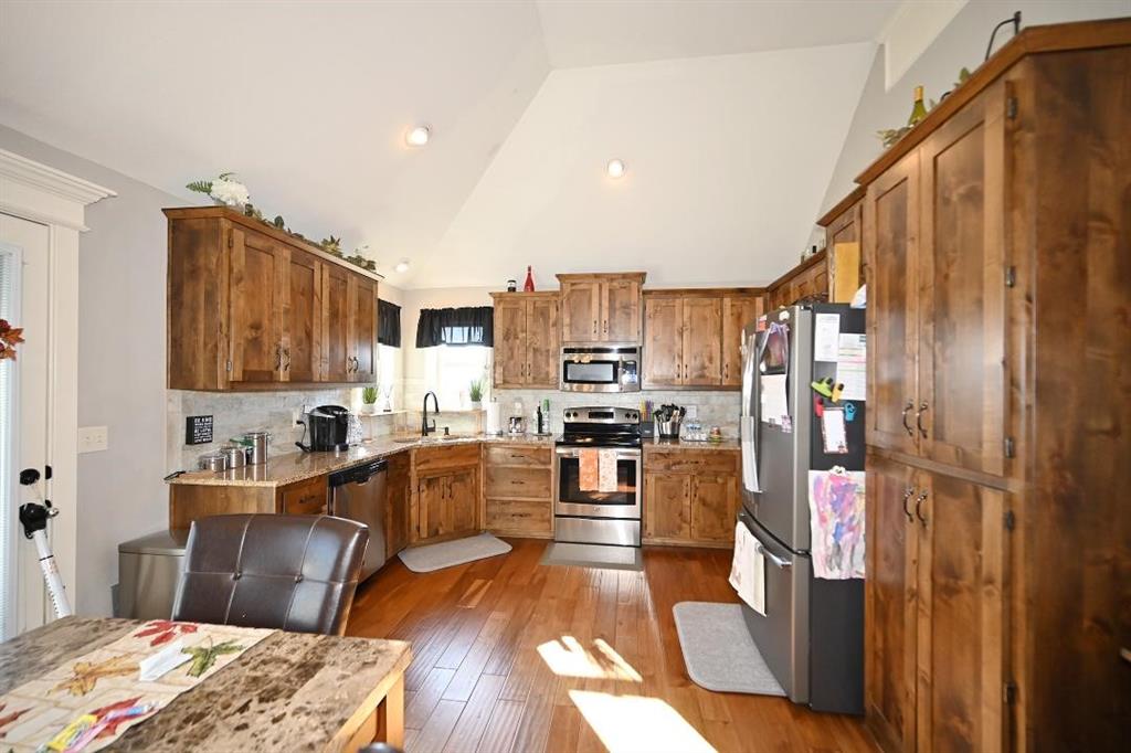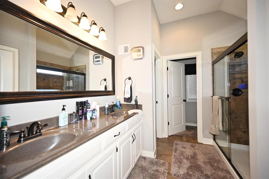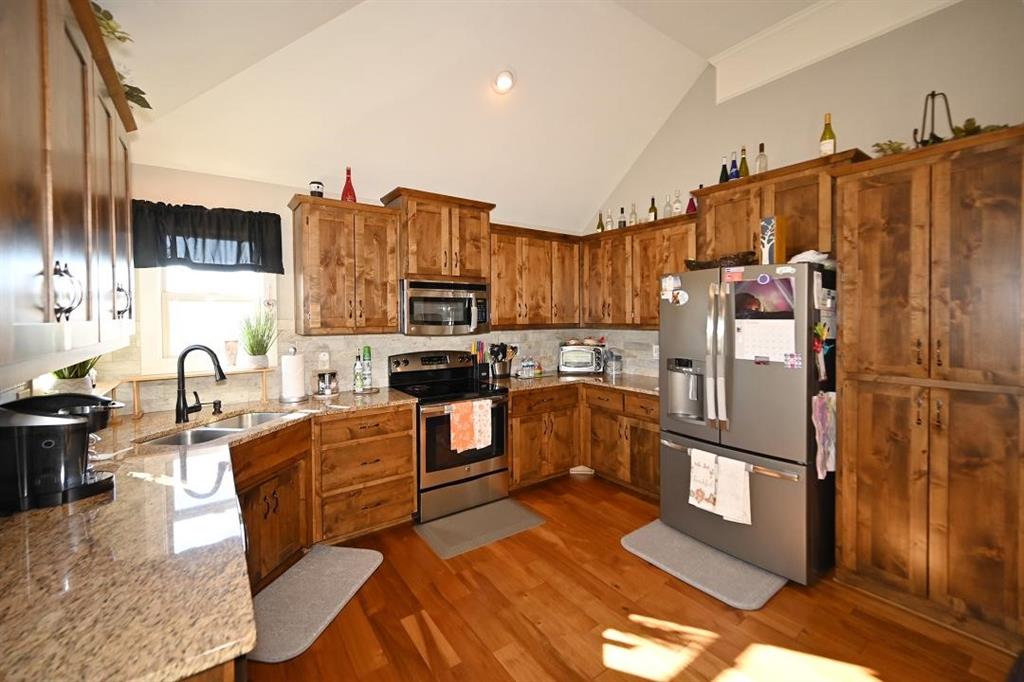 This home features an oversized three-car garage with a dedicated storage room. The lower level offers a beautiful, spacious family room, a full bathroom, and a large bedroom. On the main level, you’ll find gorgeous hardwood floors throughout, a stunning stone fireplace, an open dining area, and a kitchen with abundant cabinetry and granite countertops. The main-level laundry room adds convenience, and there is also a full guest bathroom. This level includes two additional bedrooms and a large master bedroom with carpet. The master bathroom features a dual vanity, a walk-in shower, and a walk-in closet and additional closet space. Outside, the property offers a large backyard and a covered deck perfect for relaxing or entertaining.