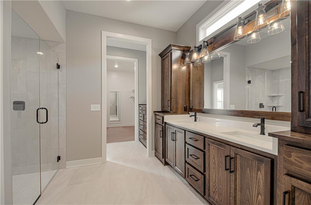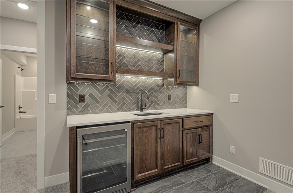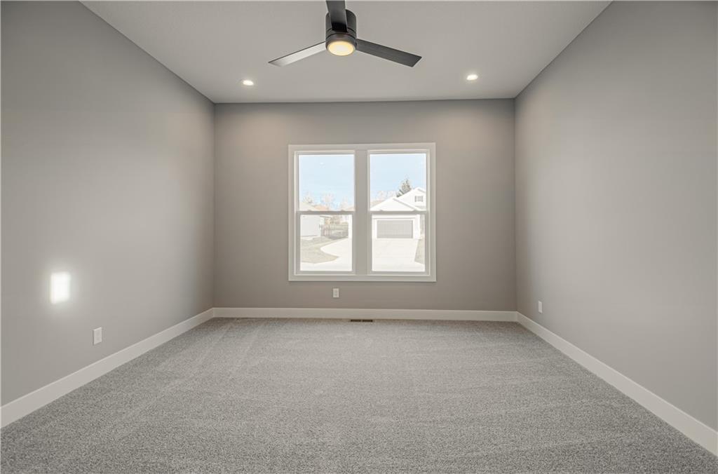 Ready February 2026! This stunning Maintenance Provided Sonoma Reverse 1.5 floorplan sits on a desirable corner lot and offers two primary suites on the main level, each with a private ensuite. The main suite features a zero-entry shower and a large walk-in closet with custom shelving and a built-in dresser, plus convenient access to the laundry room. A stylish powder room and mudroom complete the main level. The gorgeous kitchen offers abundant storage and counter space and flows seamlessly into the dining area and great room, where 10-foot ceilings, a floor-to-ceiling stone fireplace, and a decorative coffered ceiling create an impressive centerpiece. The lower level includes an oversized rec room, modern wet bar, two generous bedrooms, a full bath, and 500+ sq ft of unfinished space—ideal for a gym or extra storage. Enjoy a peaceful backyard and numerous upgrades: high-efficiency furnace, upgraded GE dishwasher, under-cabinet lighting, low-maintenance Trex deck, upgraded lighting and carpet, and durable Revwood laminate flooring. Garage door openers included. Located in the Maintenance Provided section of Kensington Farms, homeowners enjoy weekly lawn mowing, a 6-step fertilizer program, annual grub treatment, spring re-mulch and cleanup, and snow removal of 2"+ for just $160/month. Neighborhood amenities include a pool, playground, and greenspace, all close to Downtown Lee’s Summit, Summit Fair, dining, and shopping