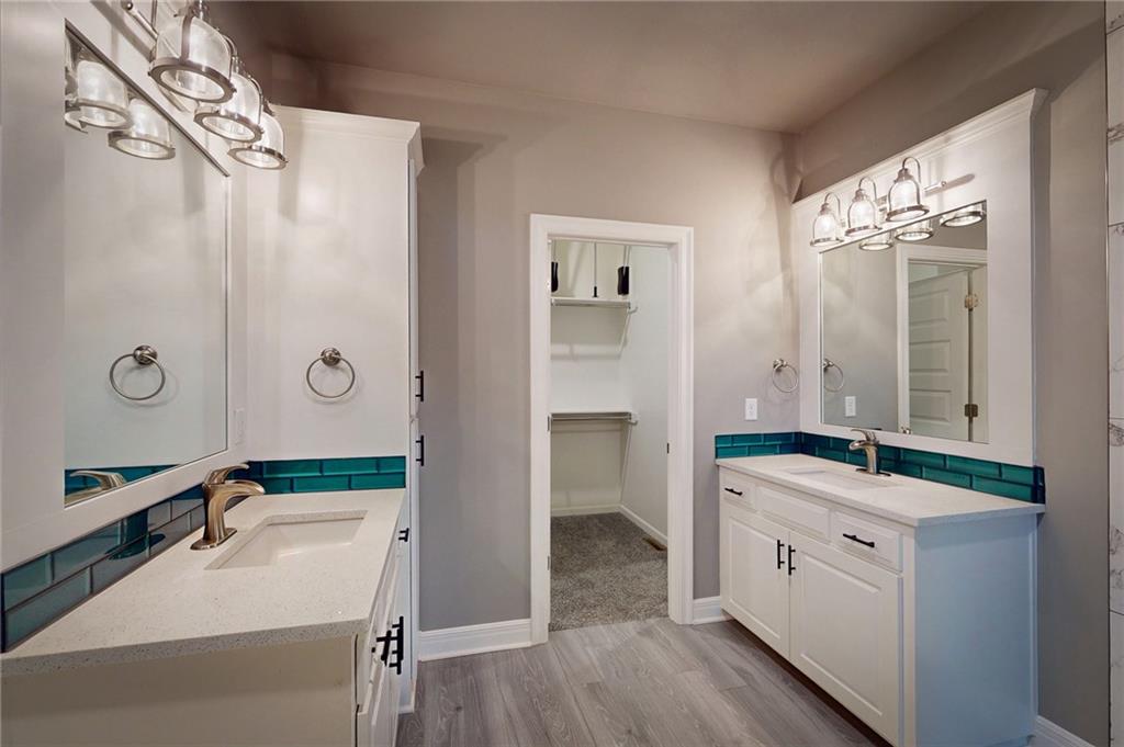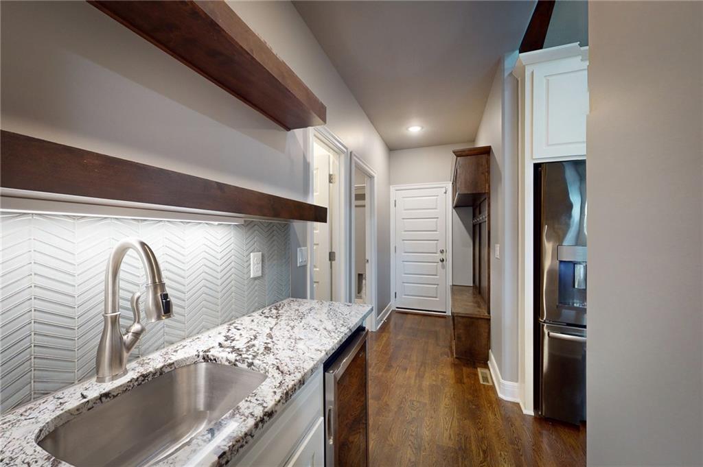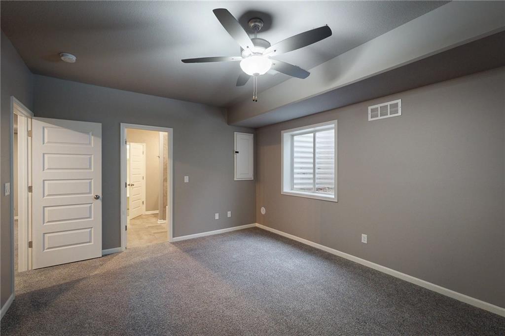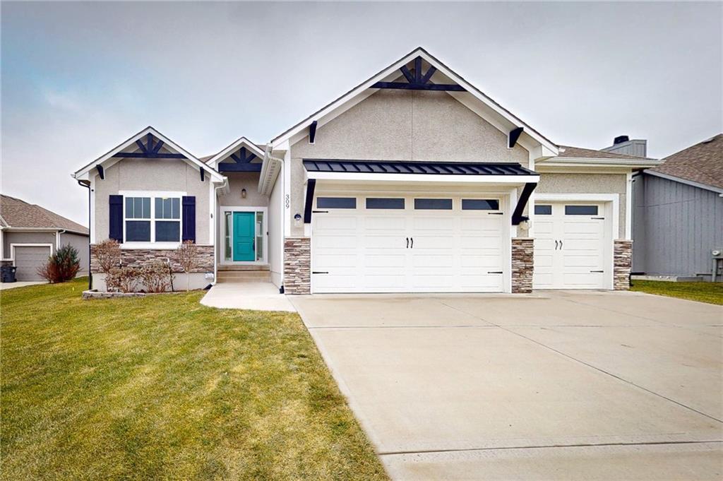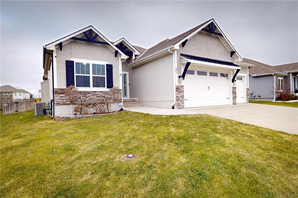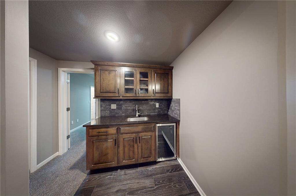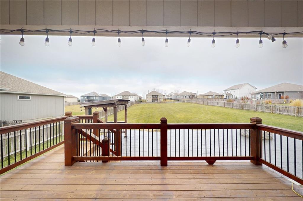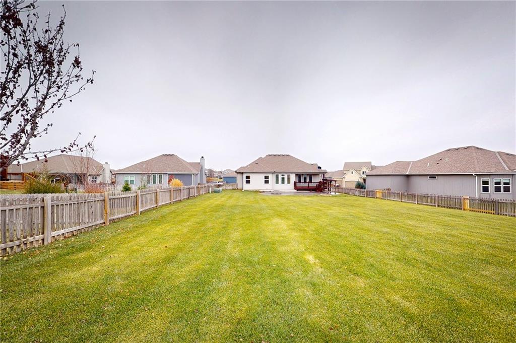 This beautiful Trumark Home - The Marie II is a Reverse 1.5-story / Ranch. This home is move-in ready and only 6 years young! Featuring 4 bedrooms, 3.5 baths, and a 3-car spacious garage, this property sits on nearly half an acre—one of the largest lots in the neighborhood—complete with a fenced backyard. Step inside to an open, high ceiling, inviting floor plan with a spacious living room that flows seamlessly into the dining area and kitchen. The kitchen offers granite countertops, ample cabinetry, a walk in pantry AND a butler’s pantry with a wine fridge for added convenience. The main-level Primary Suite includes a large walk-in closet with pulldowns connected to the laundry room, plus a gorgeous en-suite bath with quartz countertops. A second main-level bedroom adds versatility for guests or office space. The finished lower level expands your living space with a generous family room and wet bar, along with Bedroom #3 featuring a private full bath, and Bedroom #4 with an attached half bath. A storm shelter provides peace of mind. Outdoor living shines with an oversized stamped patio, built-in firepit, and a grill gazebo that stays. The back quarter of the yard is home to multiple garden areas with strawberries and blueberry bushes, and a 6-zone sprinkler system keeps everything lush and green.
