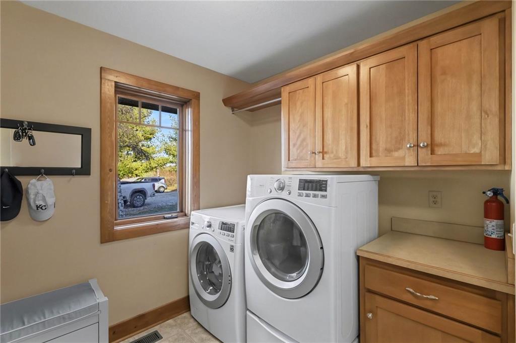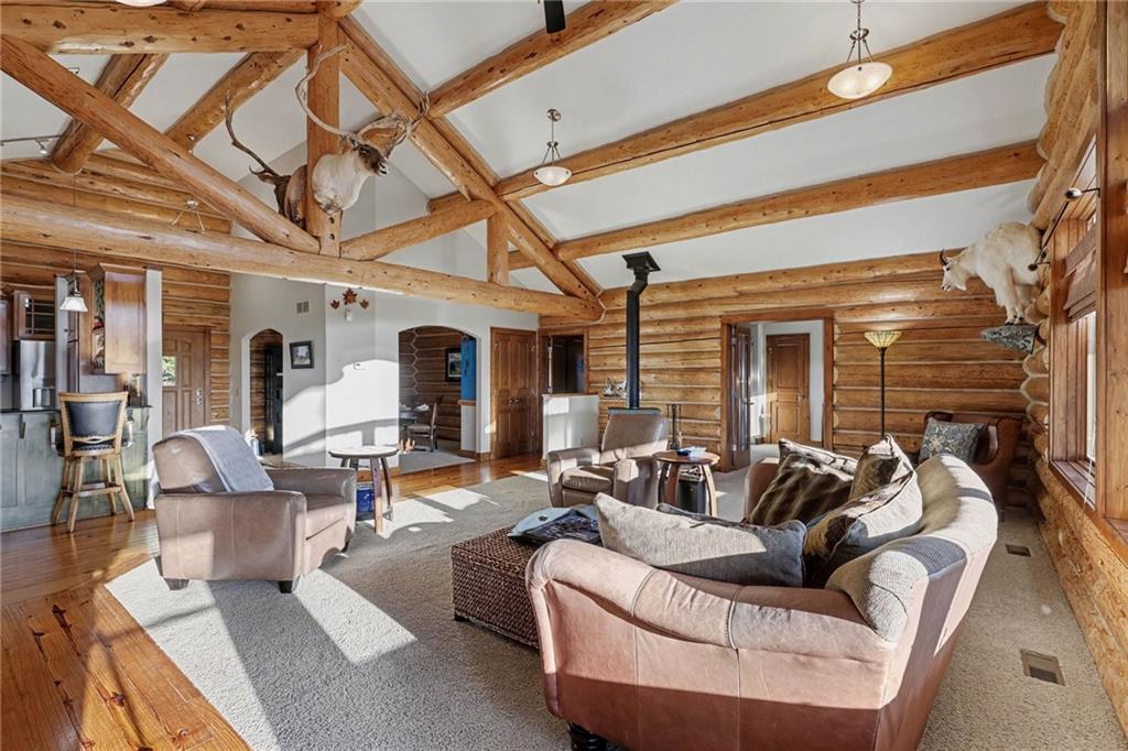 Tucked away on 23 breathtaking acres, this 3,162 sq. ft. Craftsman ranch–style custom log home offers a rare blend of thoughtful design, and unmatched natural surroundings. Built in 2003 and lovingly maintained by its original owners, the home showcases full-round log construction in the central living areas, featuring exposed log trusses, open doorways, and a striking Palladian-style arched picture window that fills the space with natural light. Covered front and back porches invite you to relax and take in the peaceful setting, while cedar-sided, stick-built wings balance beauty with functionality. The main level is designed for effortless living, offering a spacious kitchen, living and dining areas, a walk-in pantry, and custom cabinetry and built-ins throughout. The primary suite includes a full bathroom and a walk-in closet. Two additional bedrooms, a second full bath, multiple linen closets, and a convenient laundry/mudroom are also on this main level. The finished walkout basement expands the living space with a fourth bedroom, third full bathroom, open living/game room, bar, safe room, and abundant storage—including a large utility room and under-stair storage. Comfort and efficiency in the home are enhanced by central air, a heat pump with propane backup, a wood stove fireplace, a radon mitigation system, and high-speed fiber internet. Outdoors, the property is equally impressive with an attached extra deep two-car garage, concrete driveway and patio, 42’ x 64’ shop/barn with a 12-foot door, circular gravel drive, garden shed, raised garden beds, and a landscaped backyard bonfire ring. Crafted from dead-standing pine and fir timber sourced from Wyoming, this one-of-a-kind home is perfectly positioned on a paved, lightly traveled road just one mile from Smithville Lake’s Mecca Access and boat ramp—offering true country living without gravel roads. The acreage borders U.S. Corps of Engineers land along Smithville Lake, ensuring privacy and protected views.