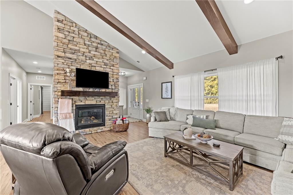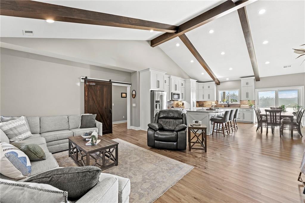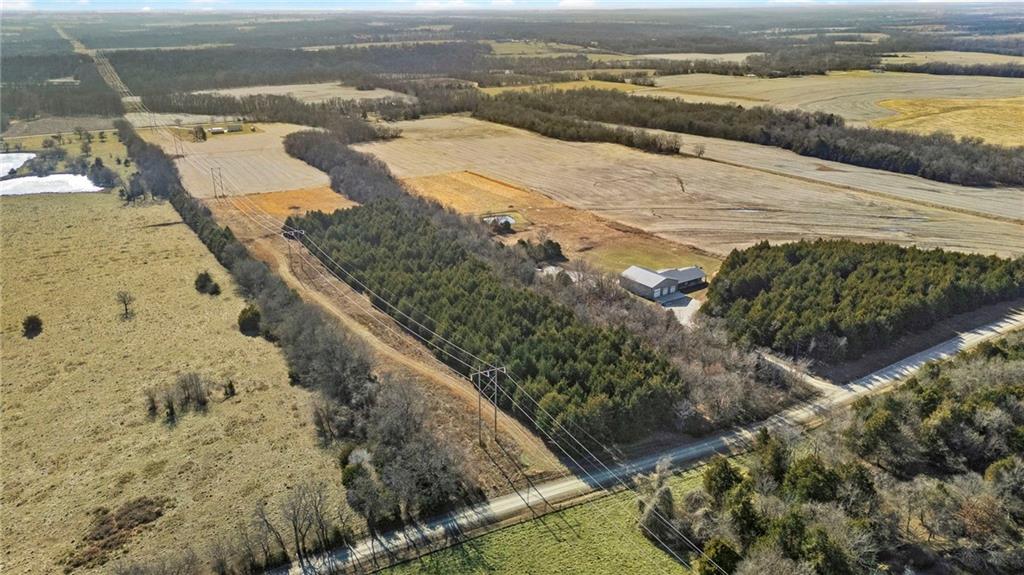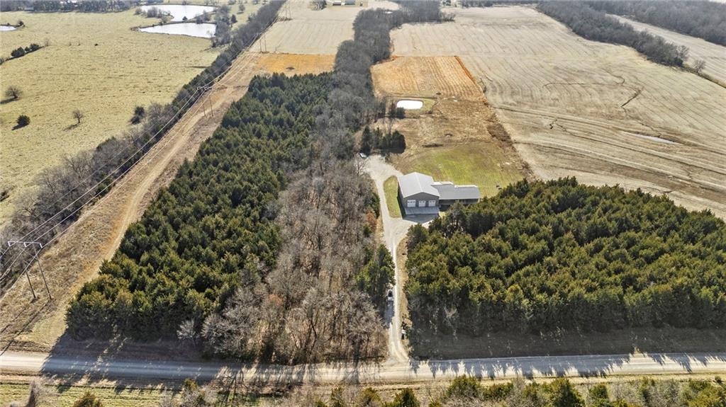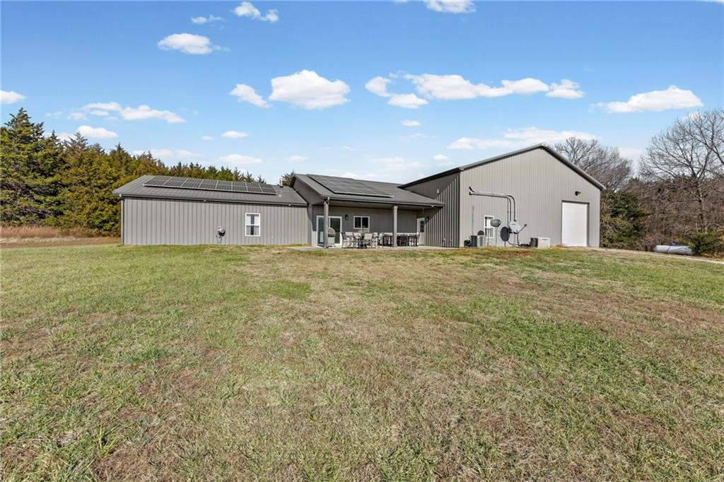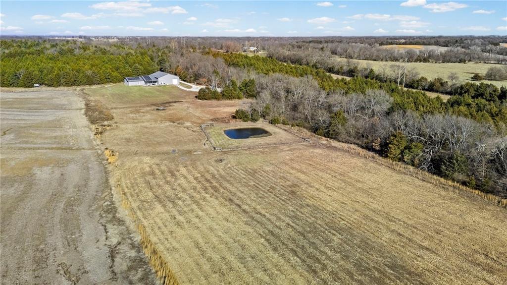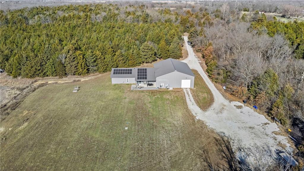 This absolutely stunning, custom-built 2021 barndominium offers the ultimate in secluded luxury across 20+ acres of gorgeous timber and pasture, greeting you with a sprawling covered porch perfect for taking in the abundant local wildlife. The interior showcases the finest craftsmanship through an open-concept layout defined by soaring ceilings, luxury vinyl flooring, and expansive walls of windows that flood the home with natural light. At the heart of the residence sits a gourmet kitchen featuring granite countertops, a massive island, custom cabinetry with pull-out drawers, and a 9x8 walk-in pantry with outlets, all flowing seamlessly into a dining area and a great room anchored by a cozy rock gas fireplace. Practicality meets style in the spacious mudroom, flanked by a dedicated laundry area and a convenient half bath, while the private primary suite serves as a true retreat with its tiled shower, deep soaker tub, and walk-in closet. Two additional generous bedrooms and a full bath provide ample space for family or guests, while a fully concrete 10 x 10 safe room ensures peace of mind. The home's technical specifications are equally impressive, featuring a sophisticated solar energy system supported by a propane gas generator and battery storage for total self-sufficiency. Covered back patio, great for entertaining. Completing this exceptional property is a 50x64, fully insulated, and sheet rocked garage/shop equipped with 200 AMP service, three overhead doors, an exit door, and dedicated attic storage—all situated on a prime piece of land ideal for hunting, farming, or recreation.