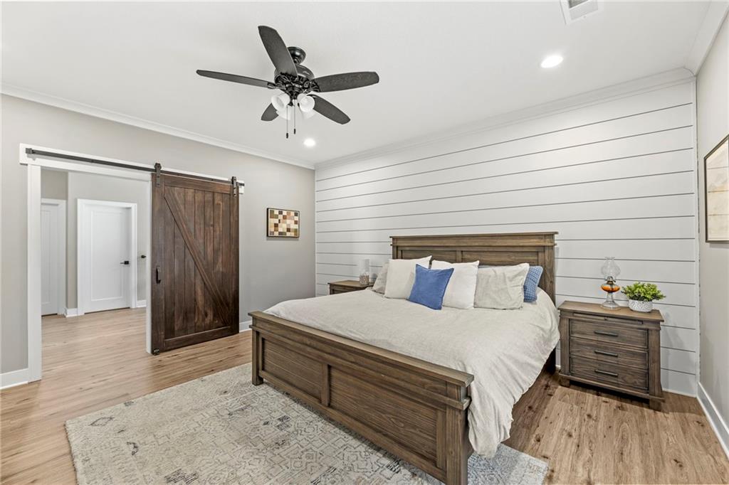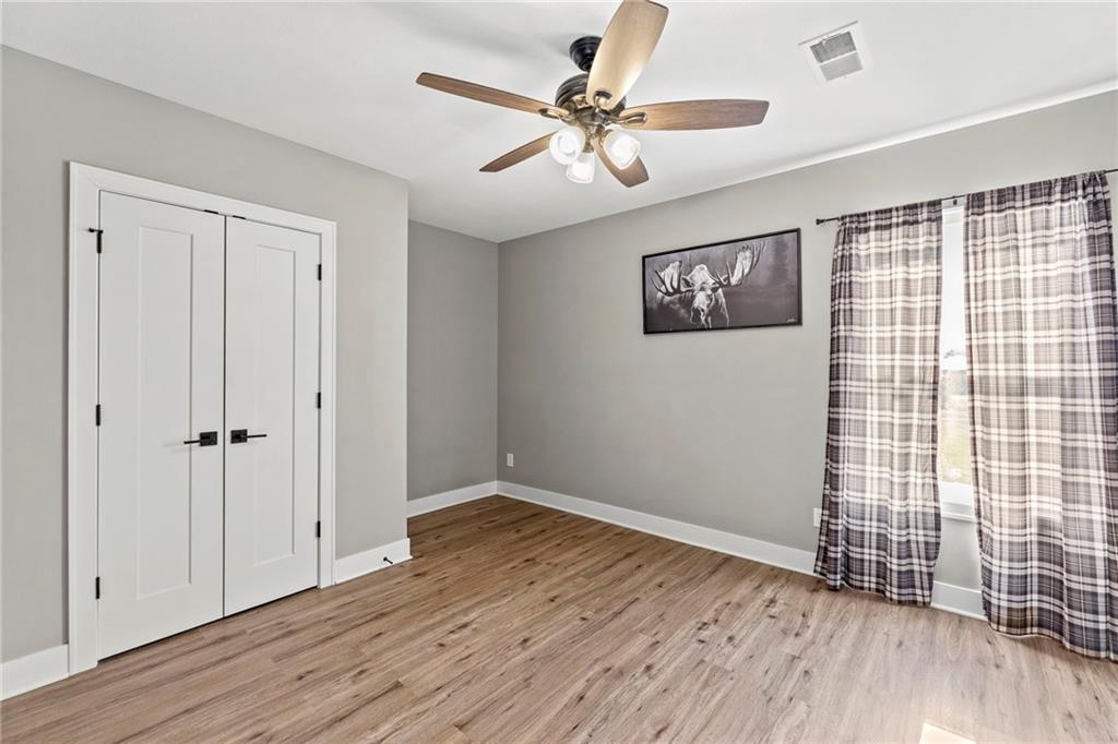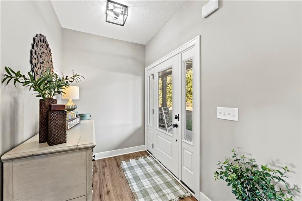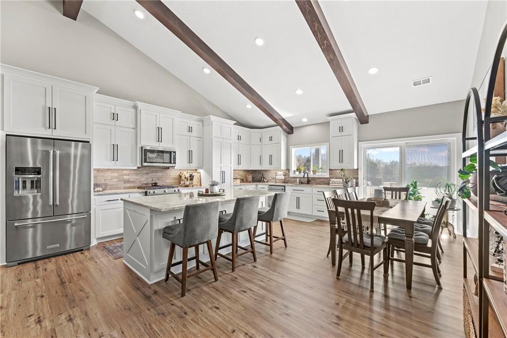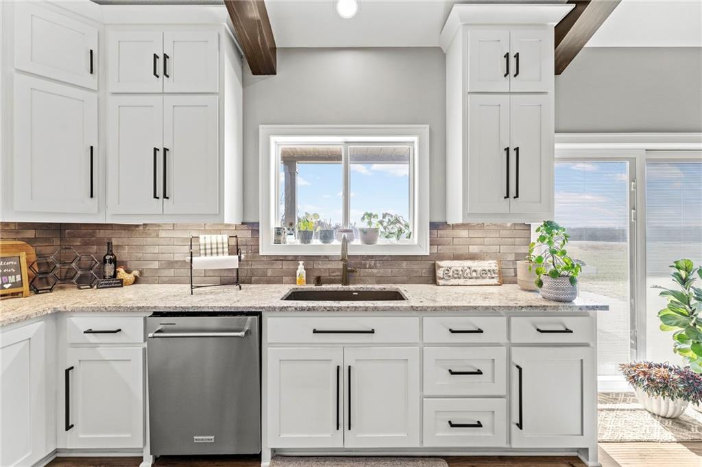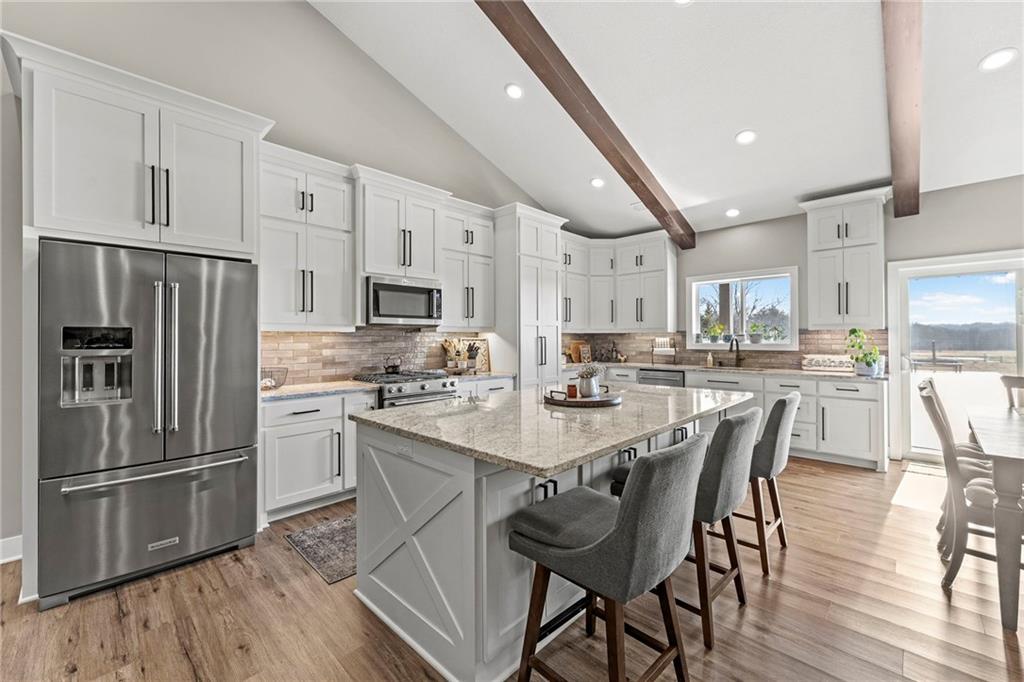 This absolutely stunning, custom-built 2021 barndominium offers the ultimate in secluded luxury across 20+ acres of gorgeous timber and pasture, greeting you with a sprawling covered porch perfect for taking in the abundant local wildlife. The interior showcases the finest craftsmanship through an open-concept layout defined by soaring ceilings, luxury vinyl flooring, and expansive walls of windows that flood the home with natural light. At the heart of the residence sits a gourmet kitchen featuring granite countertops, a massive island, custom cabinetry with pull-out drawers, and a 9x8 walk-in pantry with outlets, all flowing seamlessly into a dining area and a great room anchored by a cozy rock gas fireplace. Practicality meets style in the spacious mudroom, flanked by a dedicated laundry area and a convenient half bath, while the private primary suite serves as a true retreat with its tiled shower, deep soaker tub, and walk-in closet. Two additional generous bedrooms and a full bath provide ample space for family or guests, while a fully concrete 10 x 10 safe room ensures peace of mind. The home's technical specifications are equally impressive, featuring a sophisticated solar energy system supported by a propane gas generator and battery storage for total self-sufficiency. Covered back patio, great for entertaining. Completing this exceptional property is a 50x64, fully insulated, and sheet rocked garage/shop equipped with 200 AMP service, three overhead doors, an exit door, and dedicated attic storage—all situated on a prime piece of land ideal for hunting, farming, or recreation.