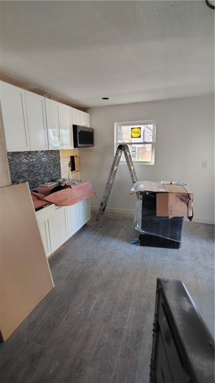 Kitchen featuring tasteful backsplash, white cabinets, dark wood-style floors, and stainless steel microwave