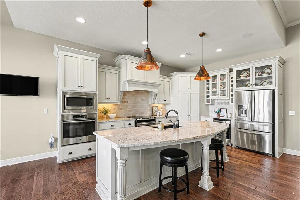 Welcome to 9158 W 178th Terrace, a beautifully maintained Emery Expanded 1.5-story home by James Engle Custom Homes, located on a quiet lot with pond views in the desirable Arbor View subdivision. This elegant home offers 6 bedrooms, 4.5 baths, and a 3-car garage, with an open, light-filled layout and upscale finishes throughout. The gourmet kitchen features granite countertops, a large island, stainless steel appliances, and a walk-in pantry. The main level includes a private primary suite with a spa-like bath and direct access to the laundry room, plus a flexible bedroom or office. Enjoy outdoor living on the covered patio with a fireplace overlooking the beautifully landscaped yard. Upstairs offers spacious bedrooms and a loft, while the finished lower level includes a recreation area, a sixth bedroom with egress, a full bath, and ample storage. Premium upgrades, including trim work, whole-home audio, and landscaping, make this move-in-ready home a must-see in prime Overland Park!