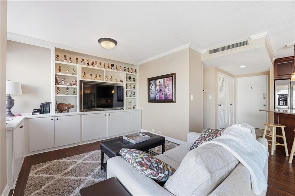 Enjoy sweeping views of the Plaza skyline from your private balcony, living room, kitchen, and bedroom. This exquisitely remodeled Plaza condo boasts an open floor plan, complemented by rich wood flooring and custom cabinetry throughout. The thoughtfully designed kitchen maximizes space with a functional island offering built-in storage, indirect lighting, a pantry, and more. The updated bathroom includes a walk-in shower and a tall vanity. The oversized primary bedroom offers a double lighted ceiling fan and a spacious walk-in closet. Recent building improvements include a community room and patio, elevators, temperature-controlled garages, balconies, roof, HVAC systems, and more. Owners are only responsible for the internet (Google Fiber–wired building), cable, and electricity. A temperature-controlled garage spot is offered to every owner at an additional cost. Schedule your showing today and discover all this building has to offer.